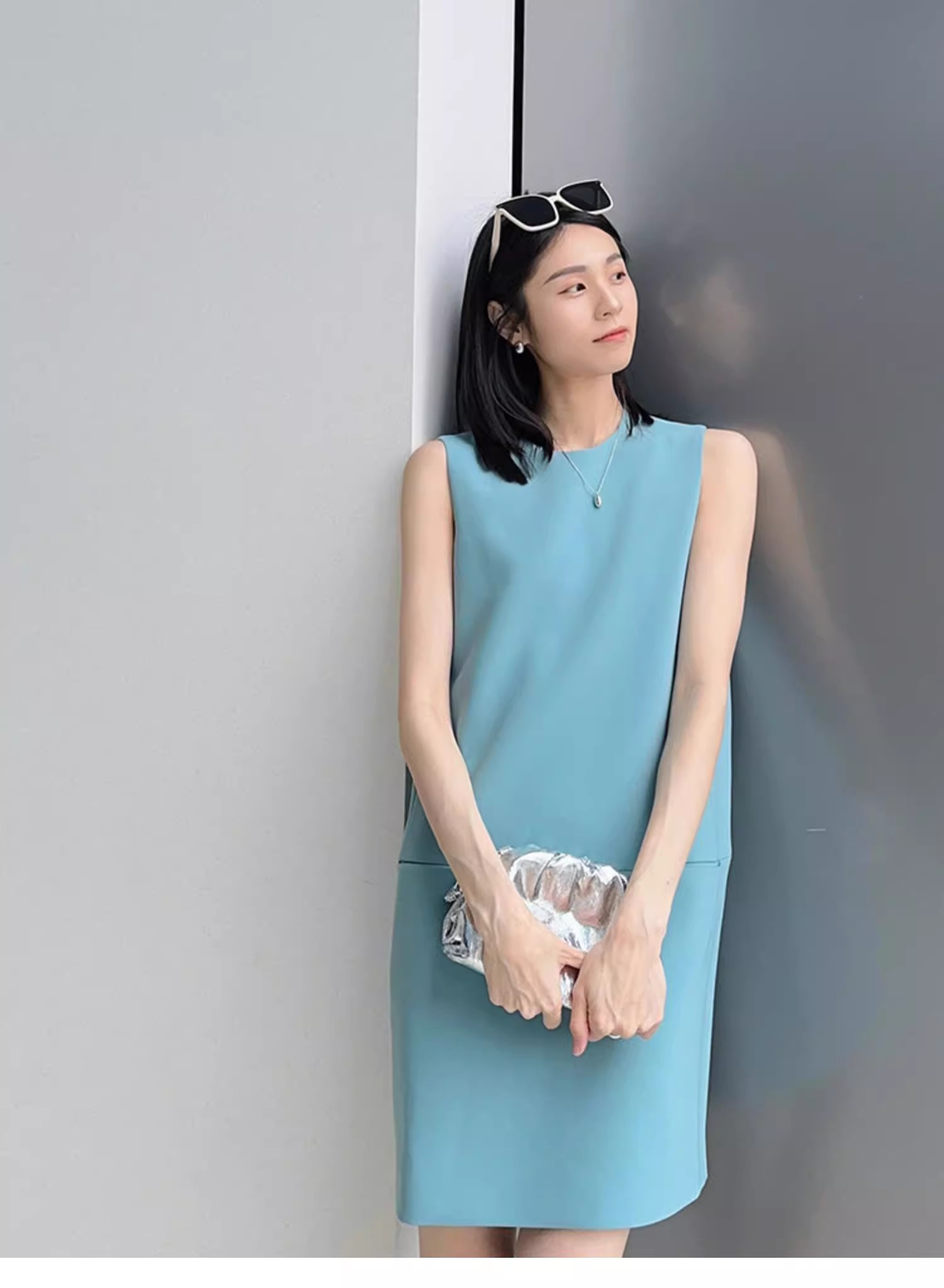 단색 라운드 넥 민소매 루즈핏 캐주얼 드레스