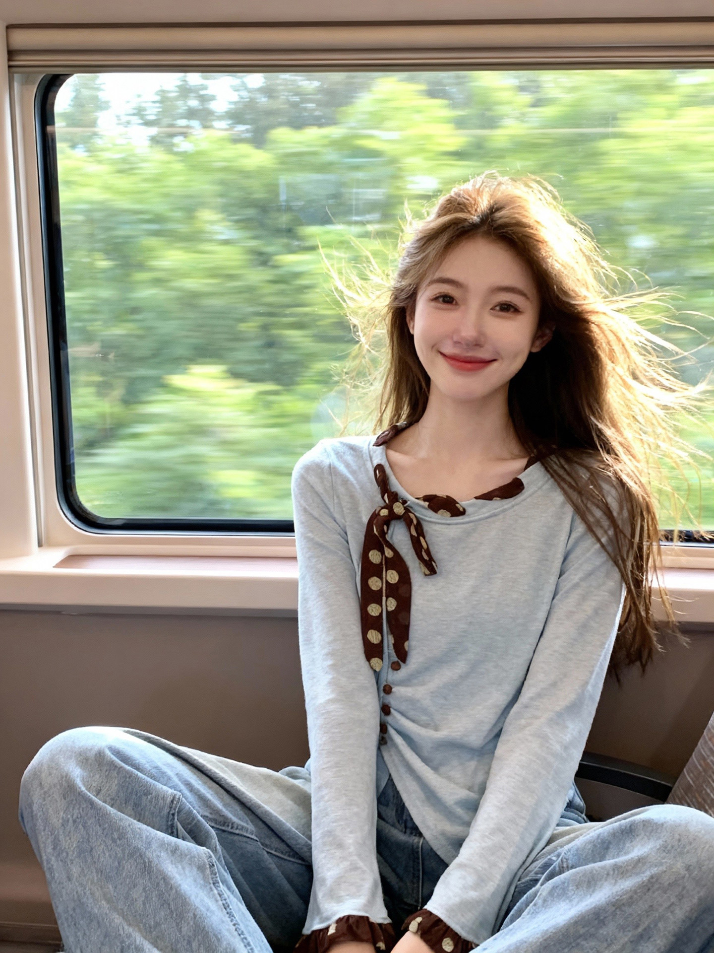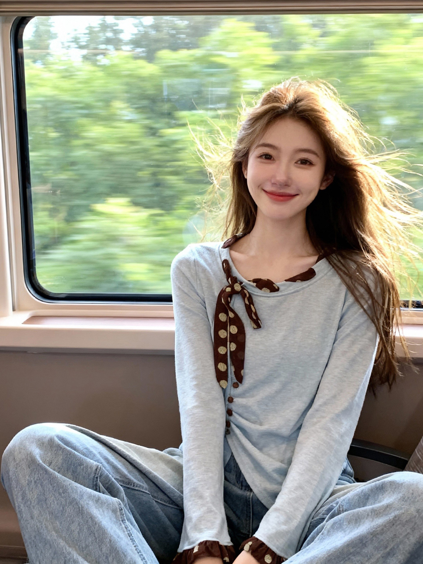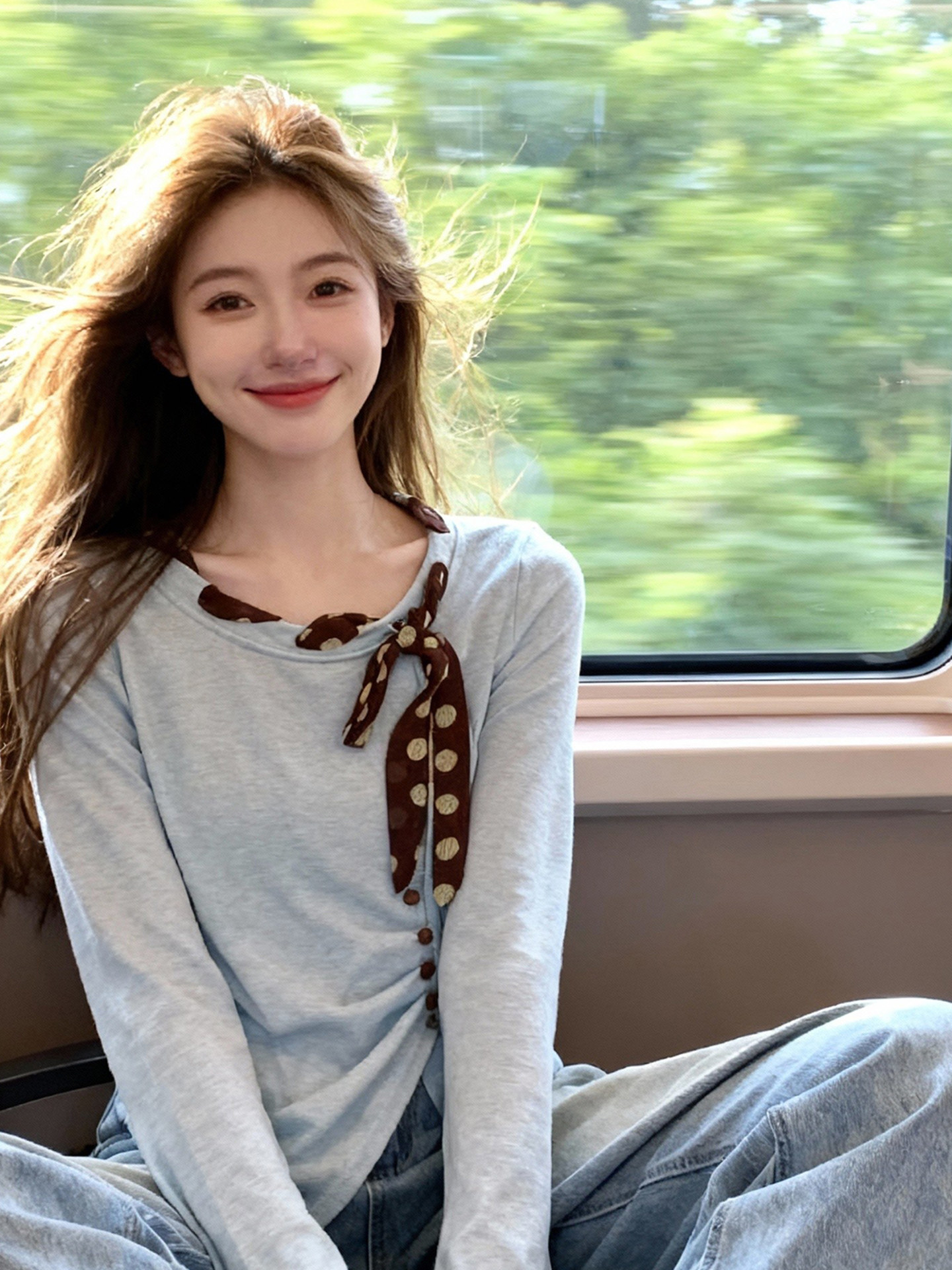 하늘색 배색 리본 티셔츠 여성 봄 새로운 도트 무늬 나비 매듭 장식 루즈핏 슬림해 보이는 캐주얼 긴팔 맨위