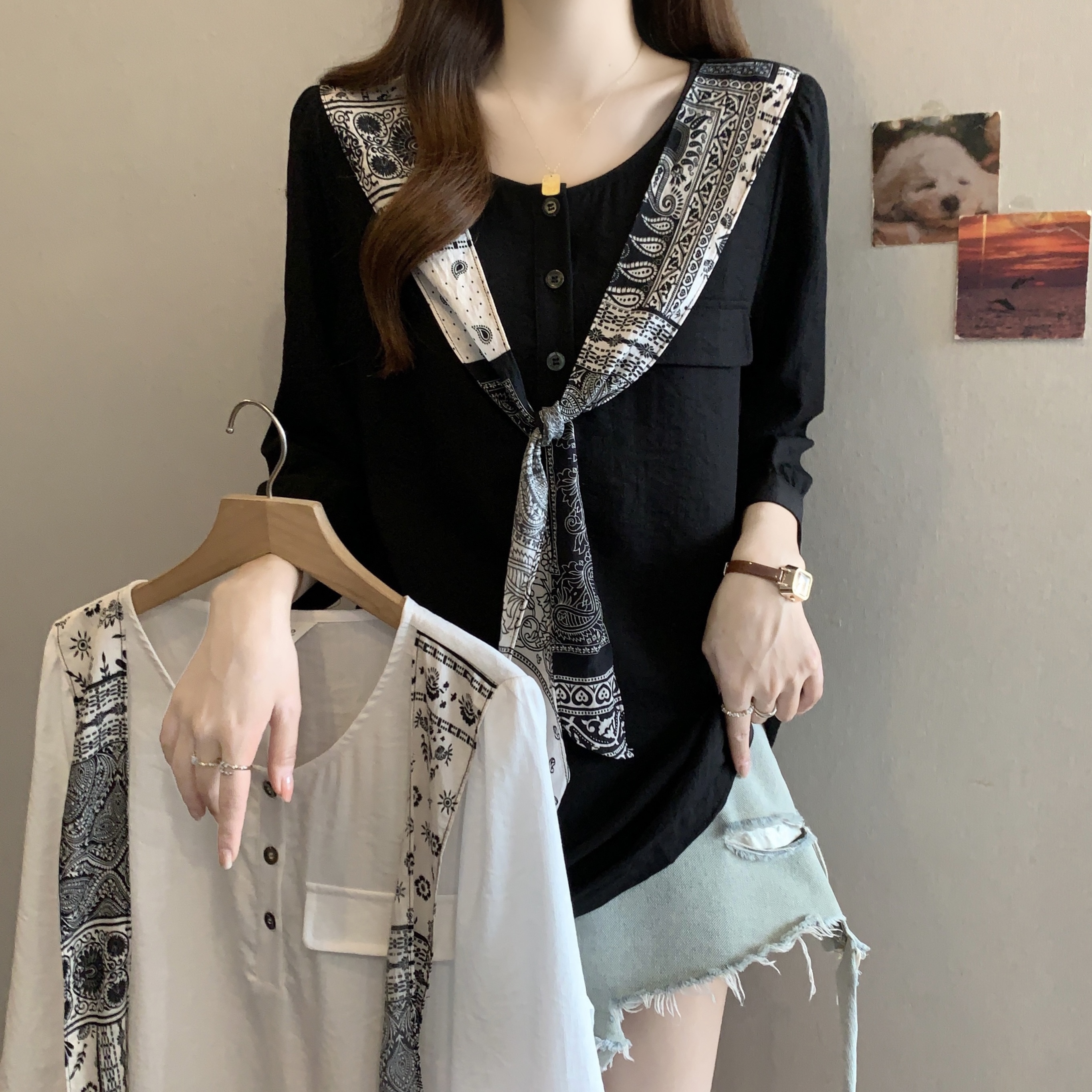 빅 사이즈 여성 의류 페이크 레이어드 패치워크 목이버섯 라운드 넥 여성 셔츠 2026 새로운 배색 디자인 센스 슬림해 보이는 맨위