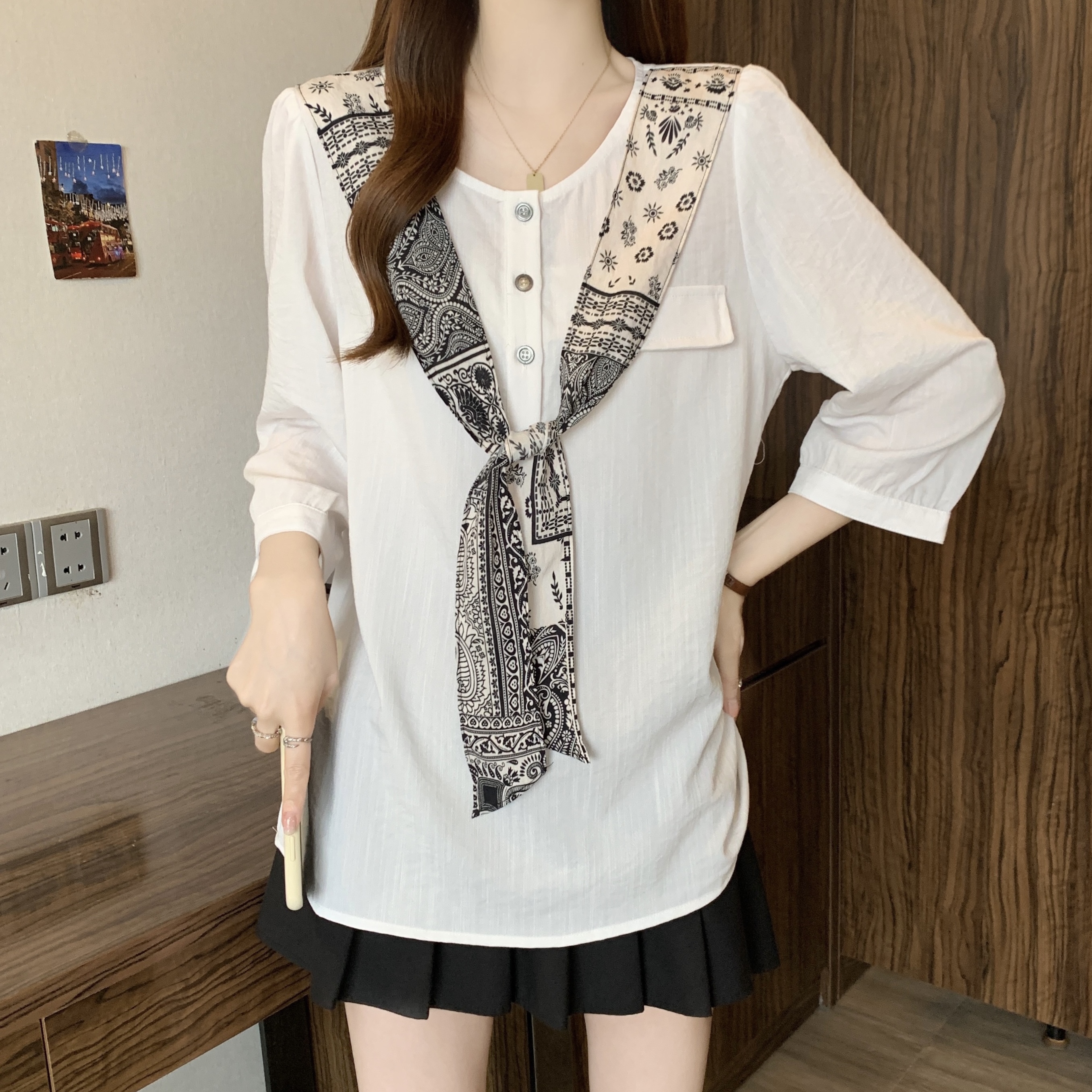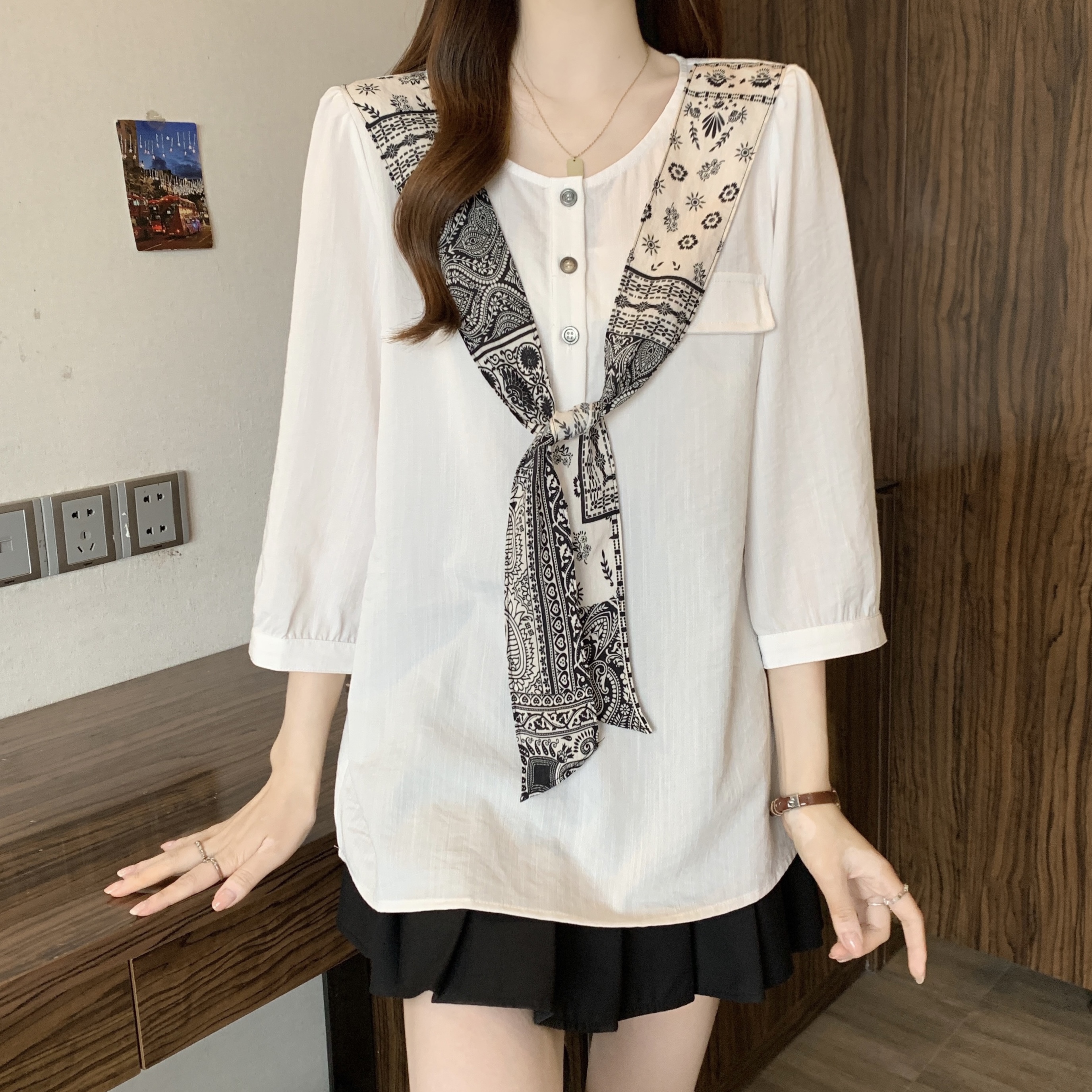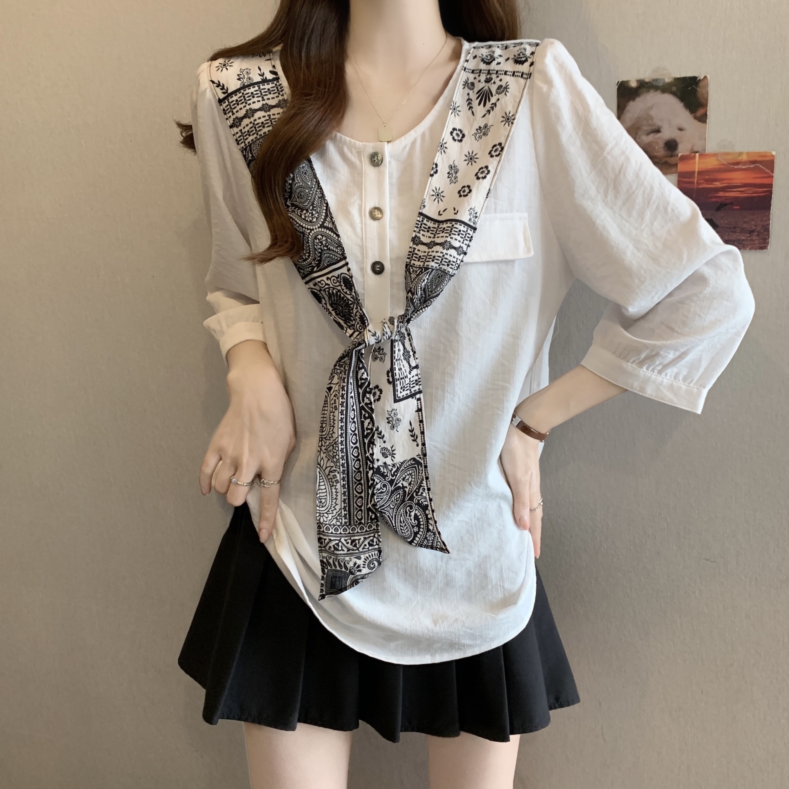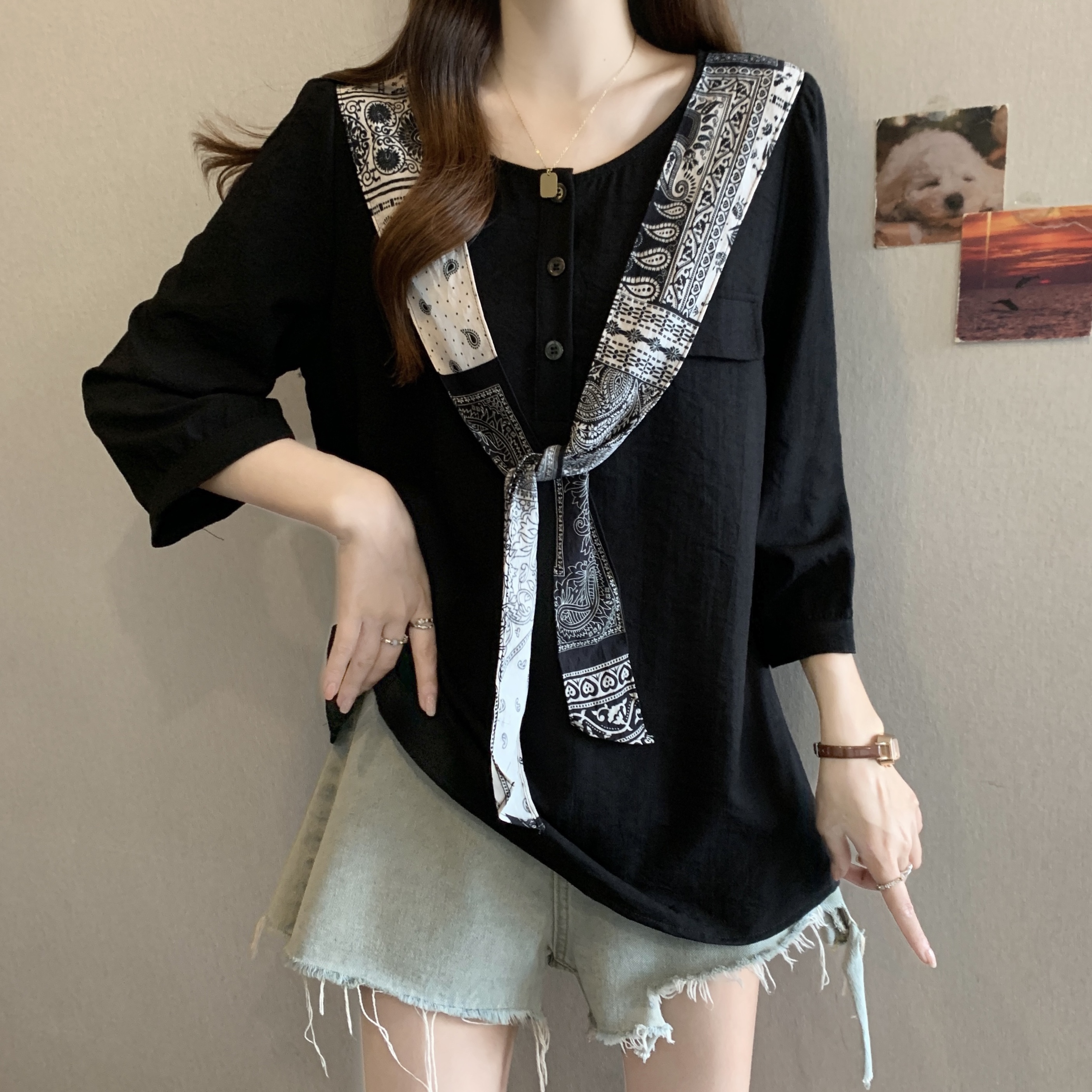 빅 사이즈 여성 의류 프린트 숄 리본 모방 면 린넨 작은 셔츠 지방 mm 디자인 센스 품격 연령 감소 맨위