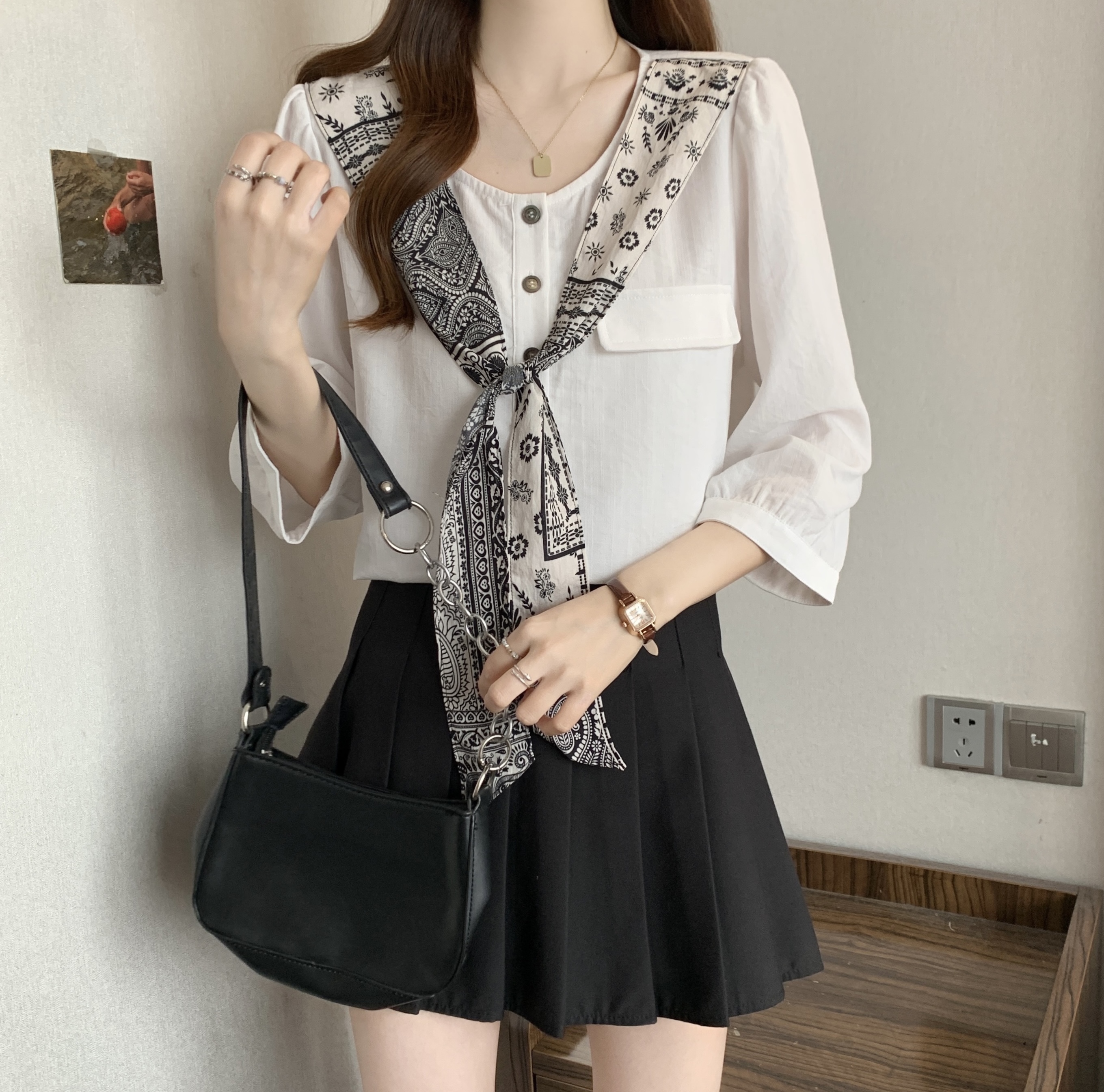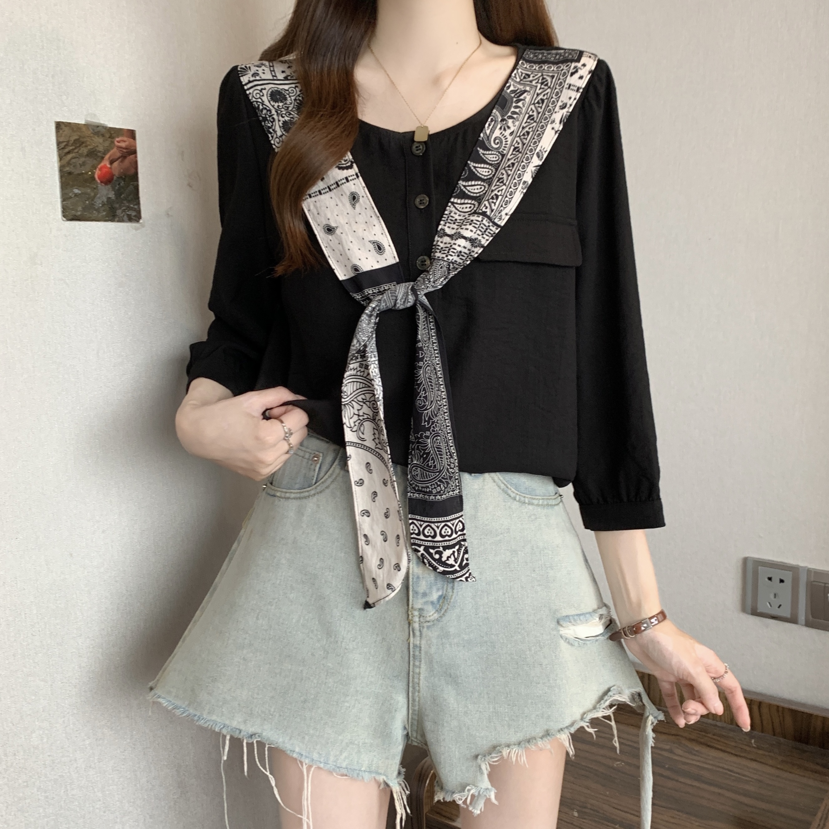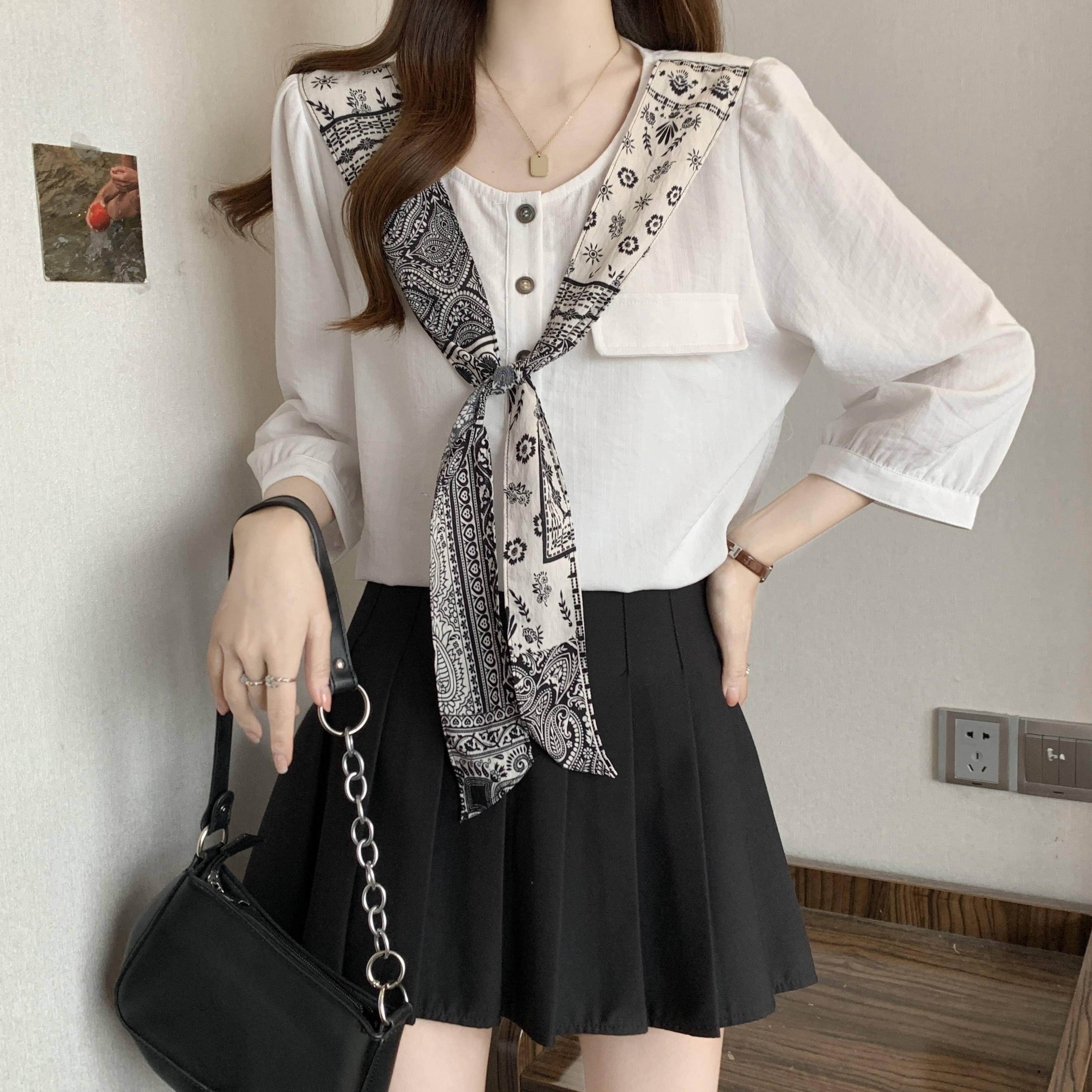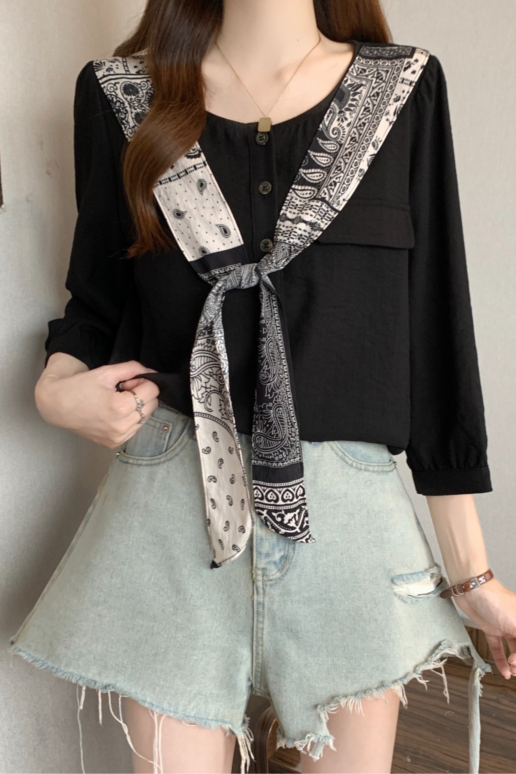 빅 사이즈 여성 의류 프린트 숄 리본 모방 면 린넨 작은 셔츠 지방 mm 디자인 센스 품격 연령 감소 맨위