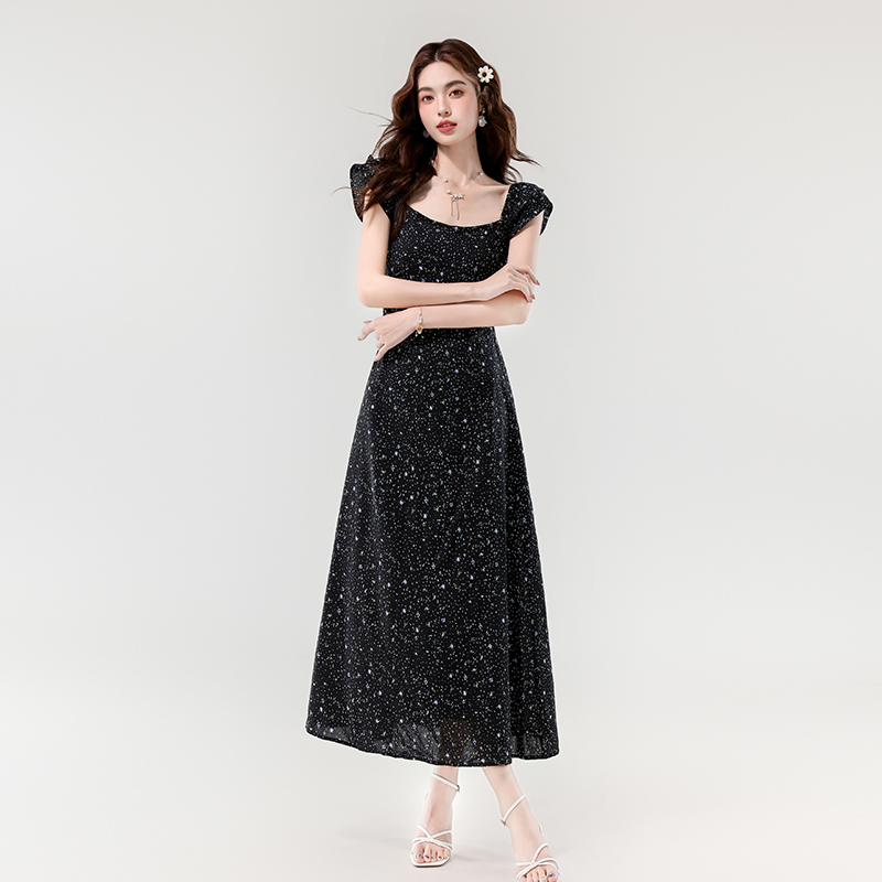 실사 2026 여름 새로운 프랑스식 광장 칼라 작은 날다 소매 롱 코트 슬림해 보이는 프린트 남쪽 법도 가짜 바람 드레스