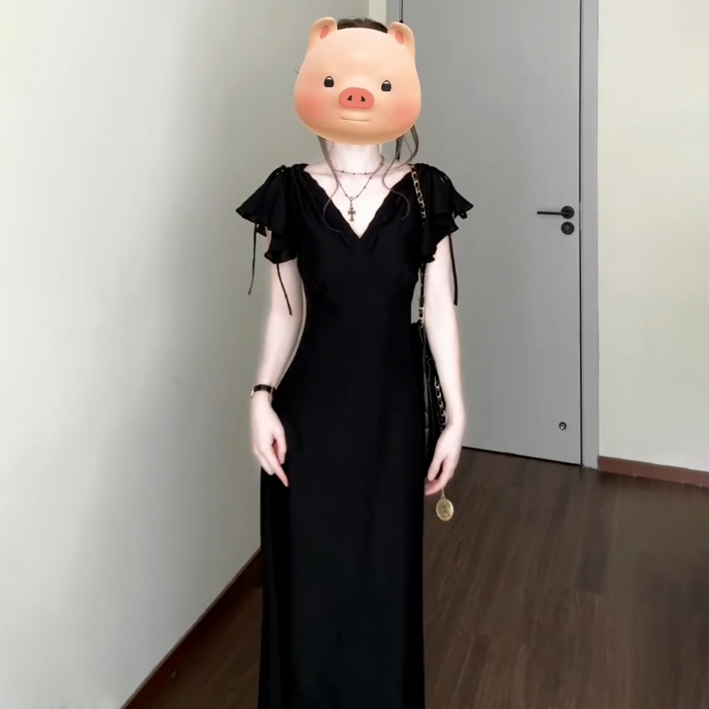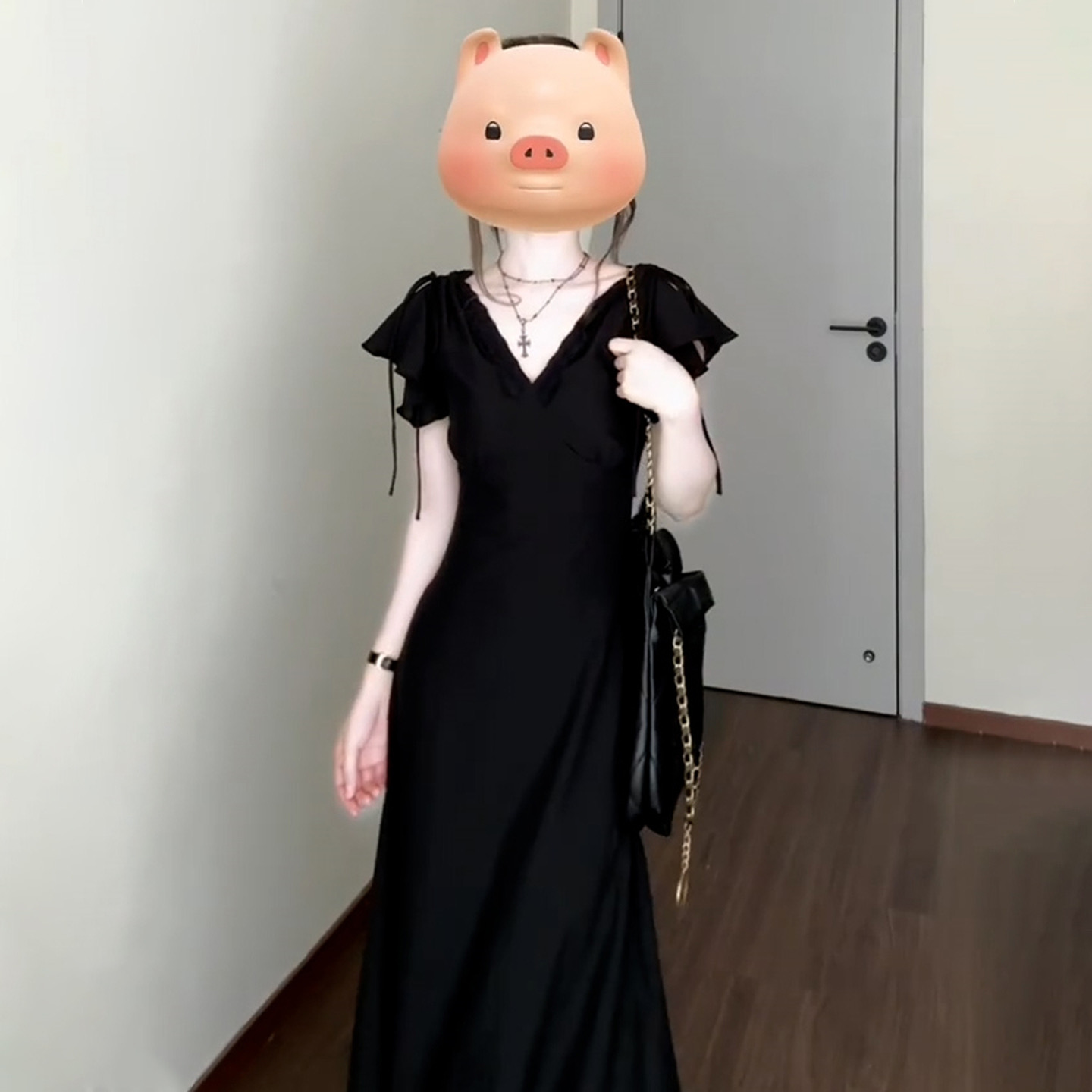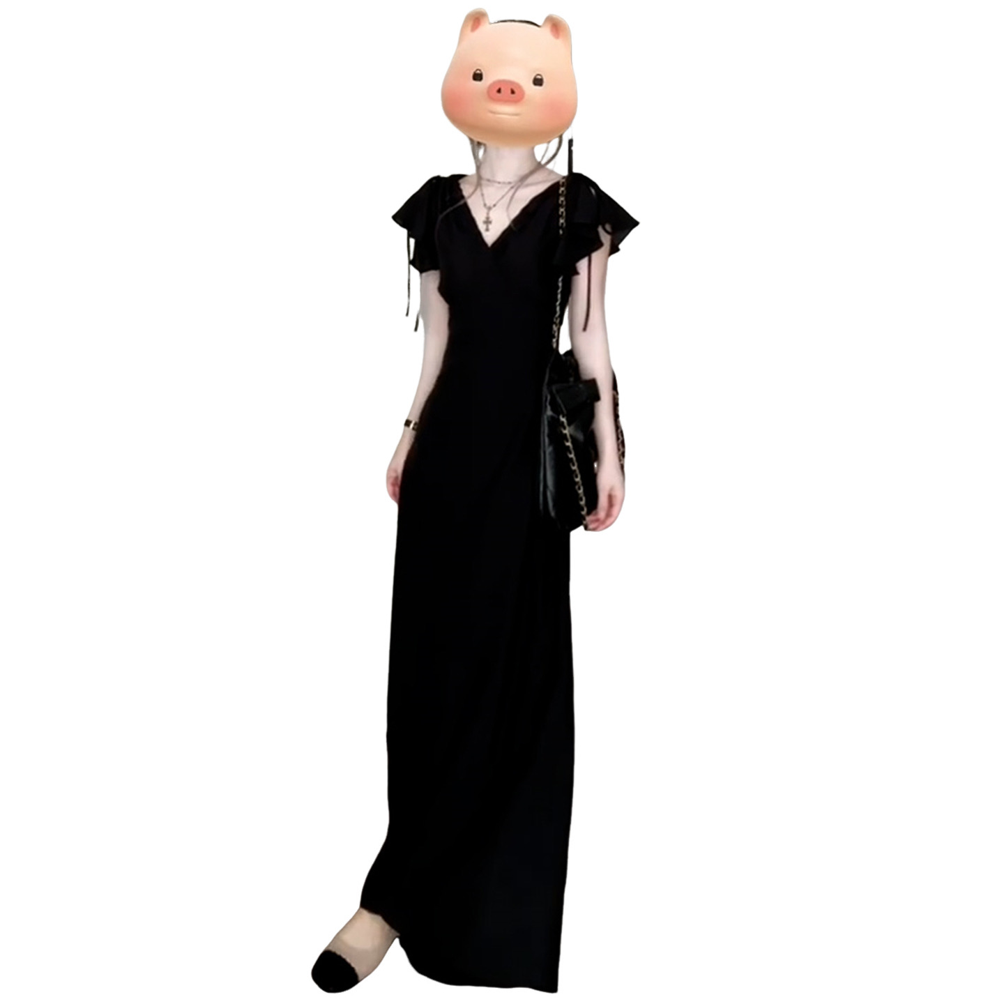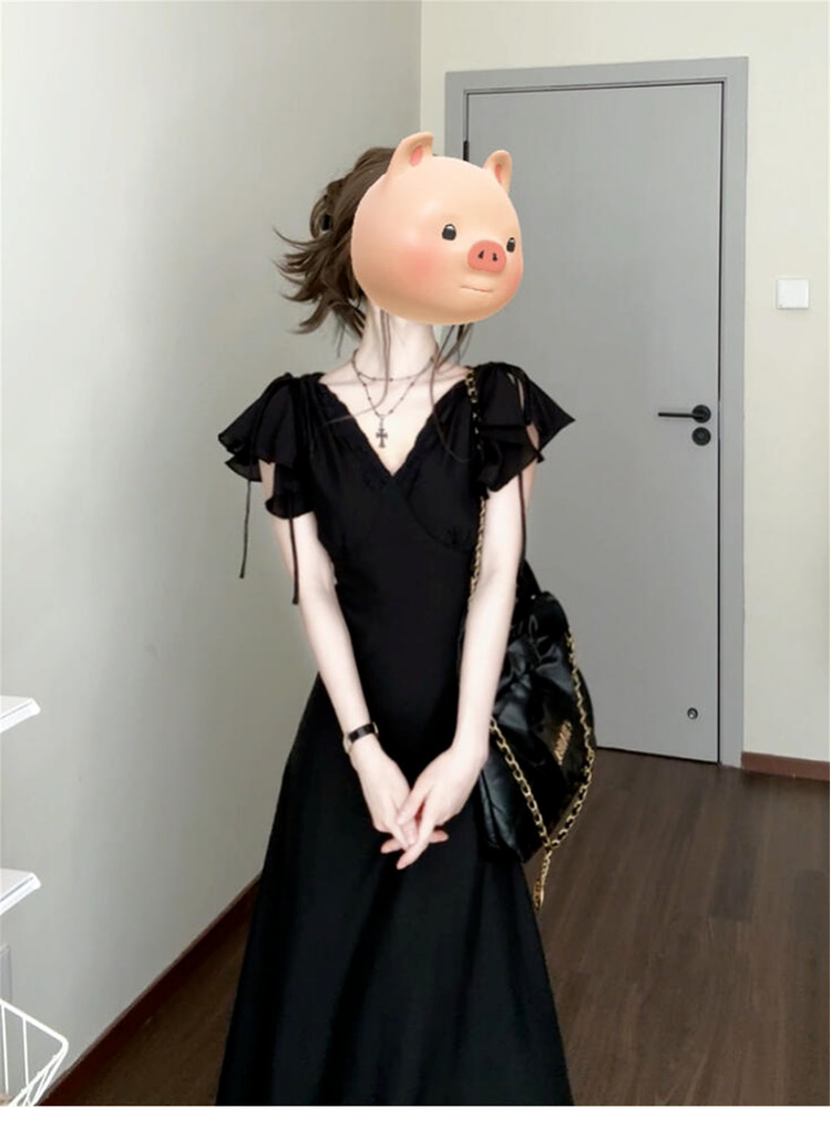 그는 벤 바람 프랑스식 검정색 V넥 점프 슈트 치마 여성 의류 여름 2025 새로운 폭발 고급 센스 품격 길다