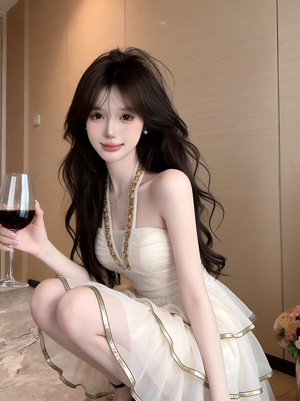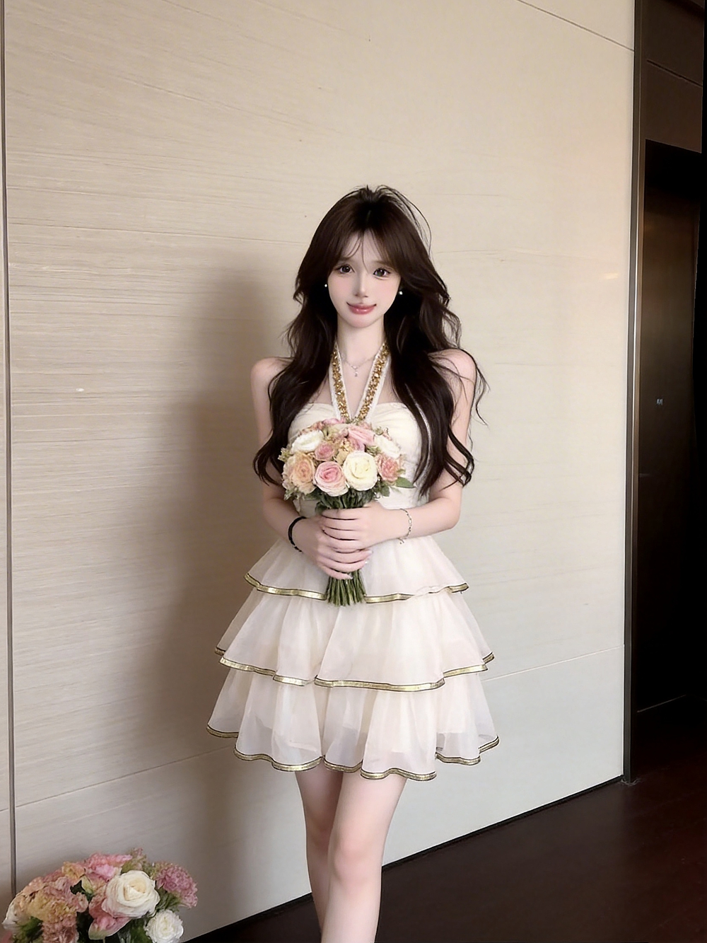 실사 핫걸 섹시함 낮은 가슴 허리 수축 큰 진자 꽃 숄더백 슬립 드레스 순수한 욕망 슬림해 보이는 연회 예복 치마