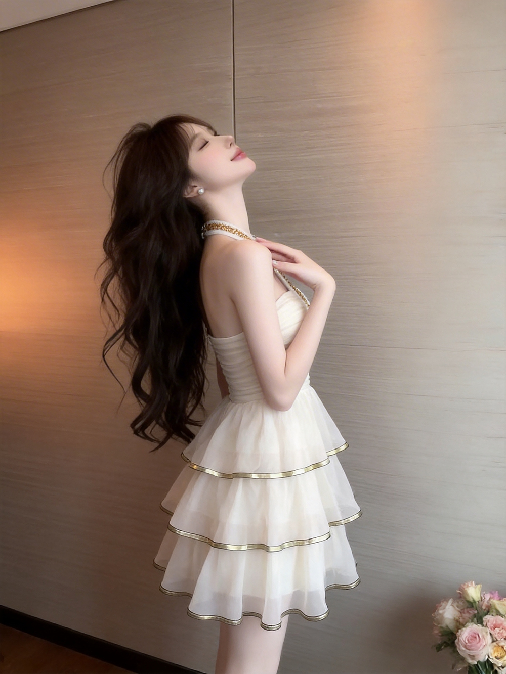 실사 프랑스식 작은 대중 디자인 센스 무거운 작업 플래시 훈련 행침 목 백리스 작은 드레스 케이크 드레스 여성 의류 망사 드레스