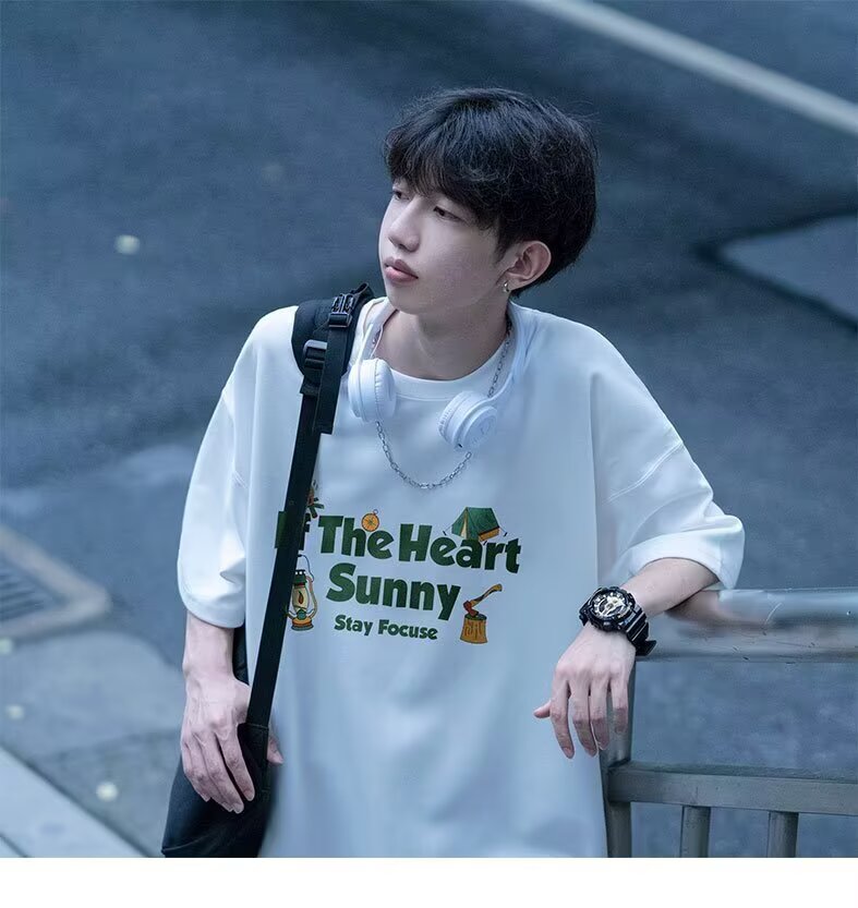 순면 220g 높은 산 작은 프린트 캐주얼 반팔 티셔츠 남자 미니멀리즘 다용도 위 안산 프린트 5 점 소매 티셔츠 소년