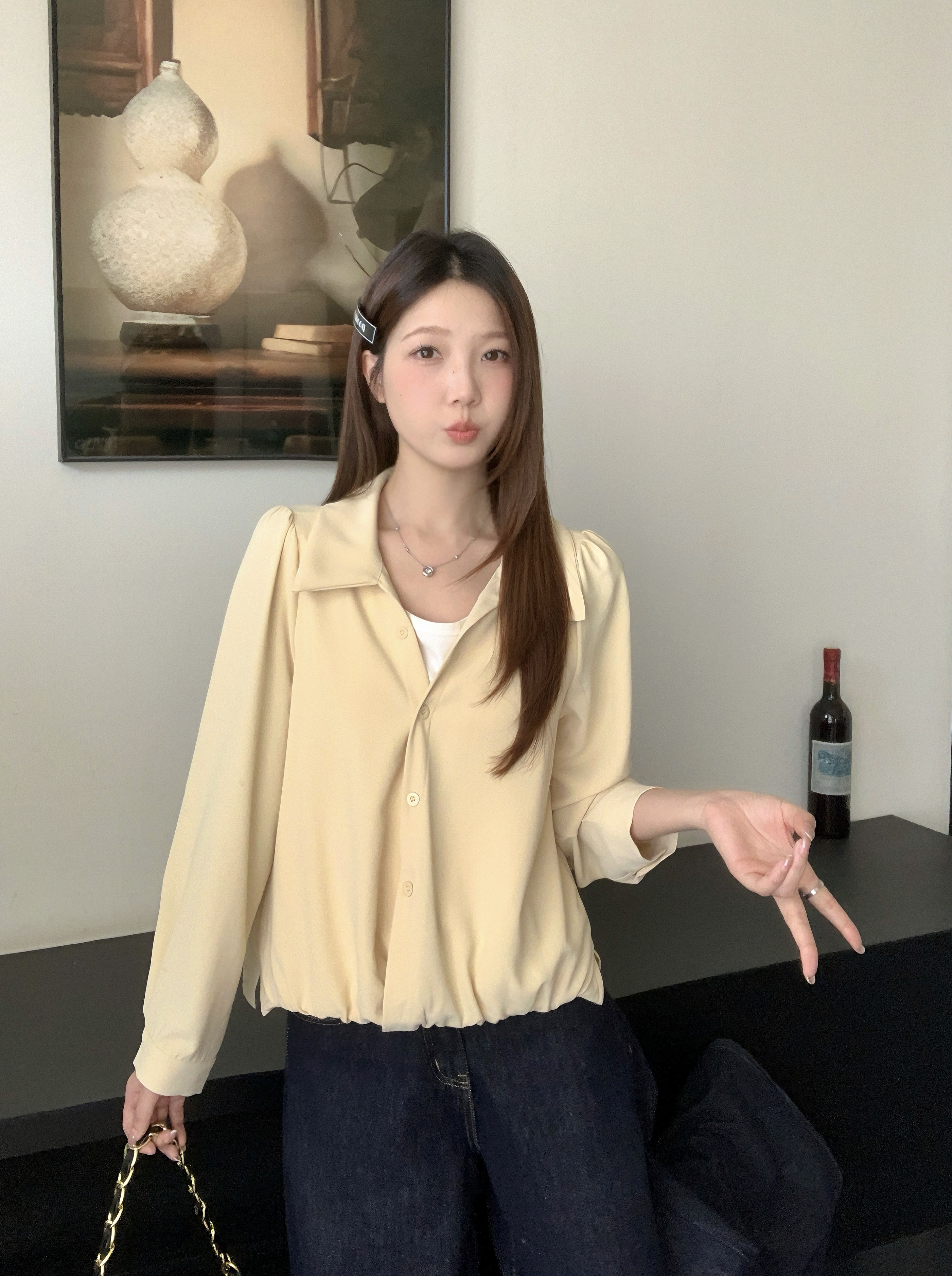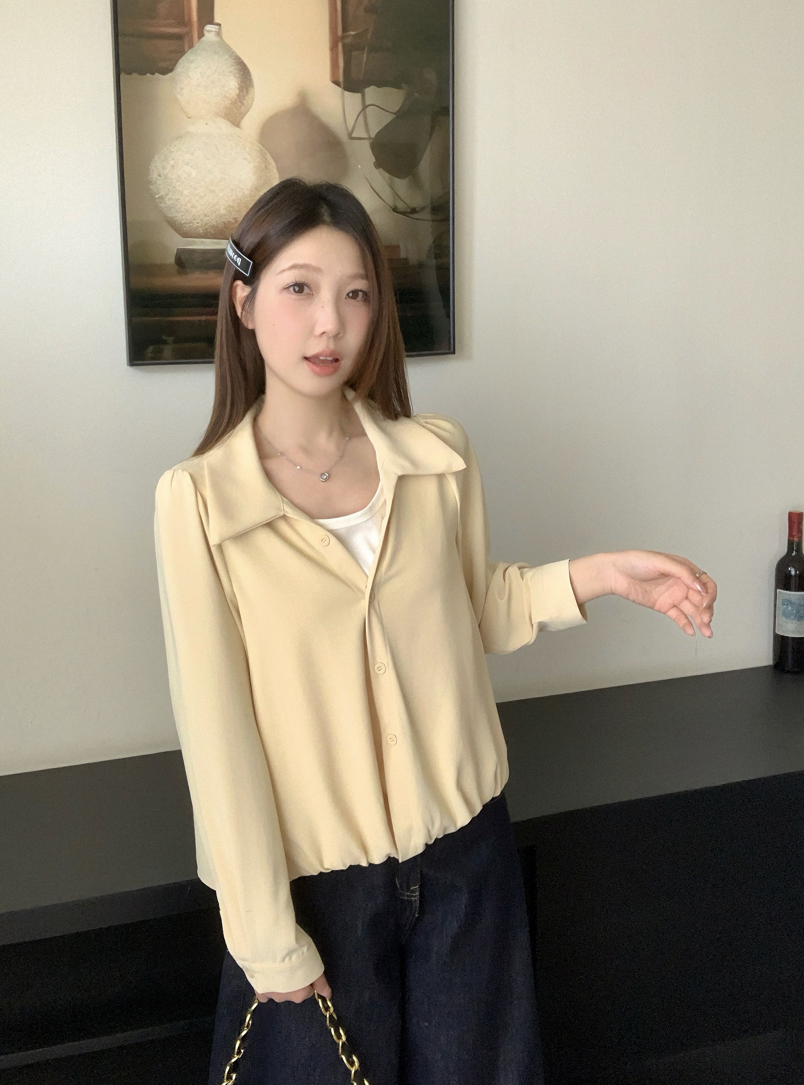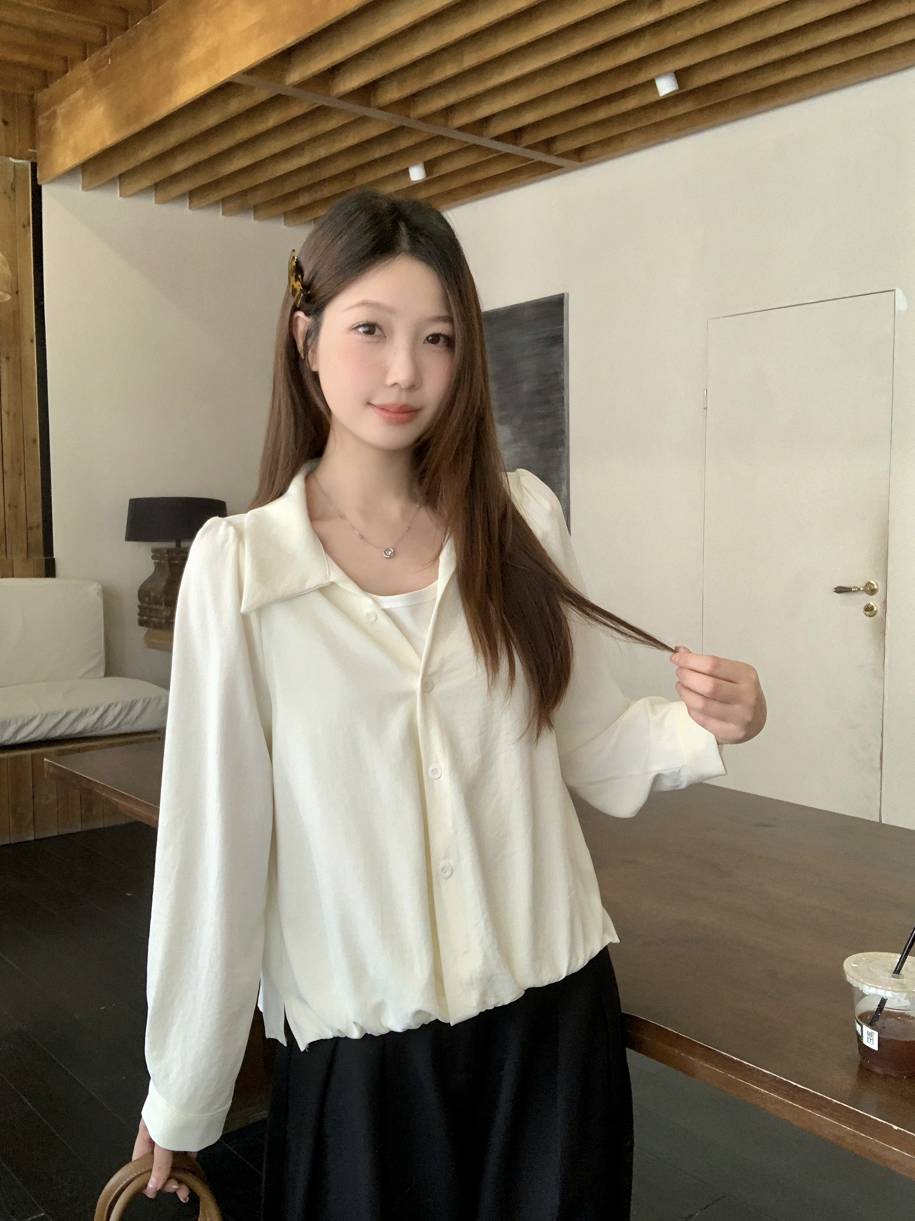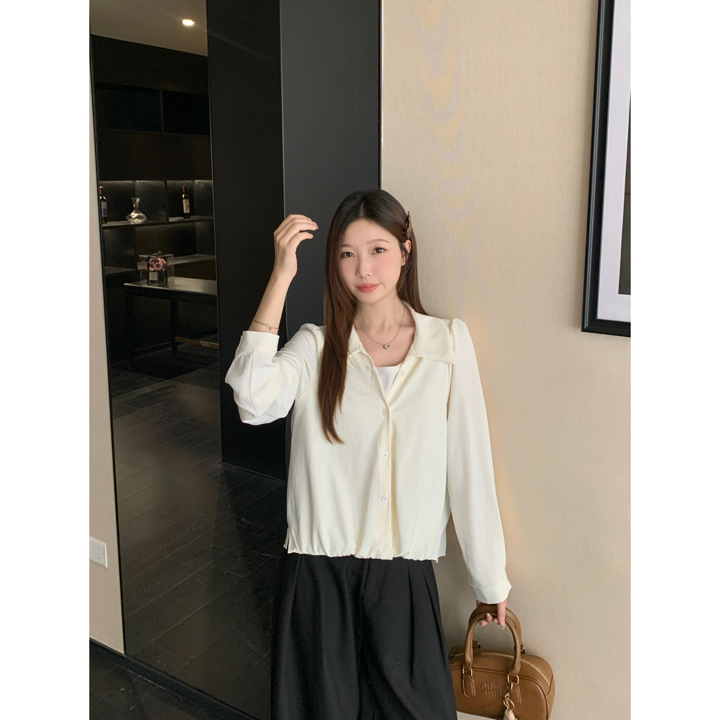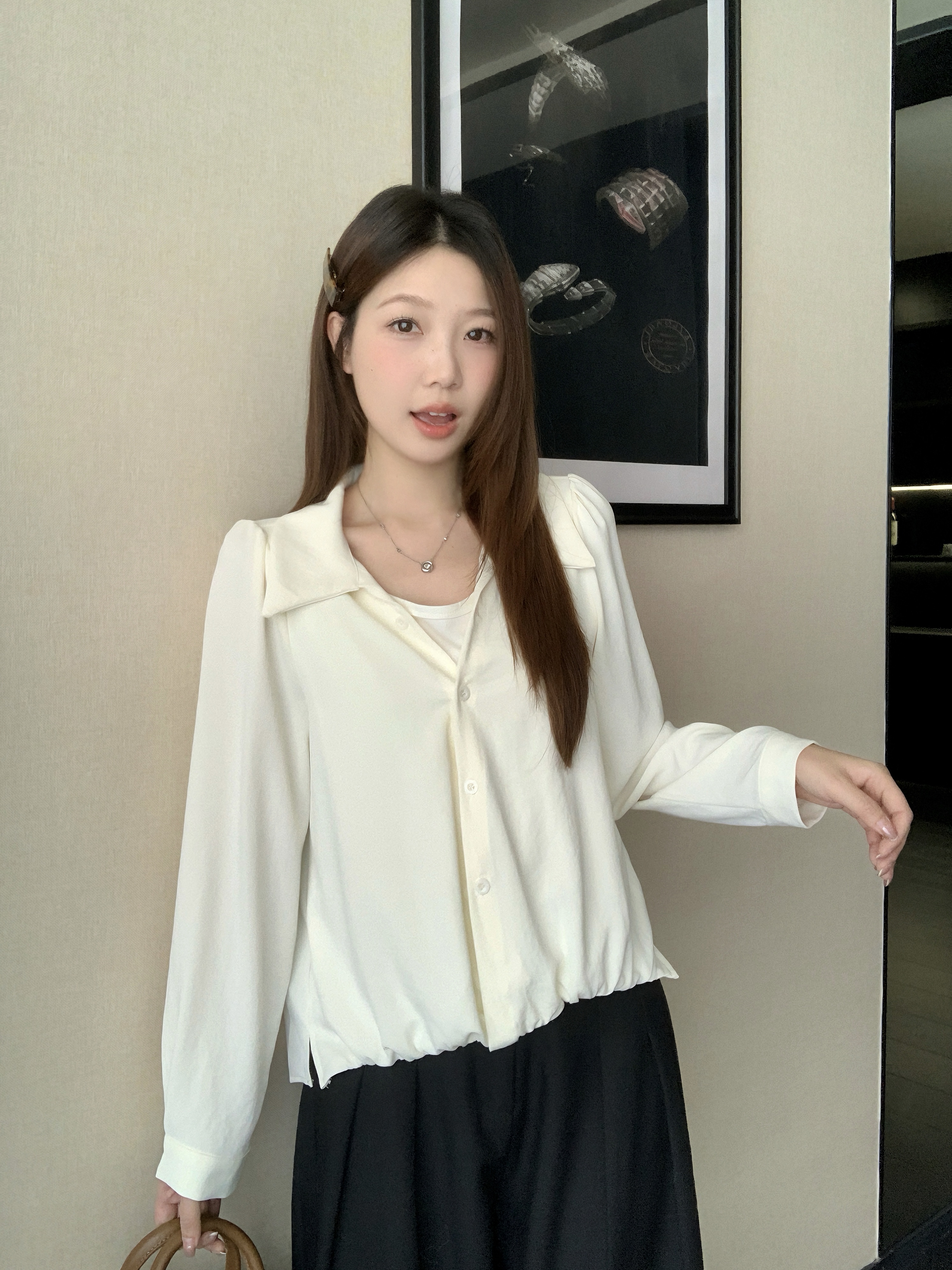 실사 2026 봄 드레스 새로운 지방 mm 빅 사이즈 여성 페이크 레이어드 폴로 칼라 긴팔 셔츠 출퇴근 캐주얼 슬림해 보이는 셔츠