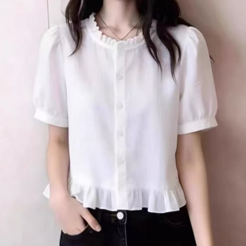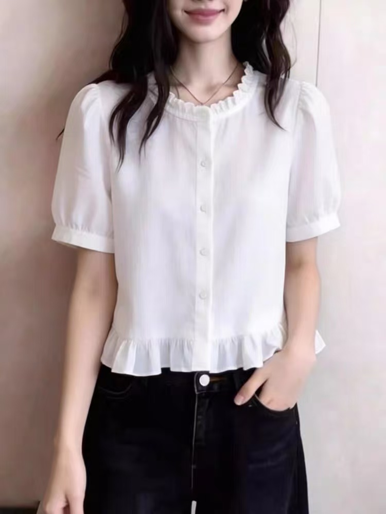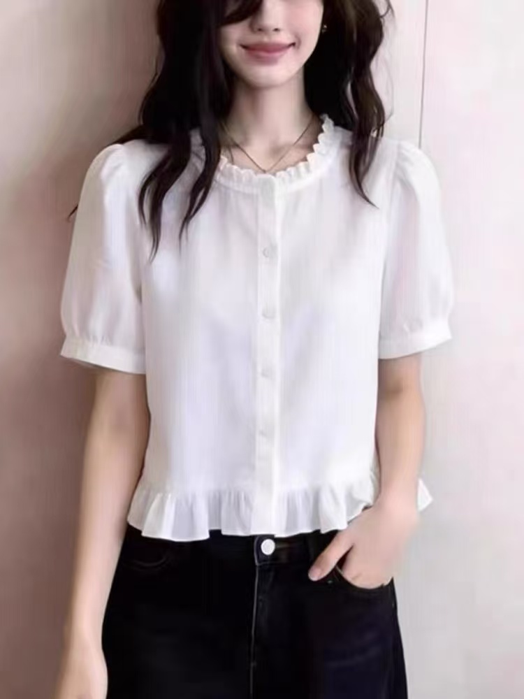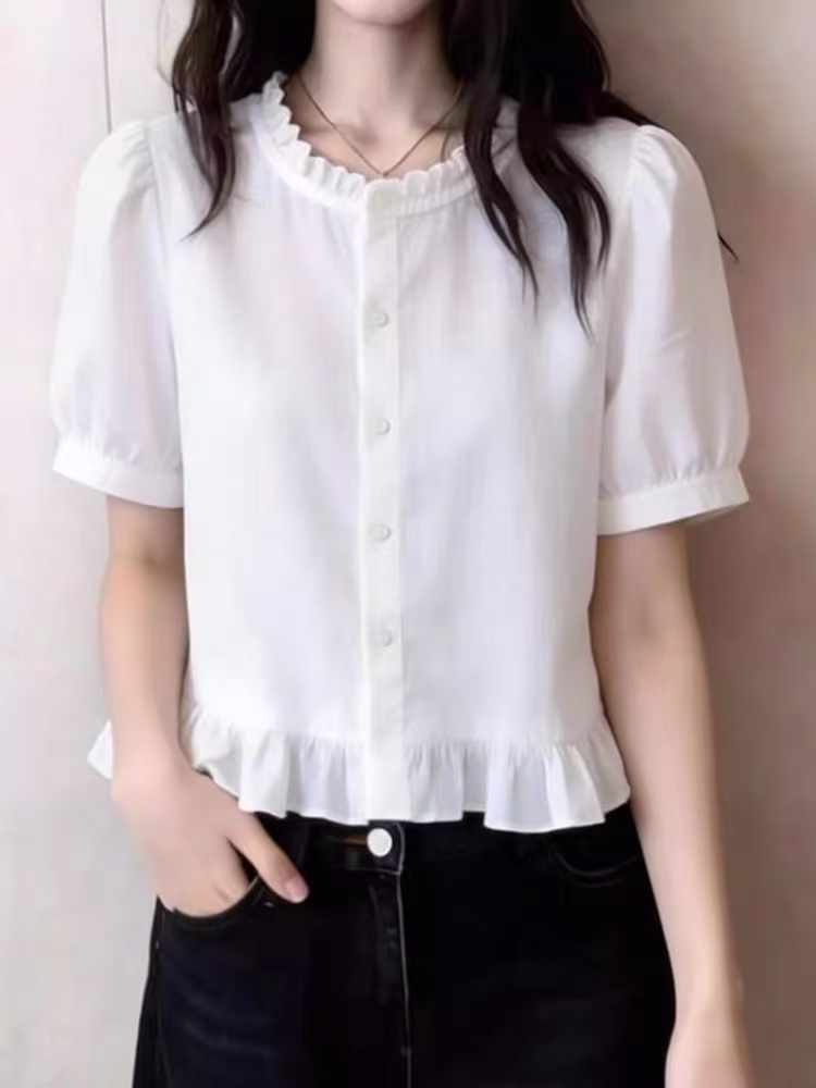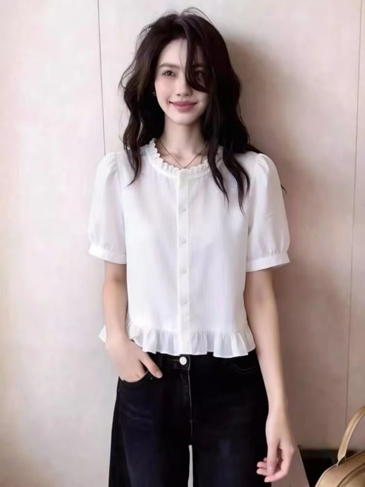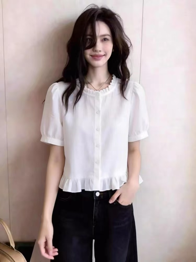 프랑스식 프릴 화이트 반팔 여성 셔츠 프릴 밑단 허리 수축 부드러운 바람 출퇴근 다용도 슬림해 보이는 맨위