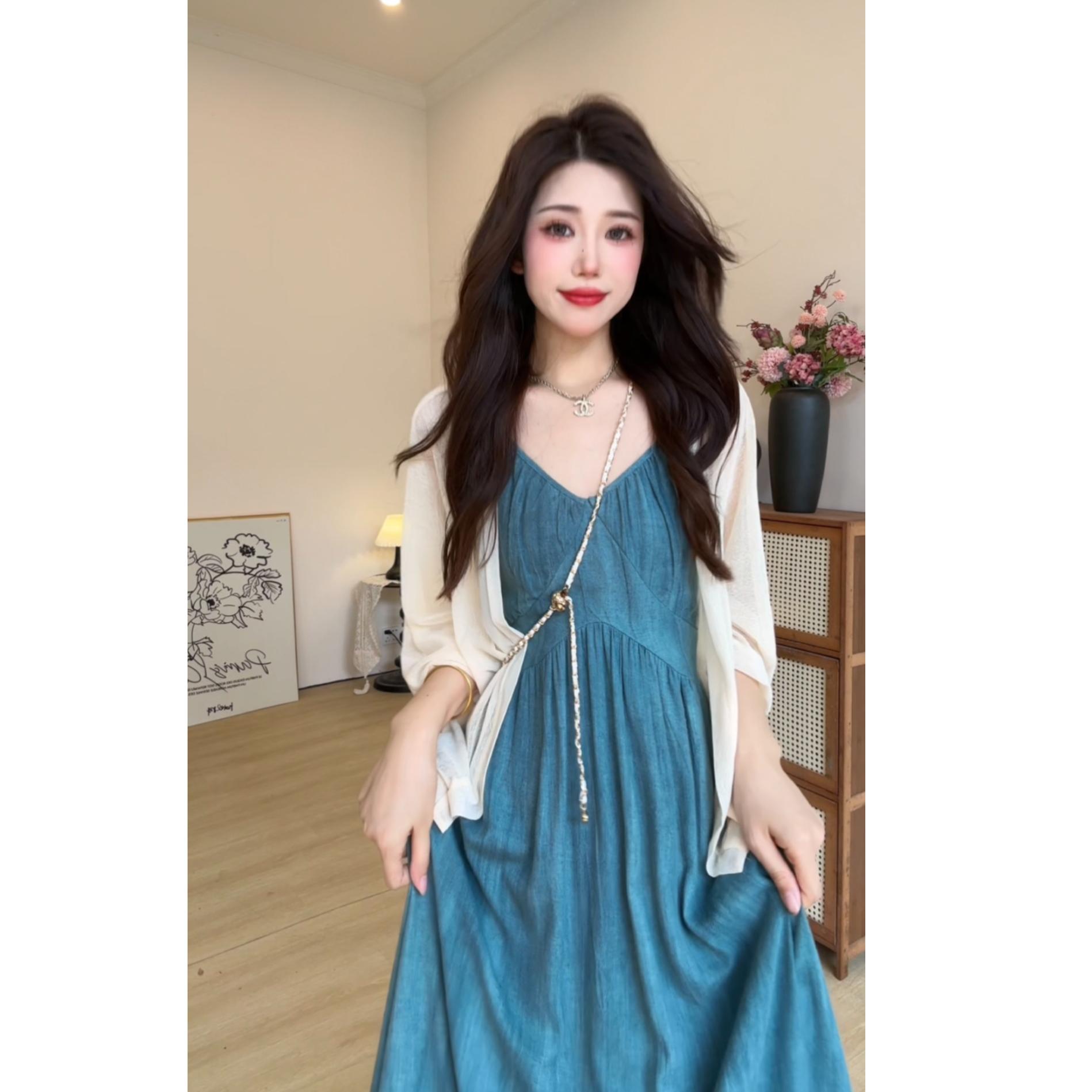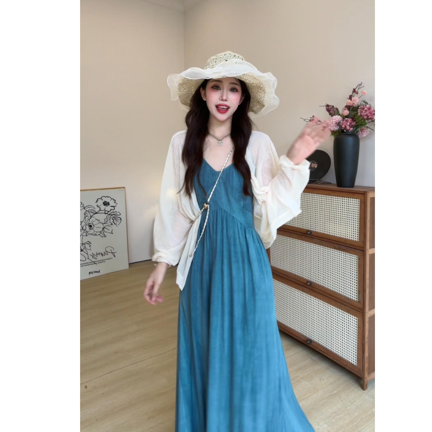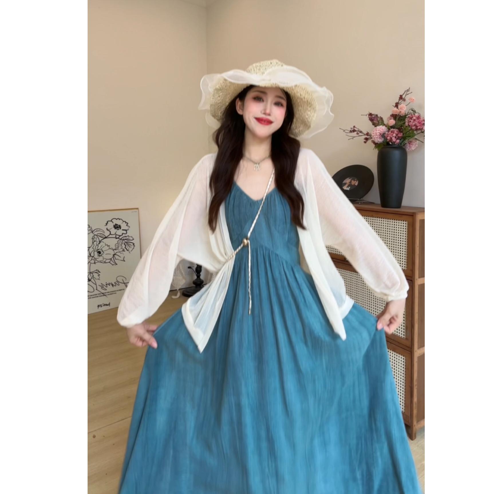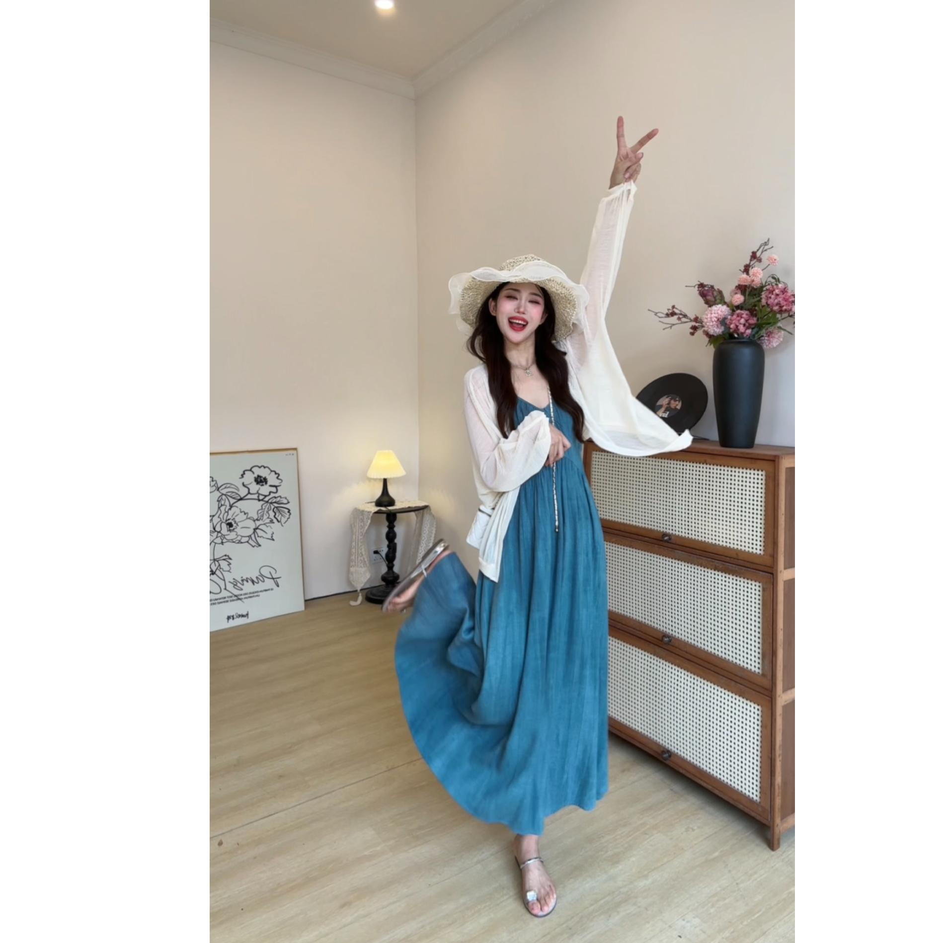 빅 사이즈 프랑스식 레트로 슬립 여성 드레스 여름 허리 수축 슬림해 보이는 롱 스커트 해변가 휴가 해변 드레스
