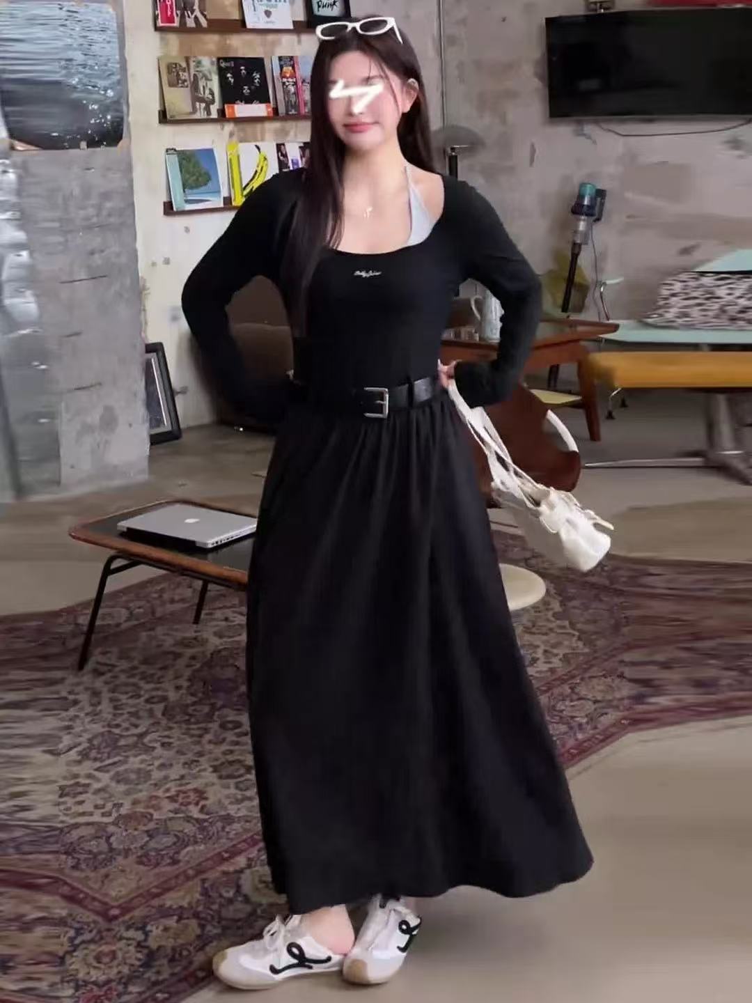 있음 선적 빅 사이즈 여성 의류 지방 mm 슬림해 보이는 페이크 레이어드 u 칼라 배색 행침 목 미니멀리즘 벨트 검정색 드레스