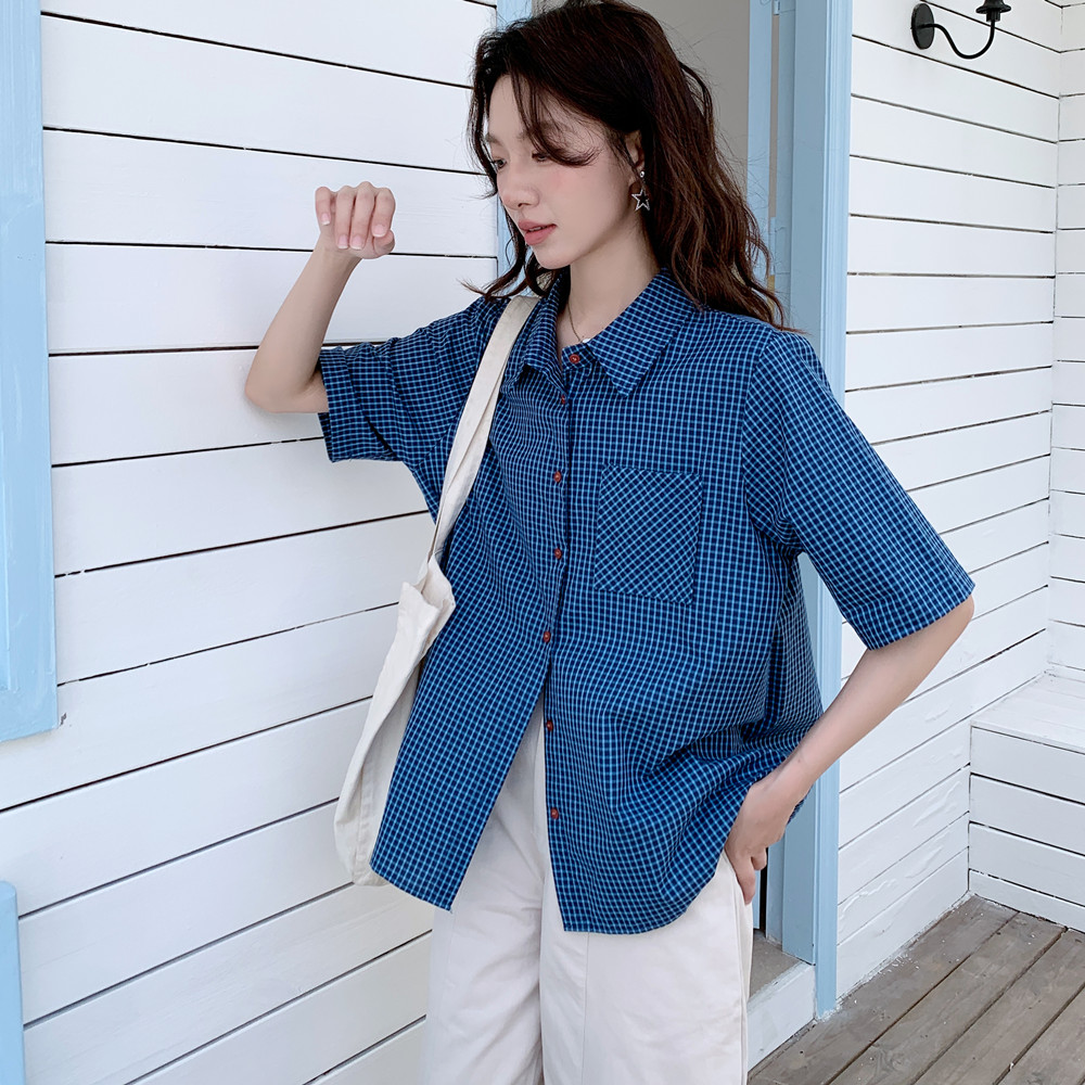 실사 파란색 루즈핏 체크무늬 반팔 여성 셔츠 여름 미니멀리즘 품격 한국 스타일 다용도 셔츠
