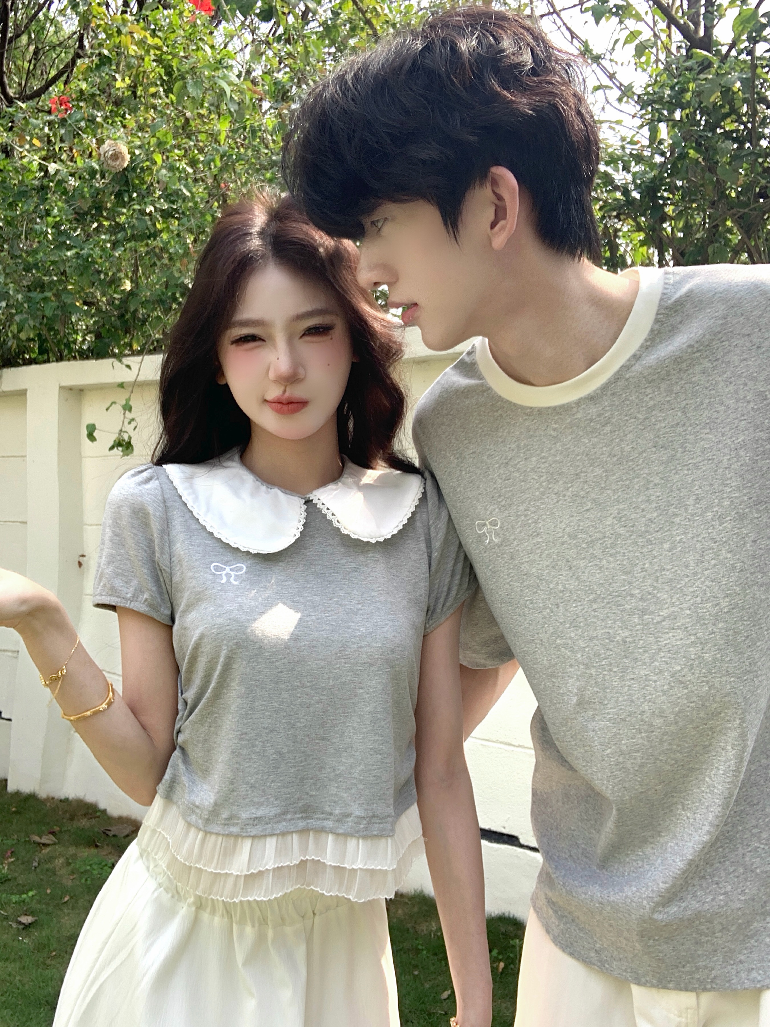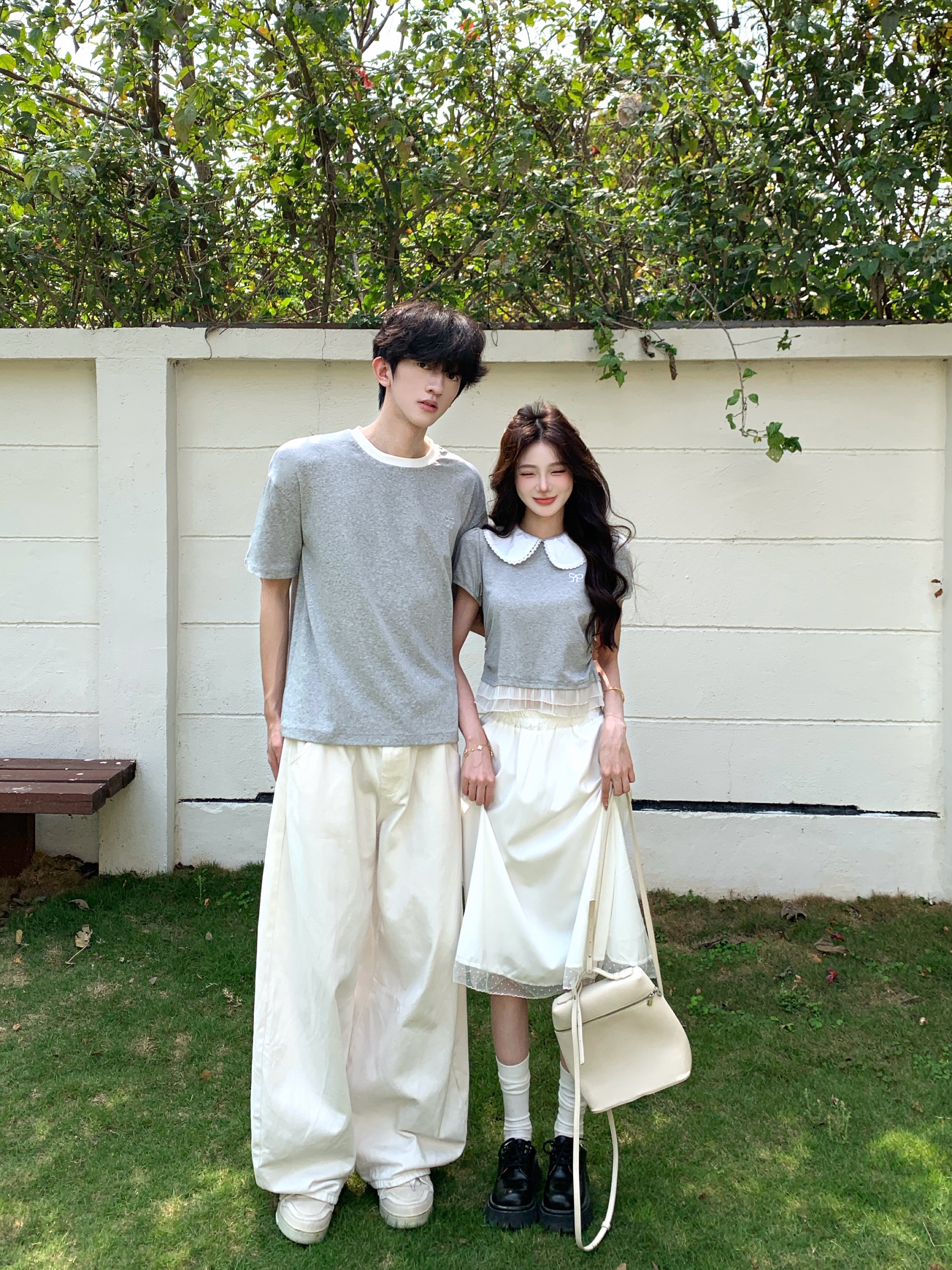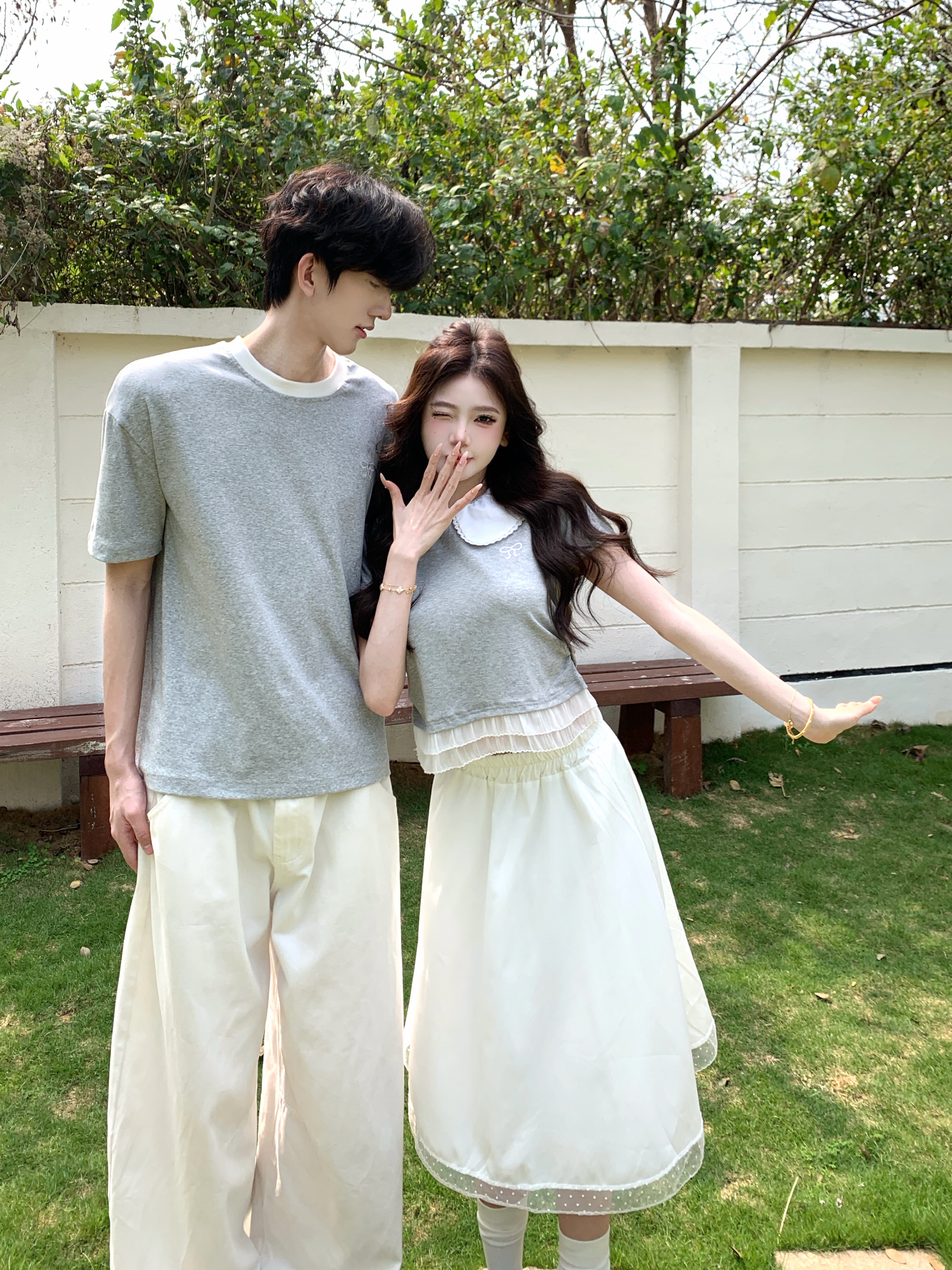 실사 아메리칸 레트로 핫걸 쇼트 스타일 수신 Pleat 곡선 알파벳 프린트 끈 반팔 커플룩