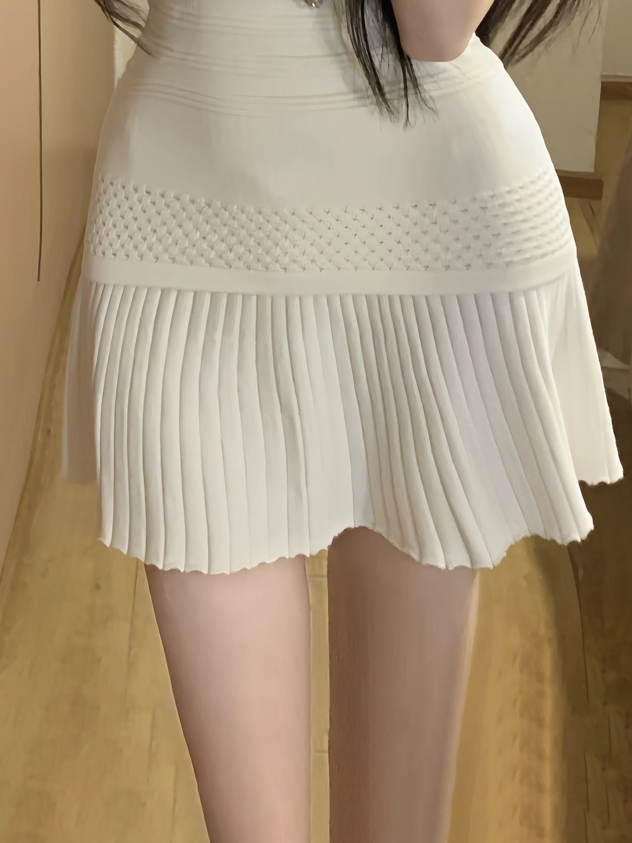 있음 도착 니트 반팔 부드러운 도루 센스 플리츠 롱 코트 루즈핏 요정 고대 조기 바람 여성 반신 치마 세트 여성