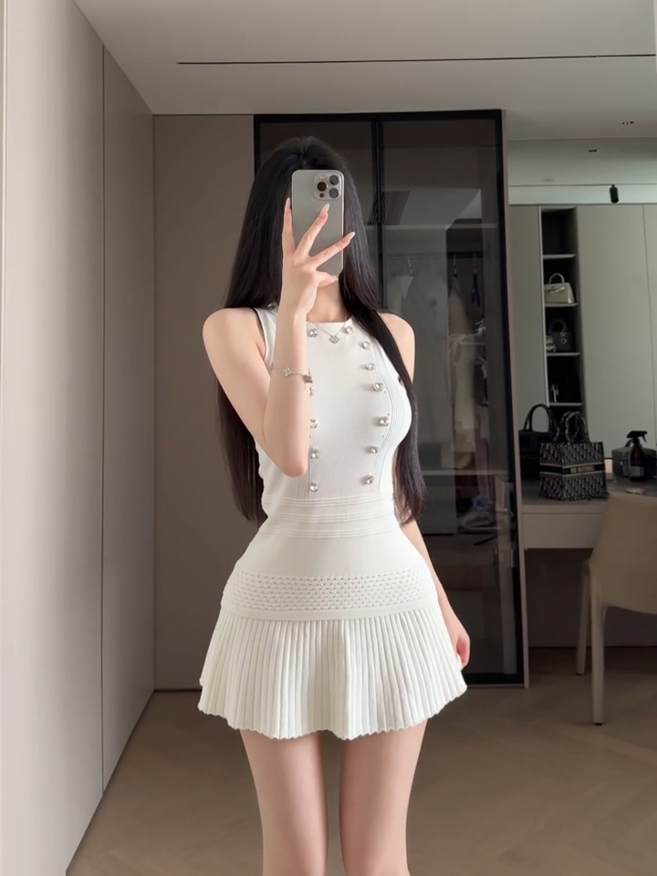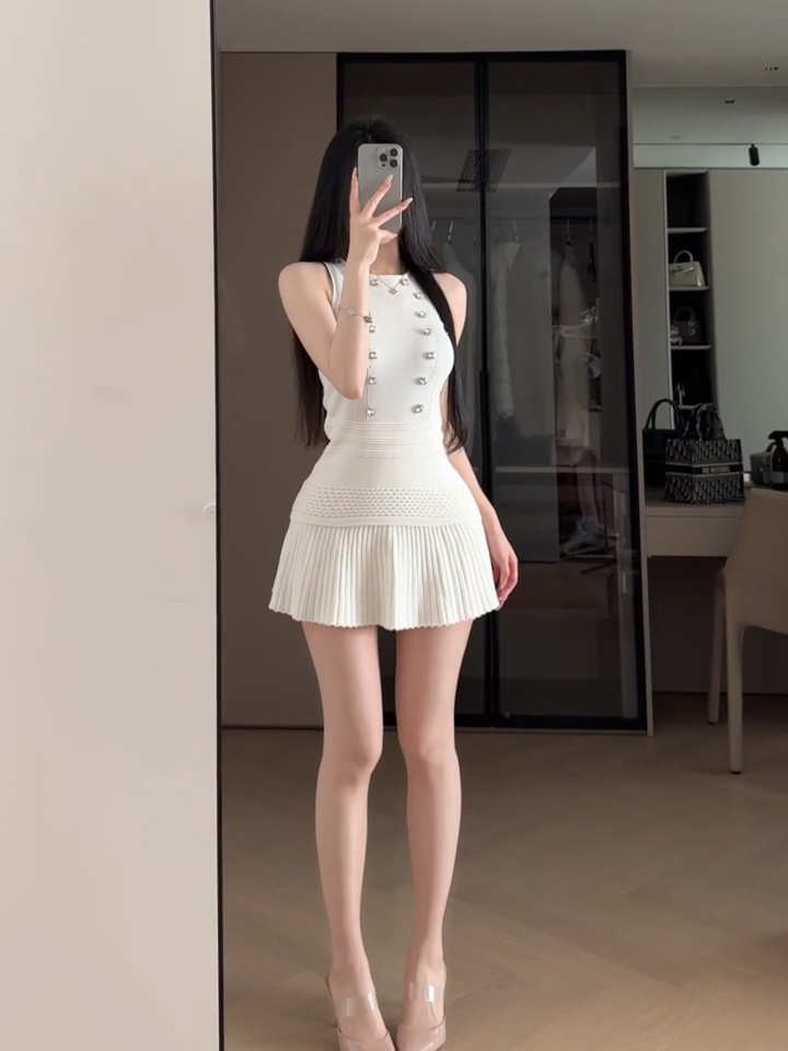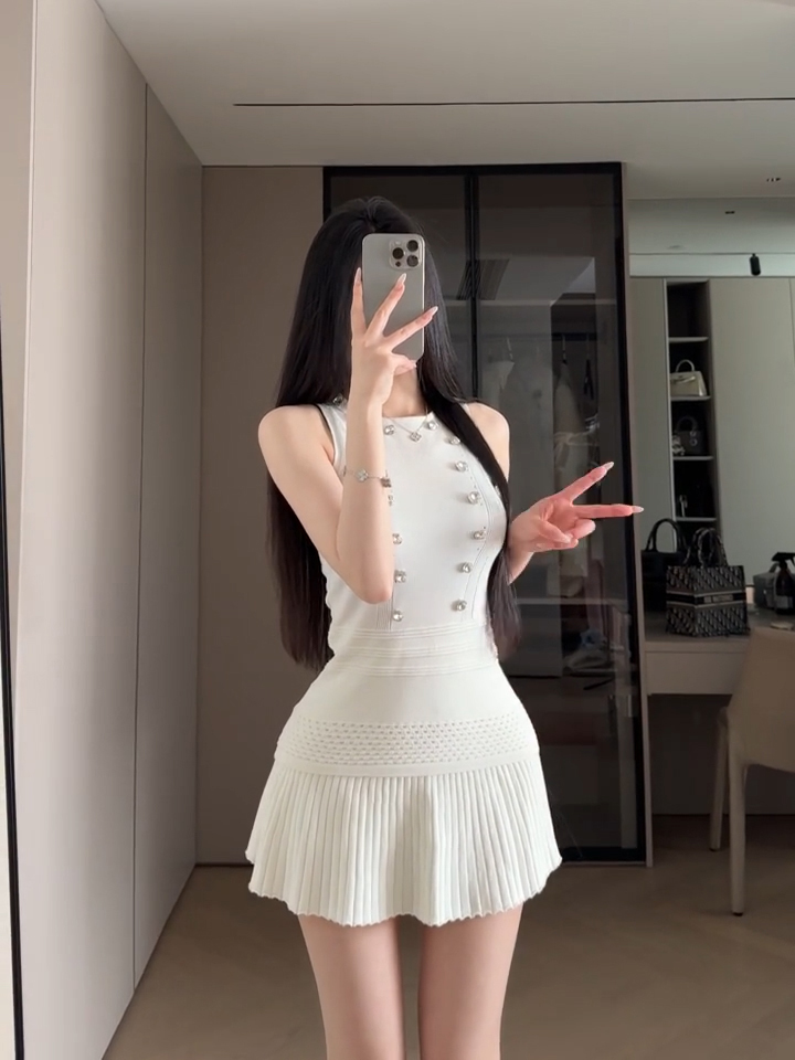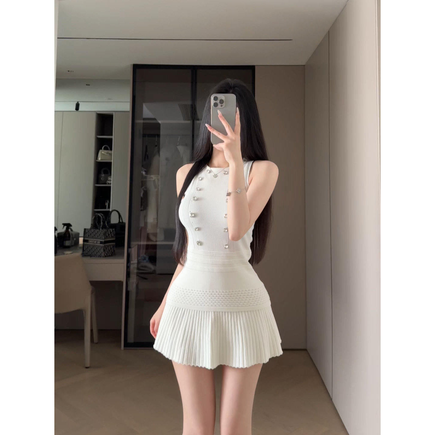 있음 도착 여름 프랑스식 품격 라운드 넥 니트 스웨터 조끼 여성 트임 스트랩 허리 수축 맨위 반신 스커트 여성