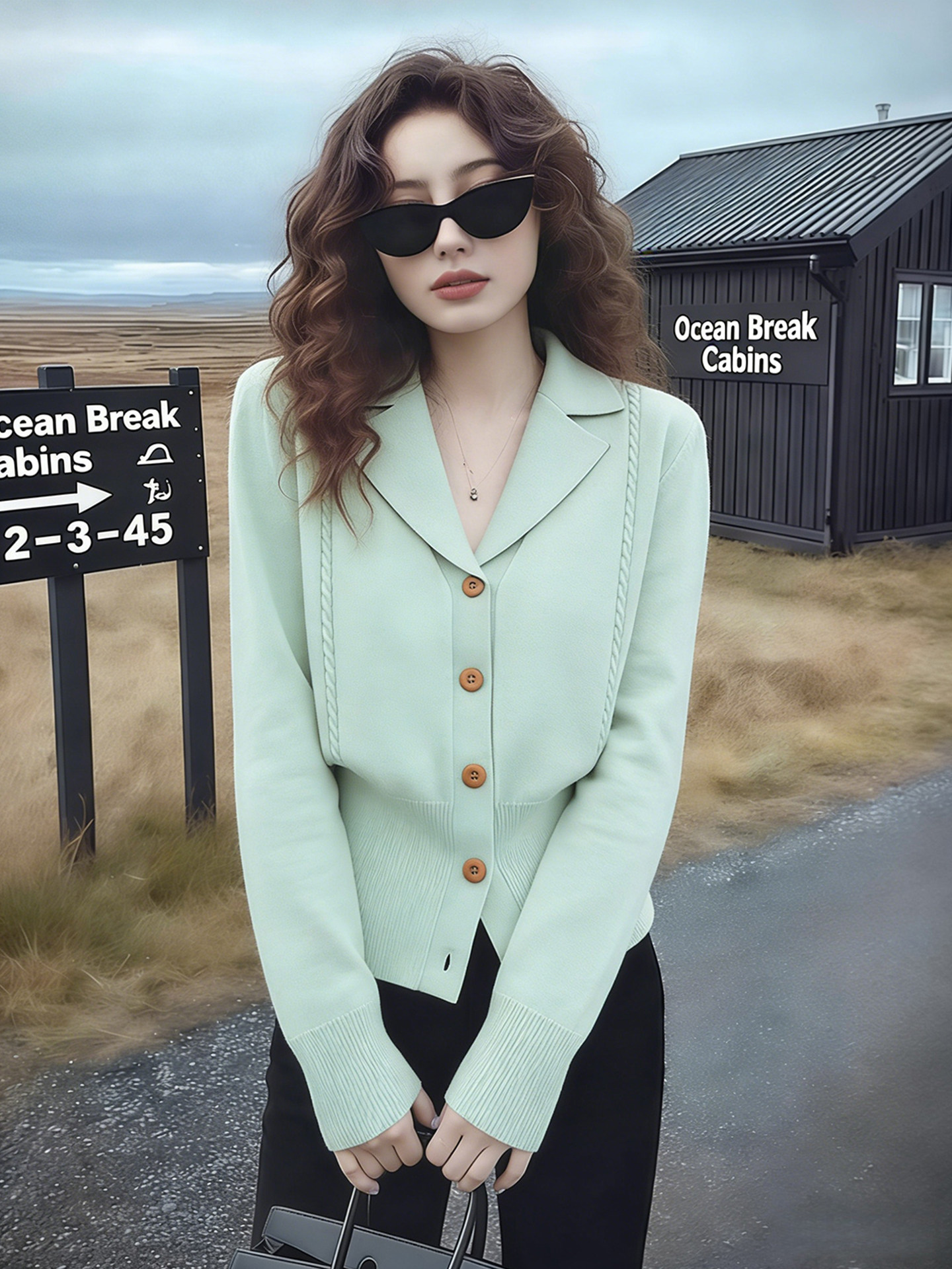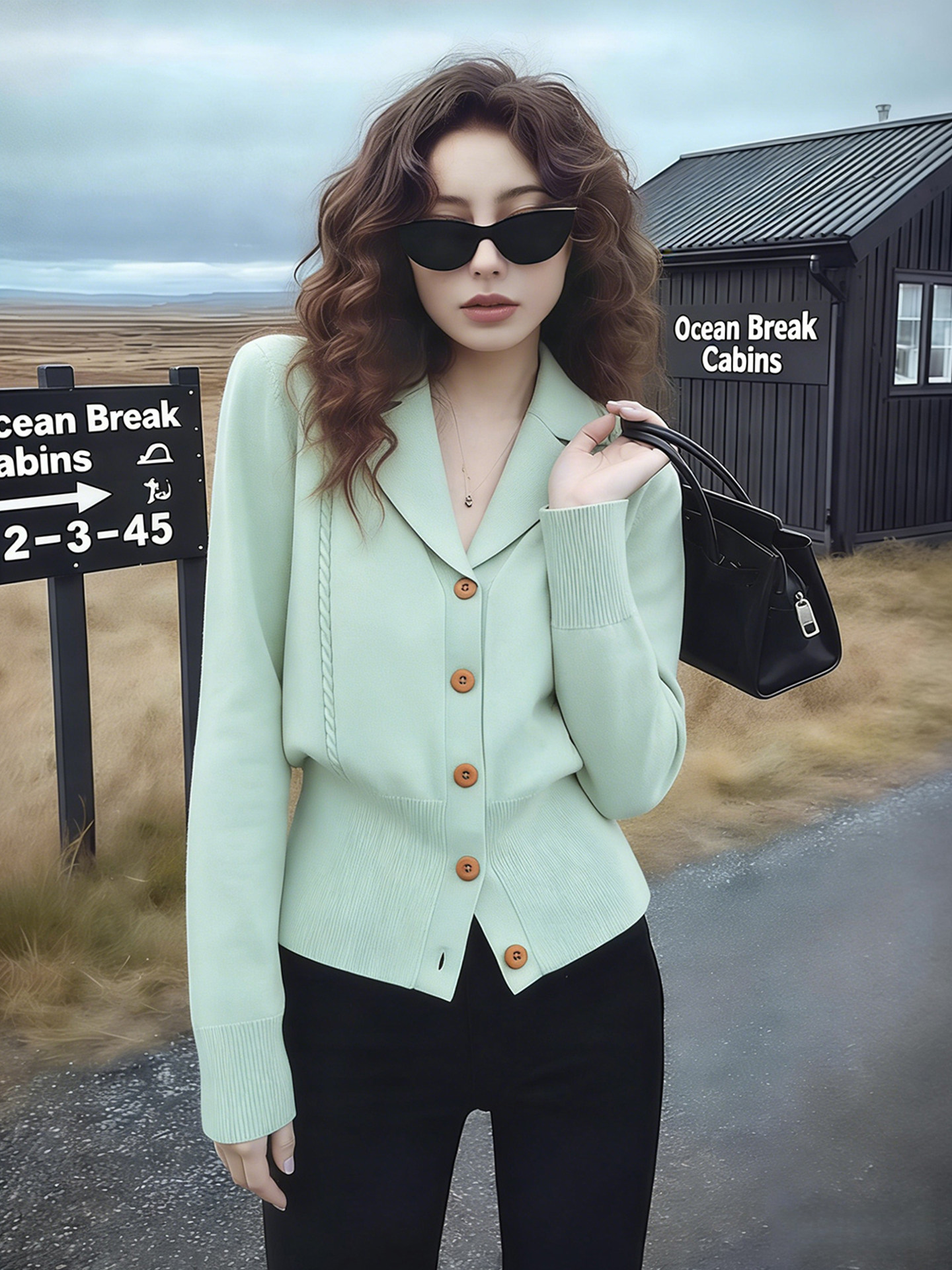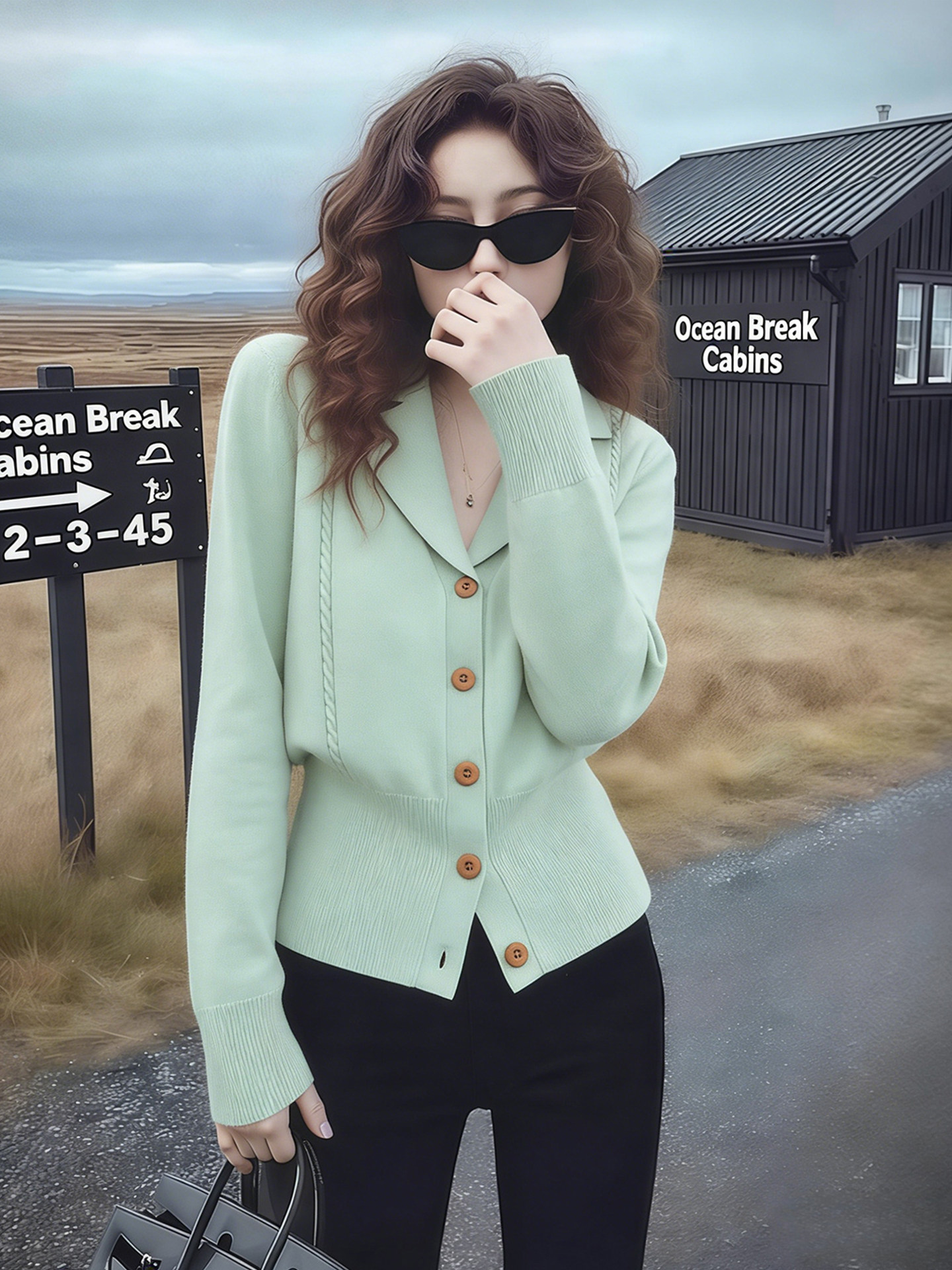 밝은 녹색 쿠바 칼라 허리 수축 긴팔 니트 오픈 가디건 2026 봄 한국 스타일 고유 한 아름다운 miu 첨부 된 의류 여성