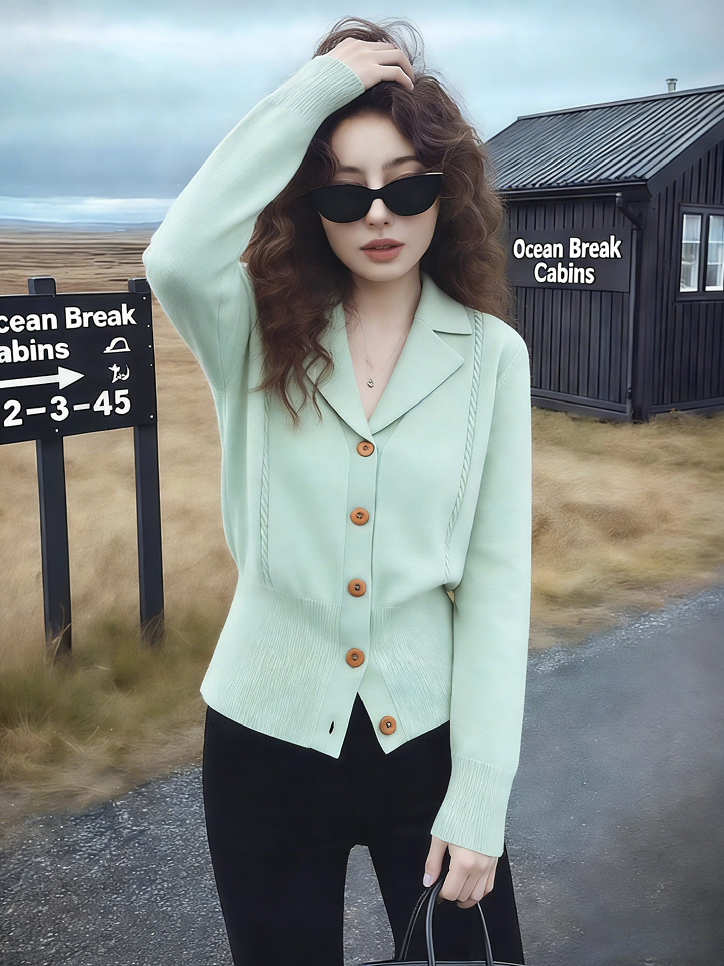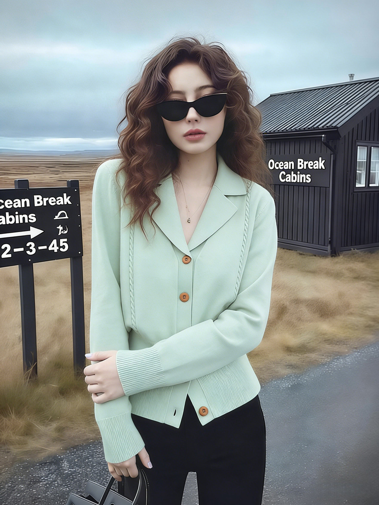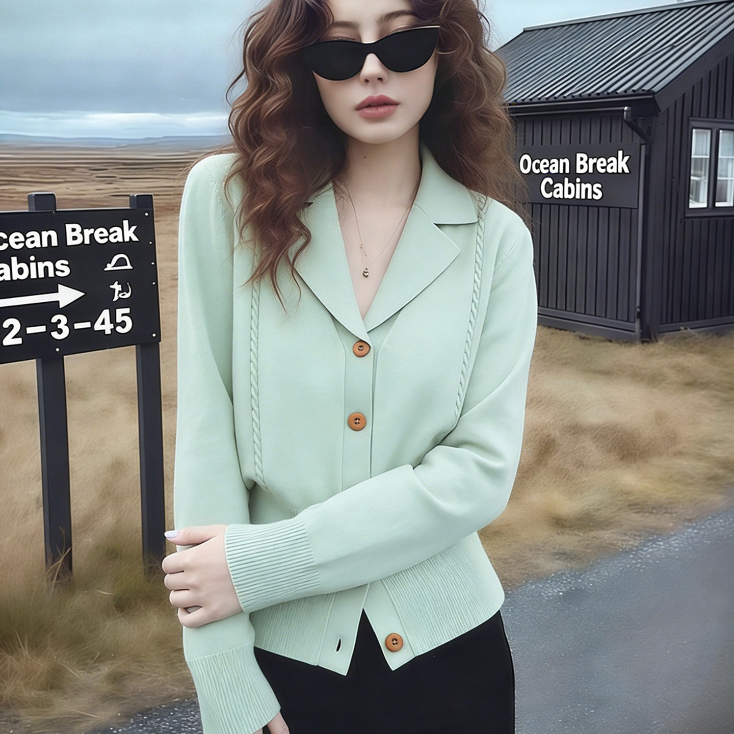 밝은 녹색 쿠바 칼라 허리 수축 긴팔 니트 오픈 가디건 2026 봄 한국 스타일 고유 한 아름다운 miu 첨부 된 의류 여성