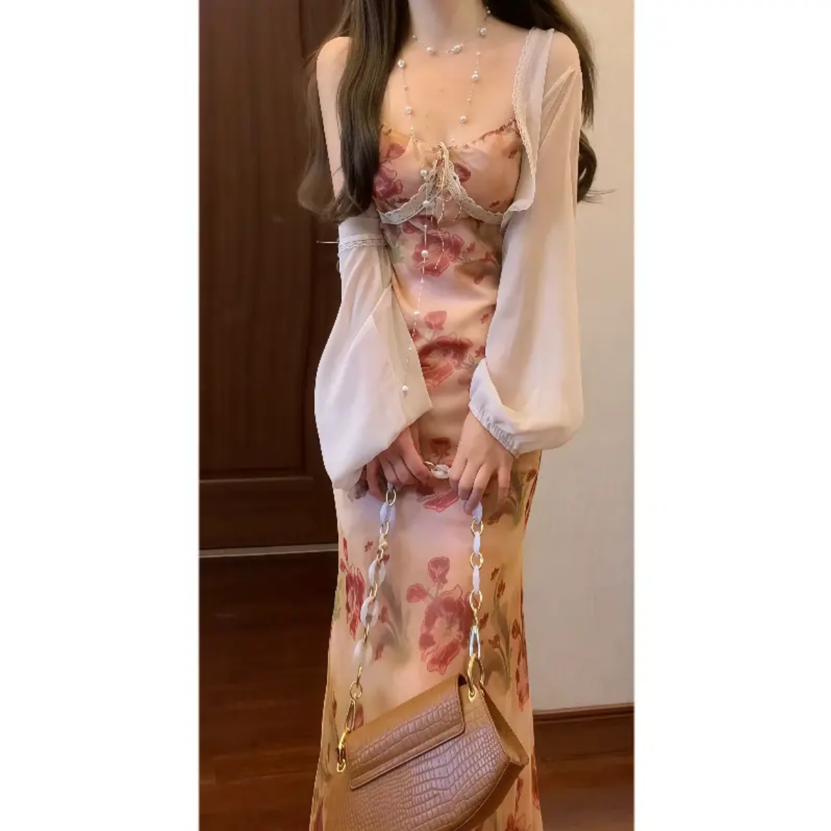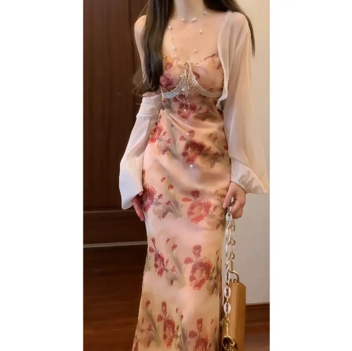 실사 프랑스식 꽃무늬 슬립 드레스 코디 자외선 차단 오픈 가디건 투피스 세트