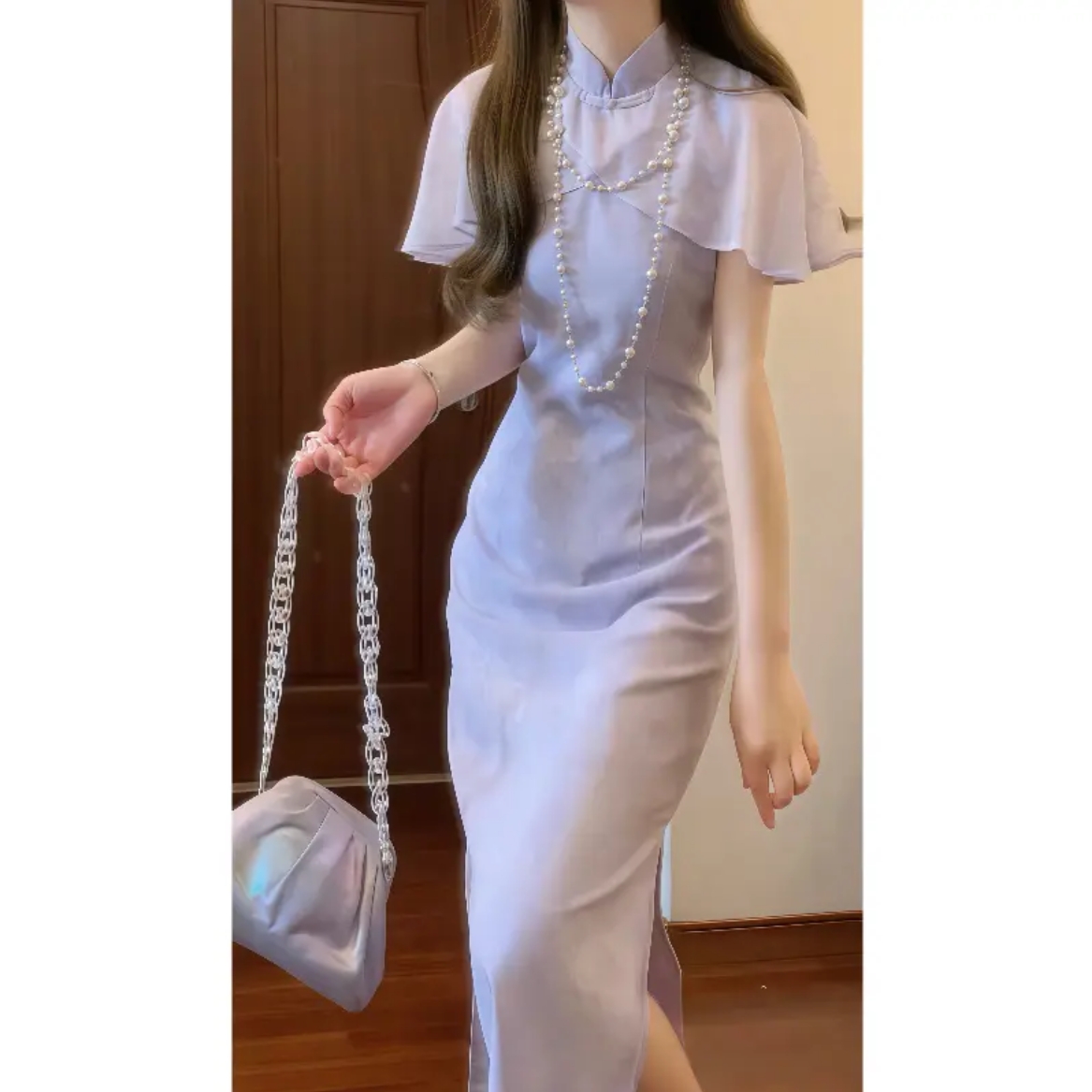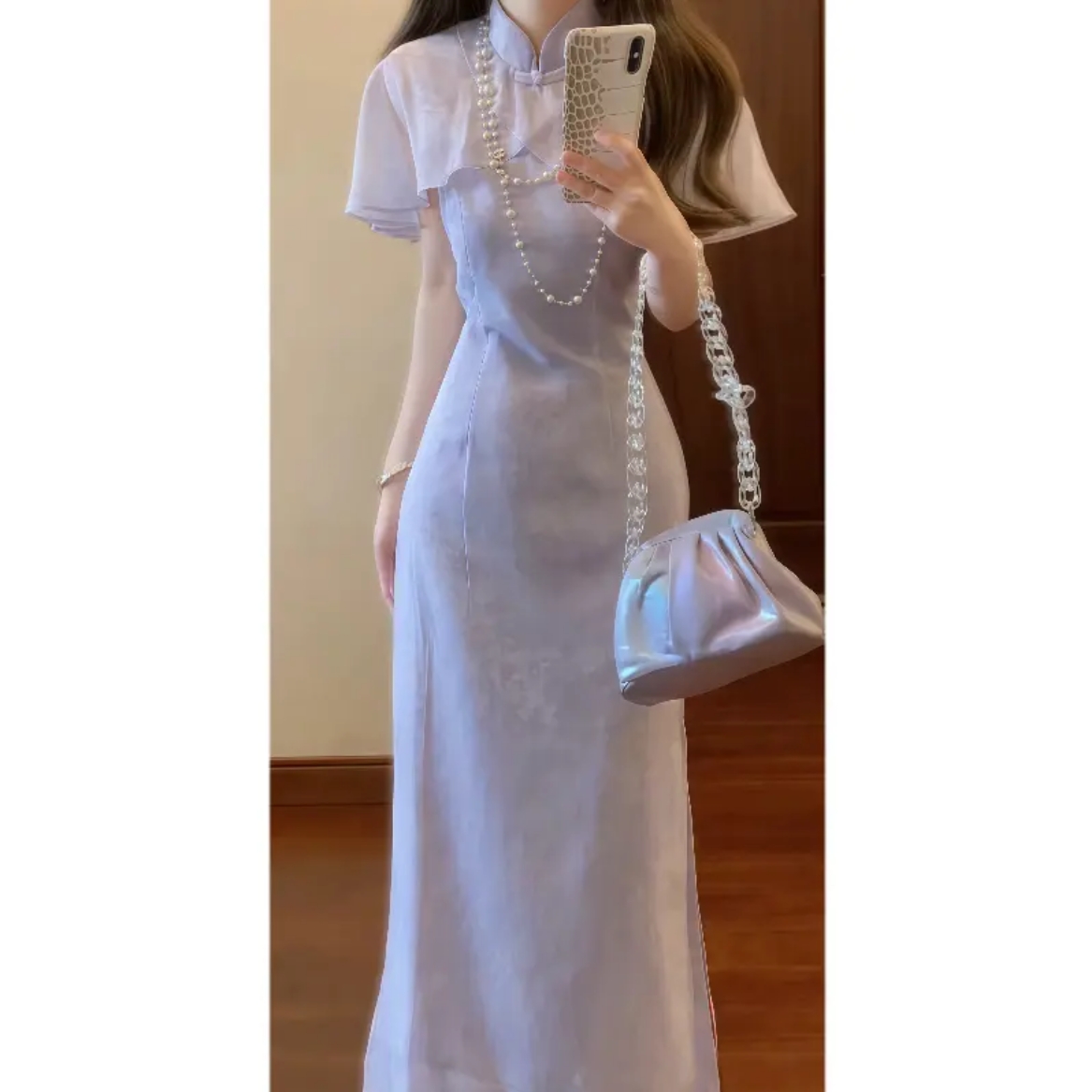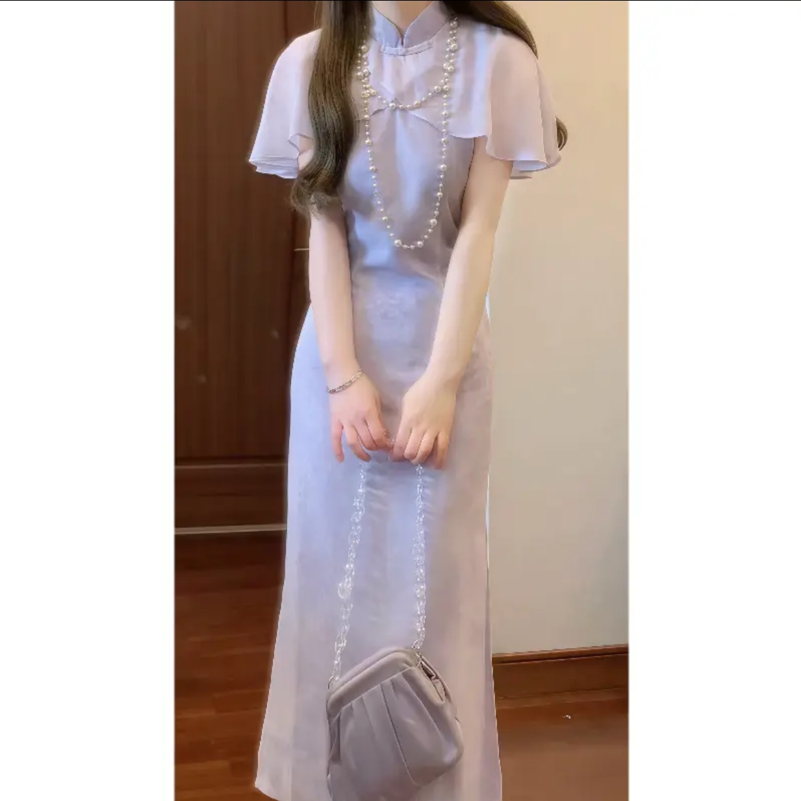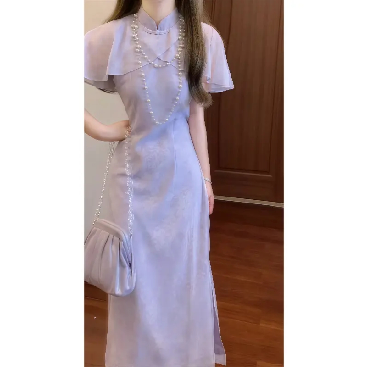 실사 보라색 가스 치파오 드레스 개선 쉬폰 드레스 여름 보통 웨어러블 영 섹션 첫사랑 품격 치마