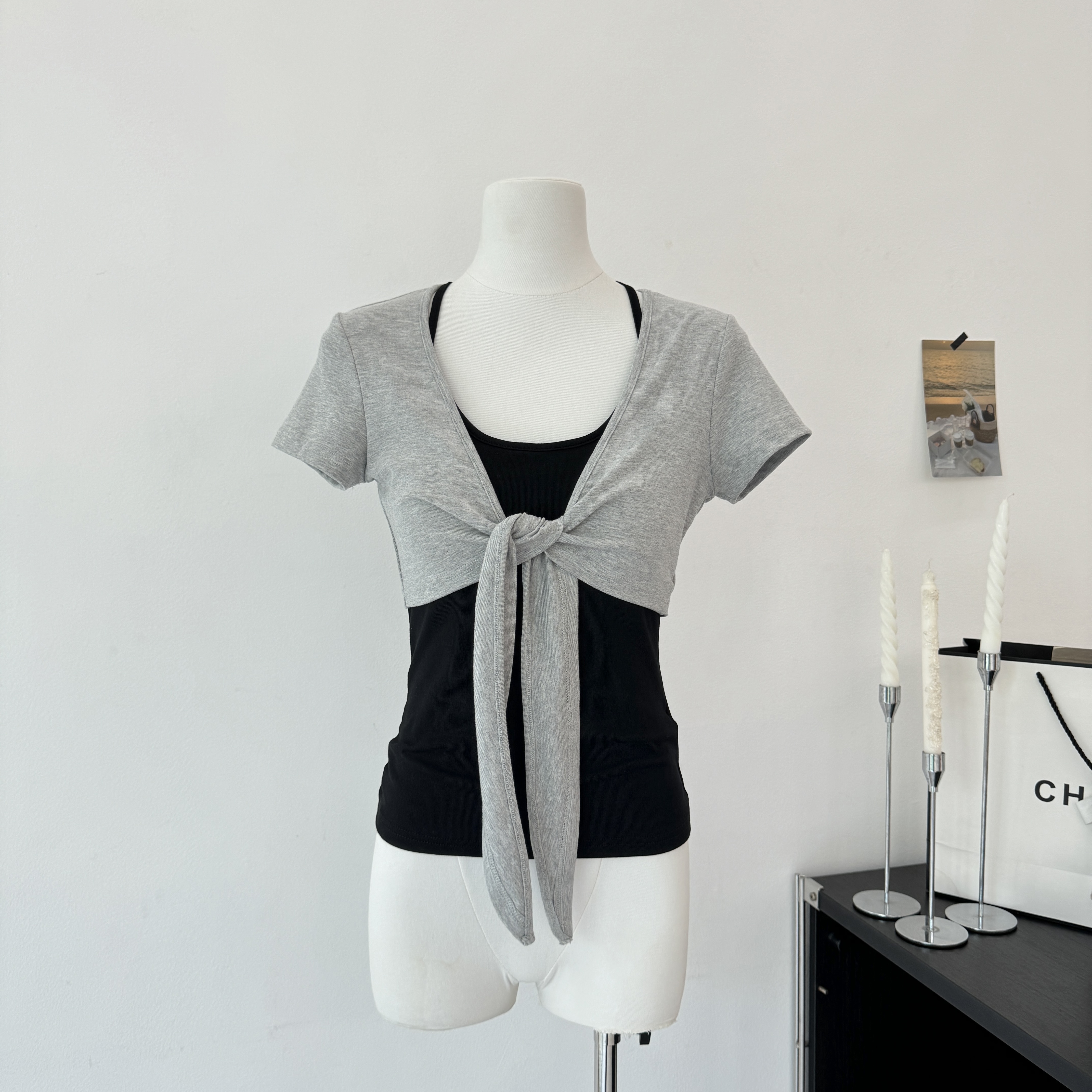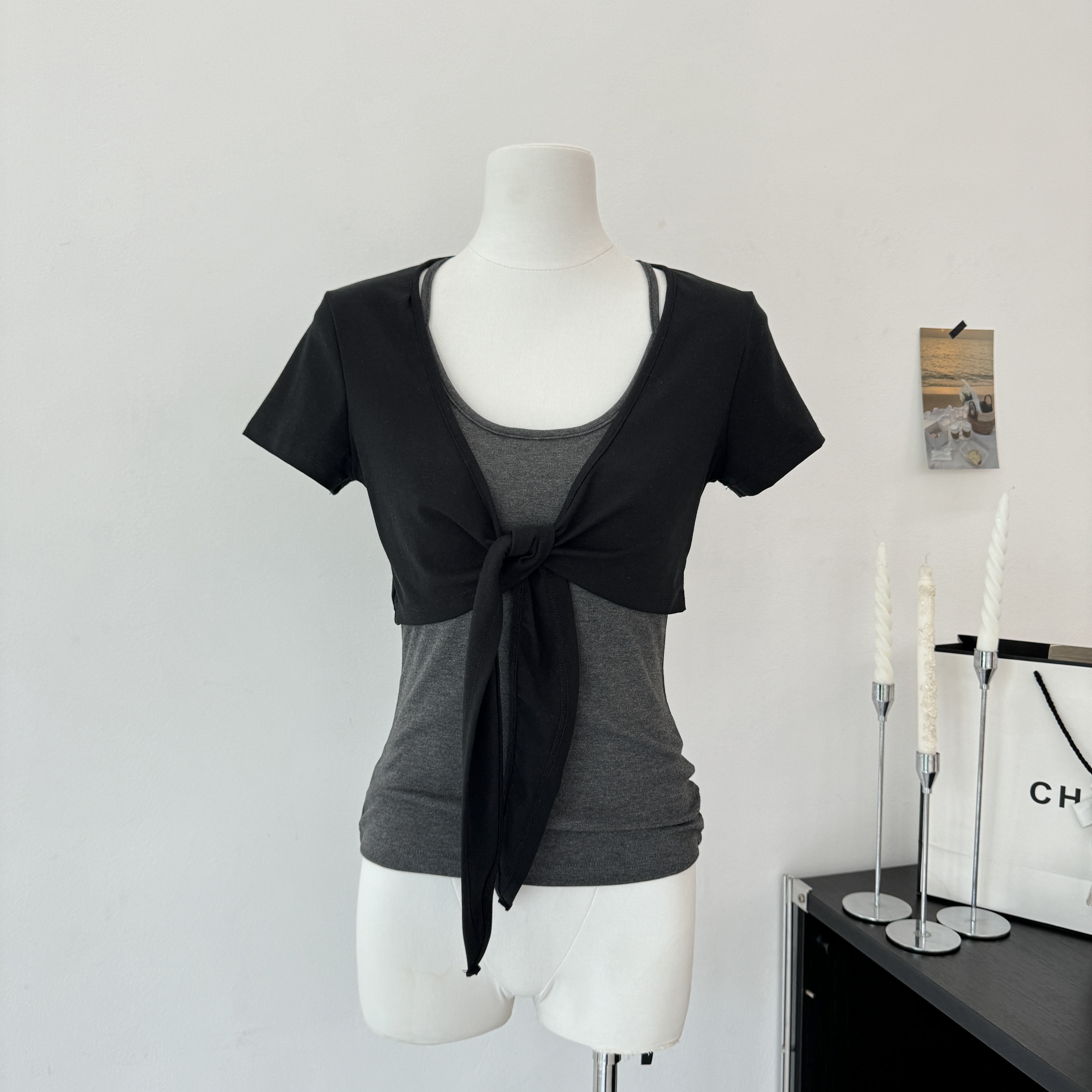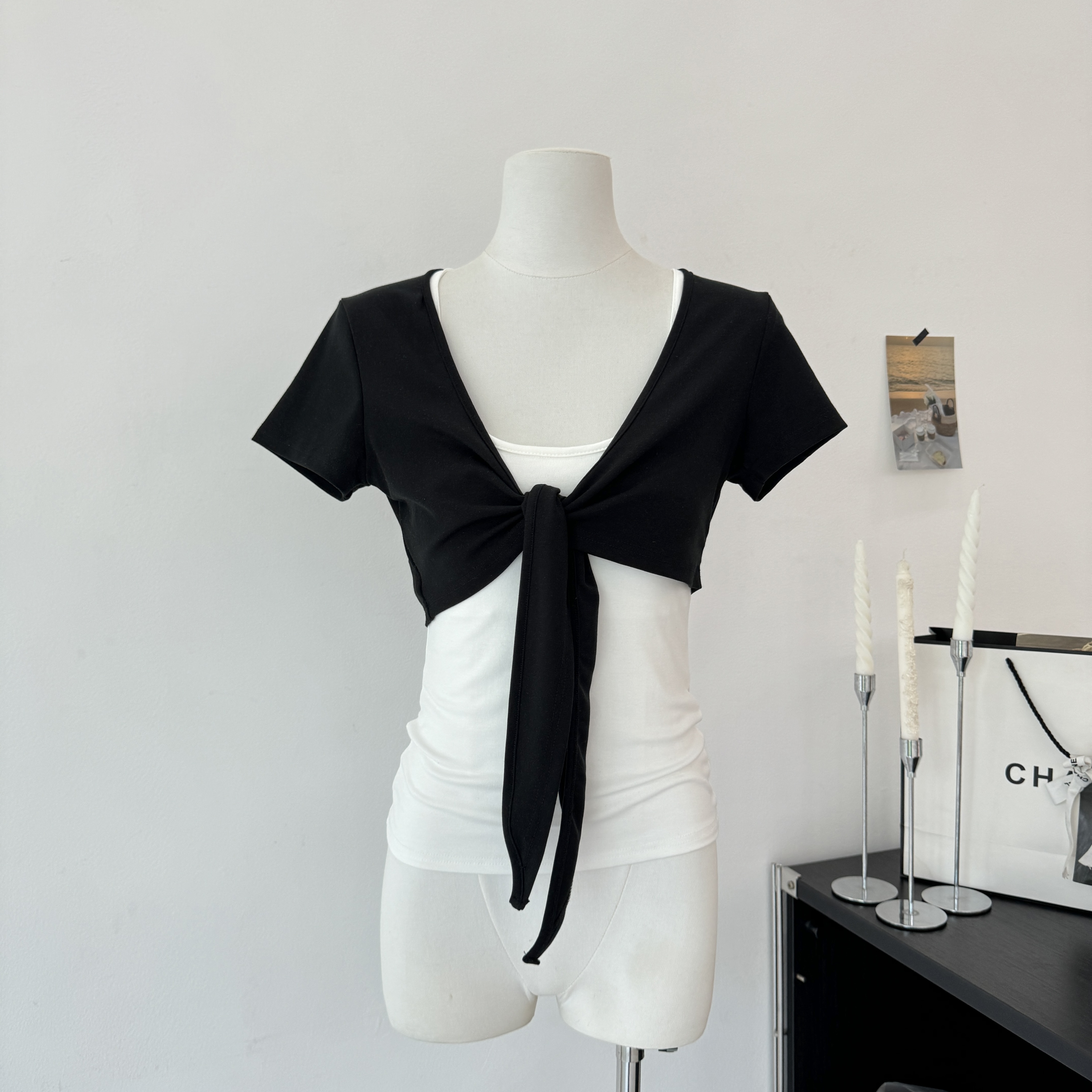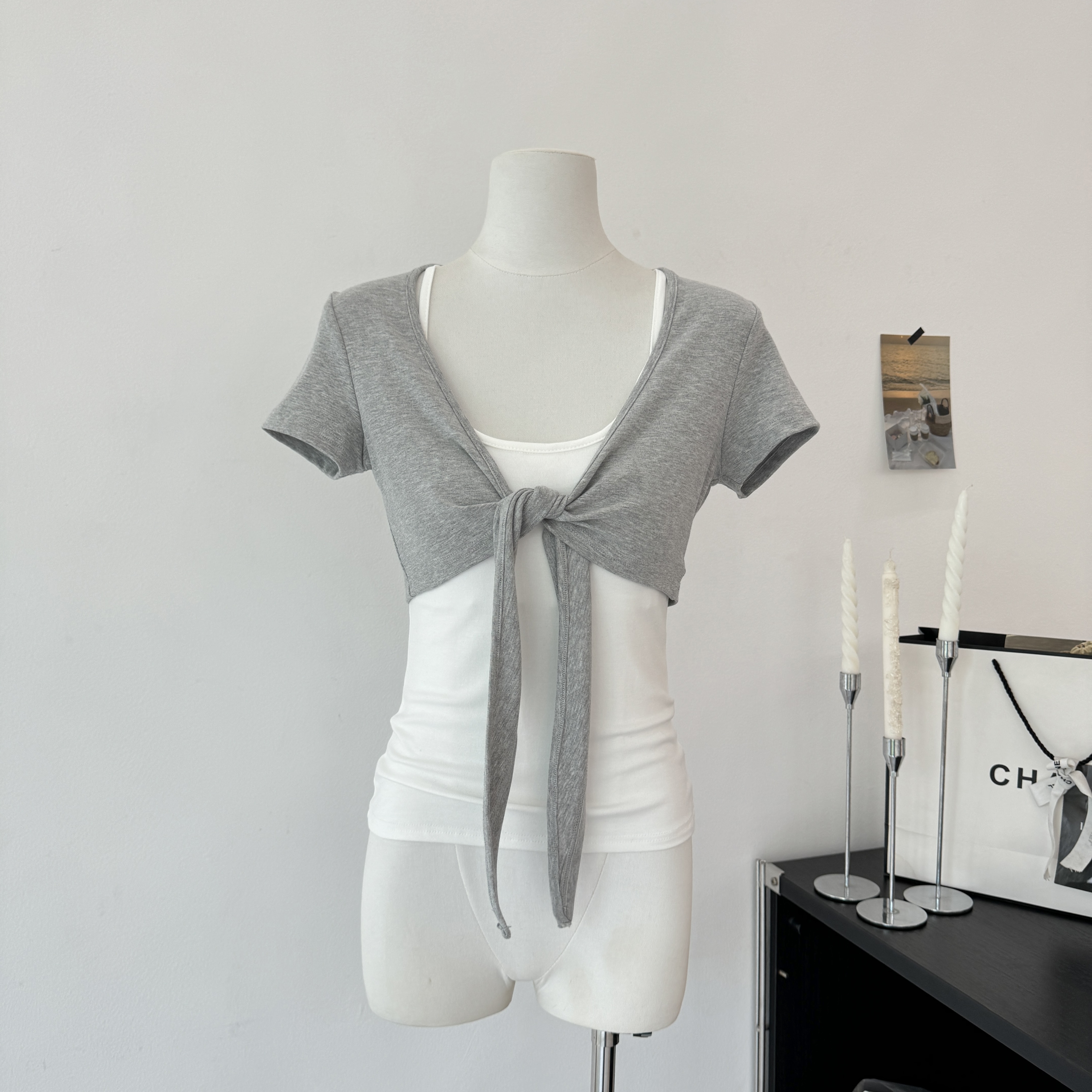 laareetoo 3 색 스트랩 반팔 오픈 가디건 여성 여름 루즈핏 없음 칼라 다용도 디자인 센스 쇼트 스타일 맨위