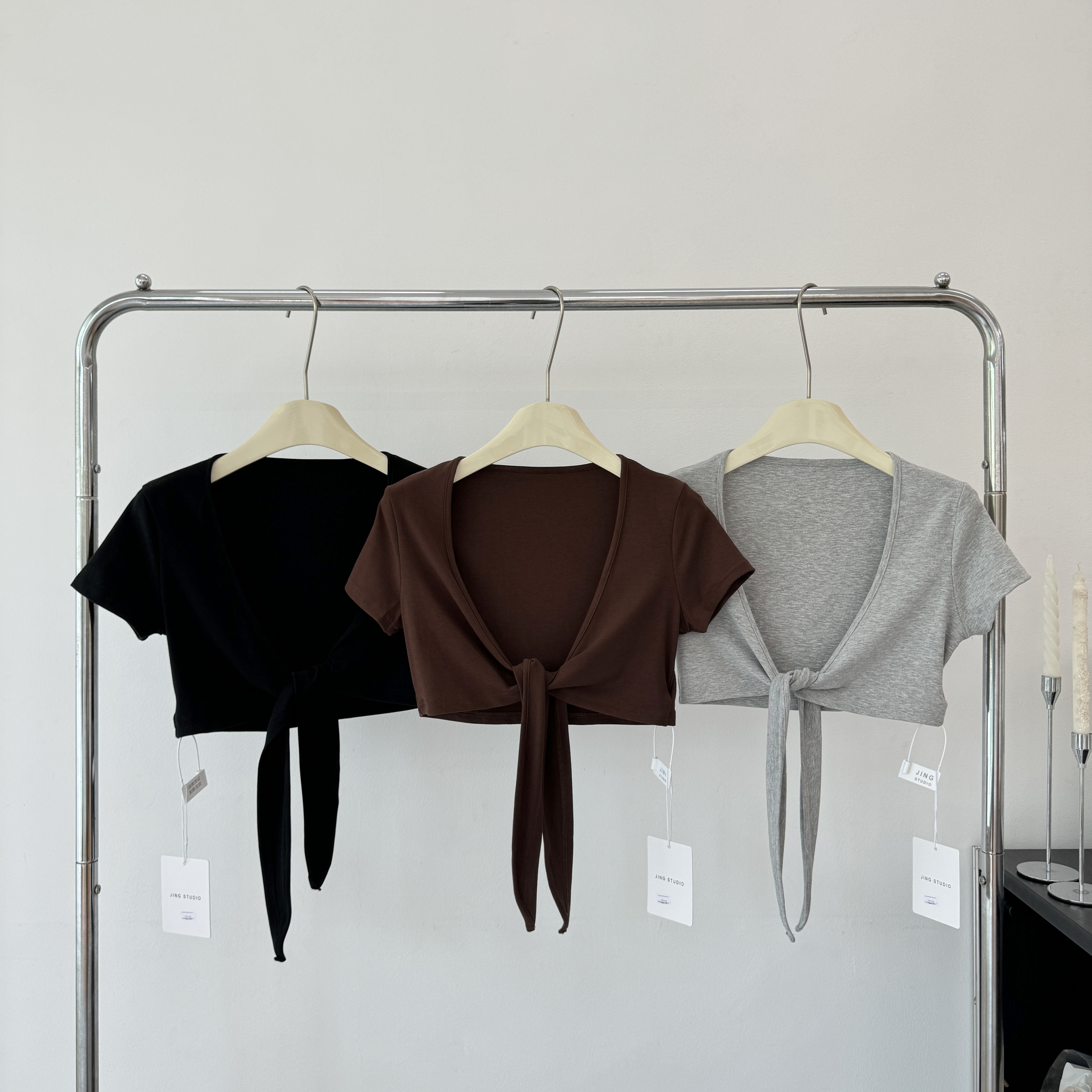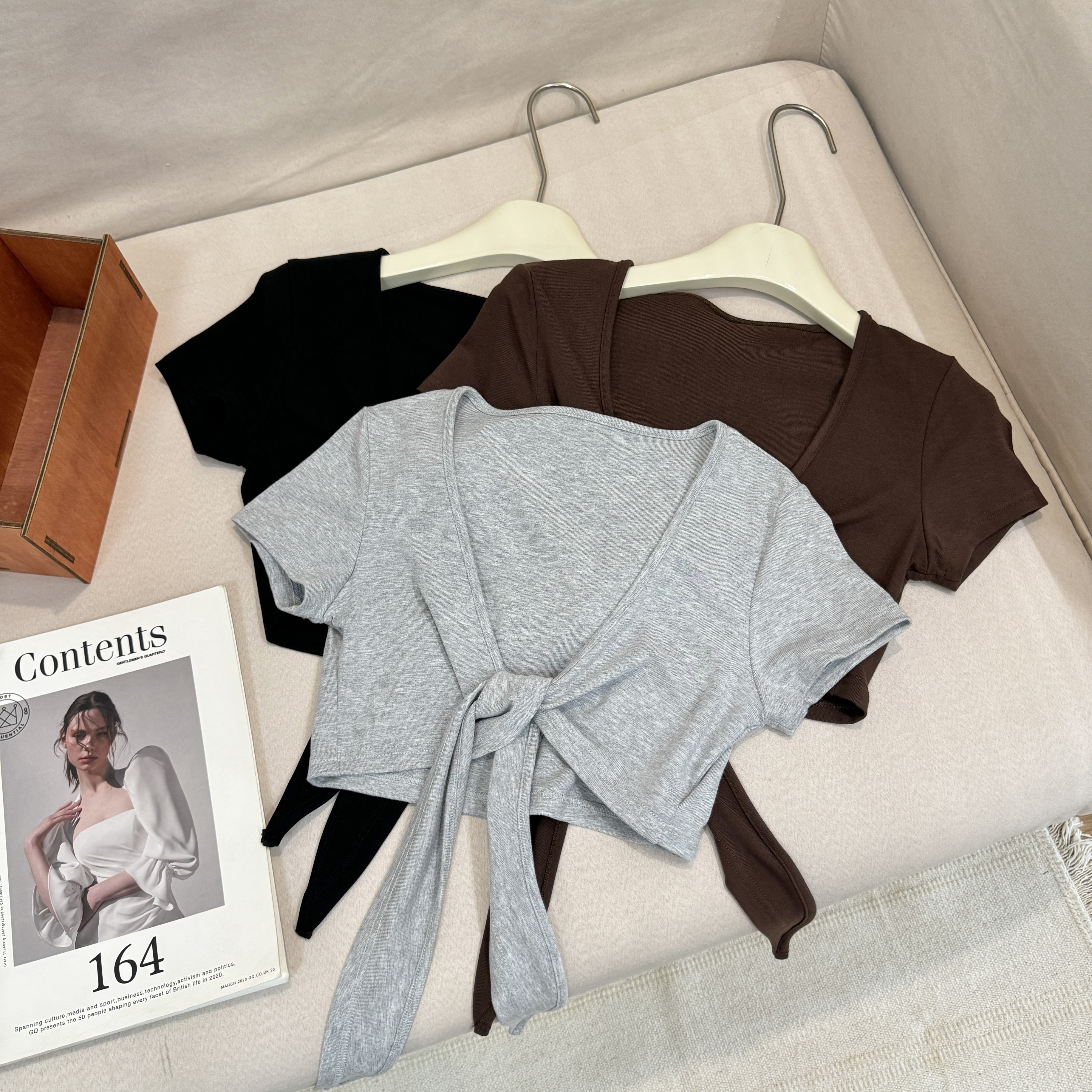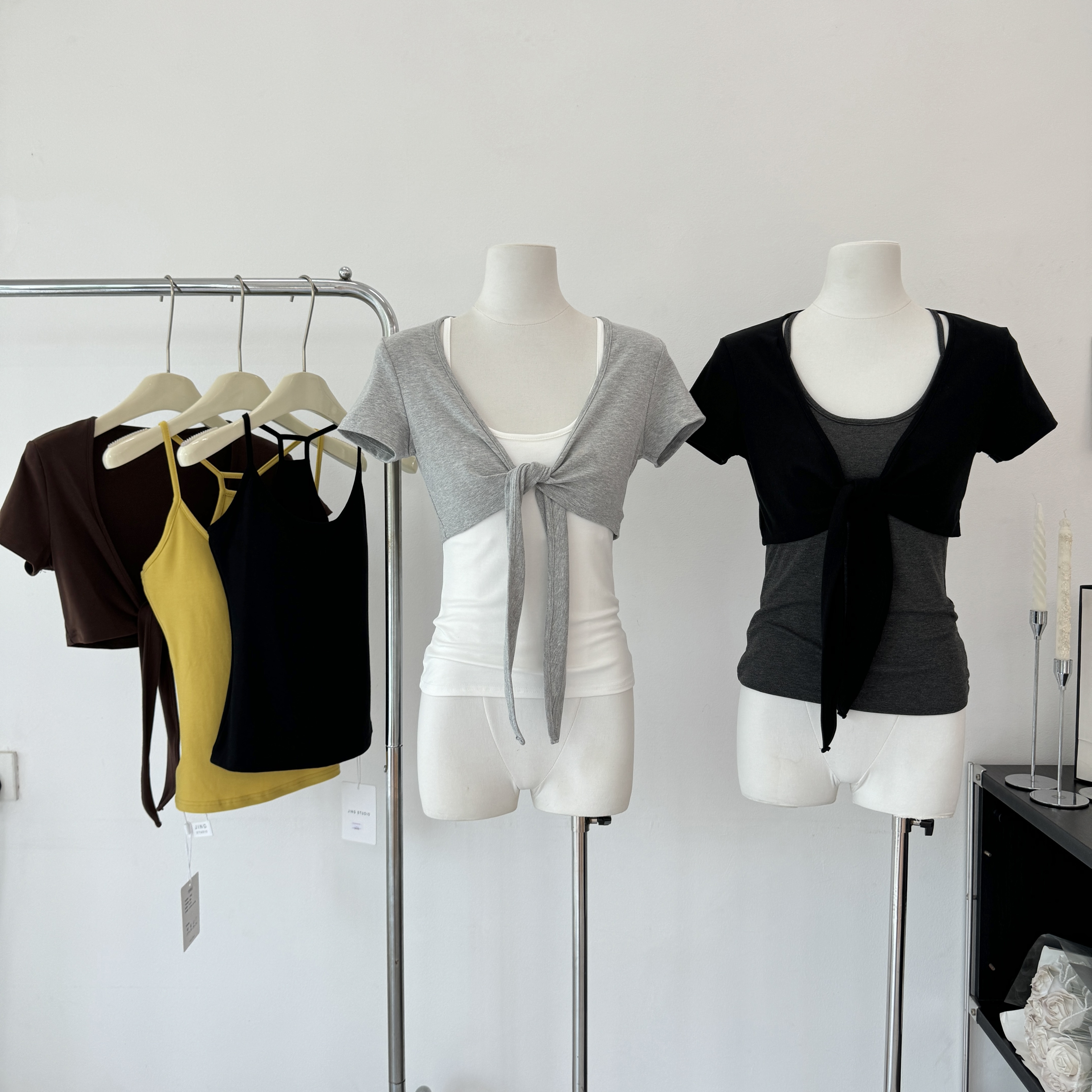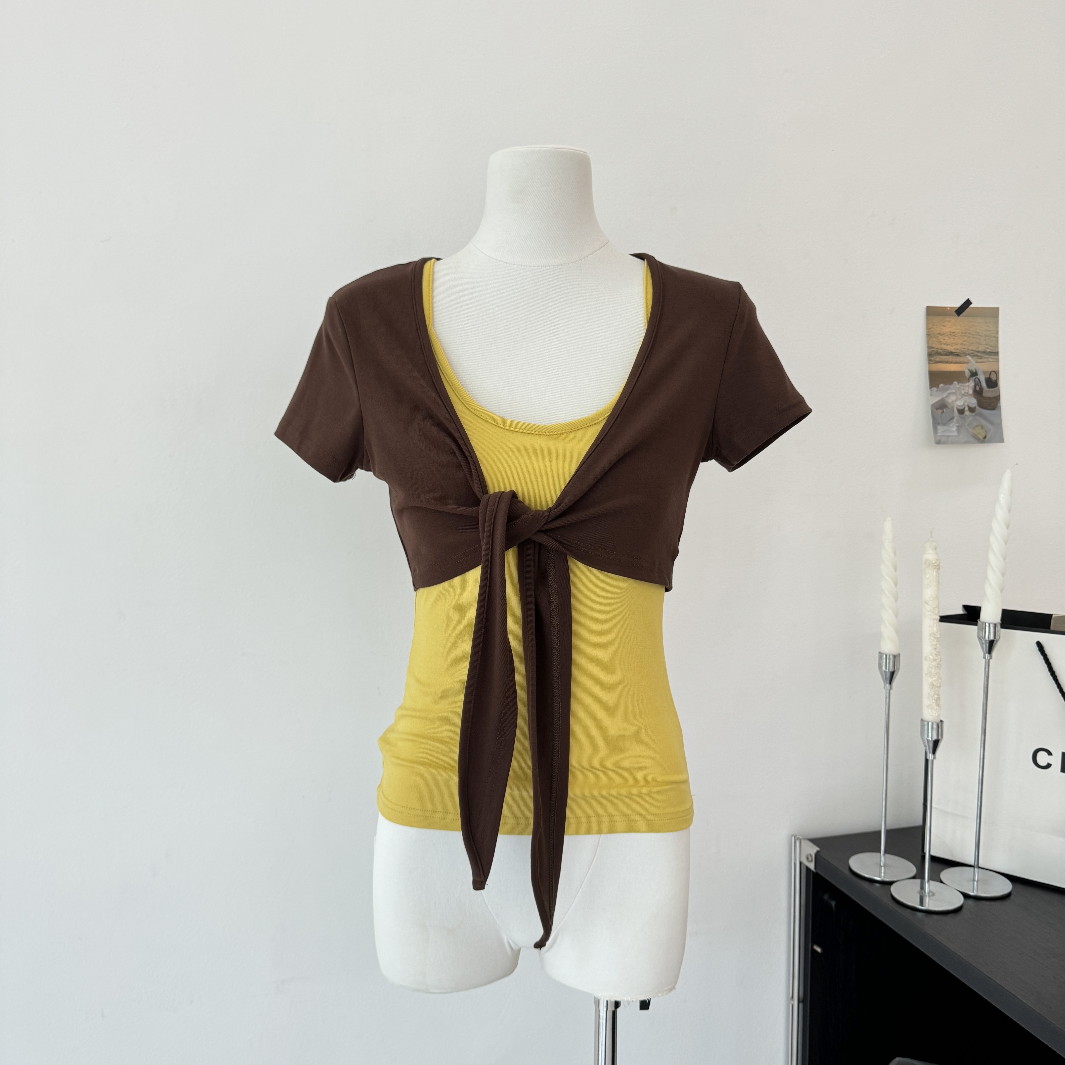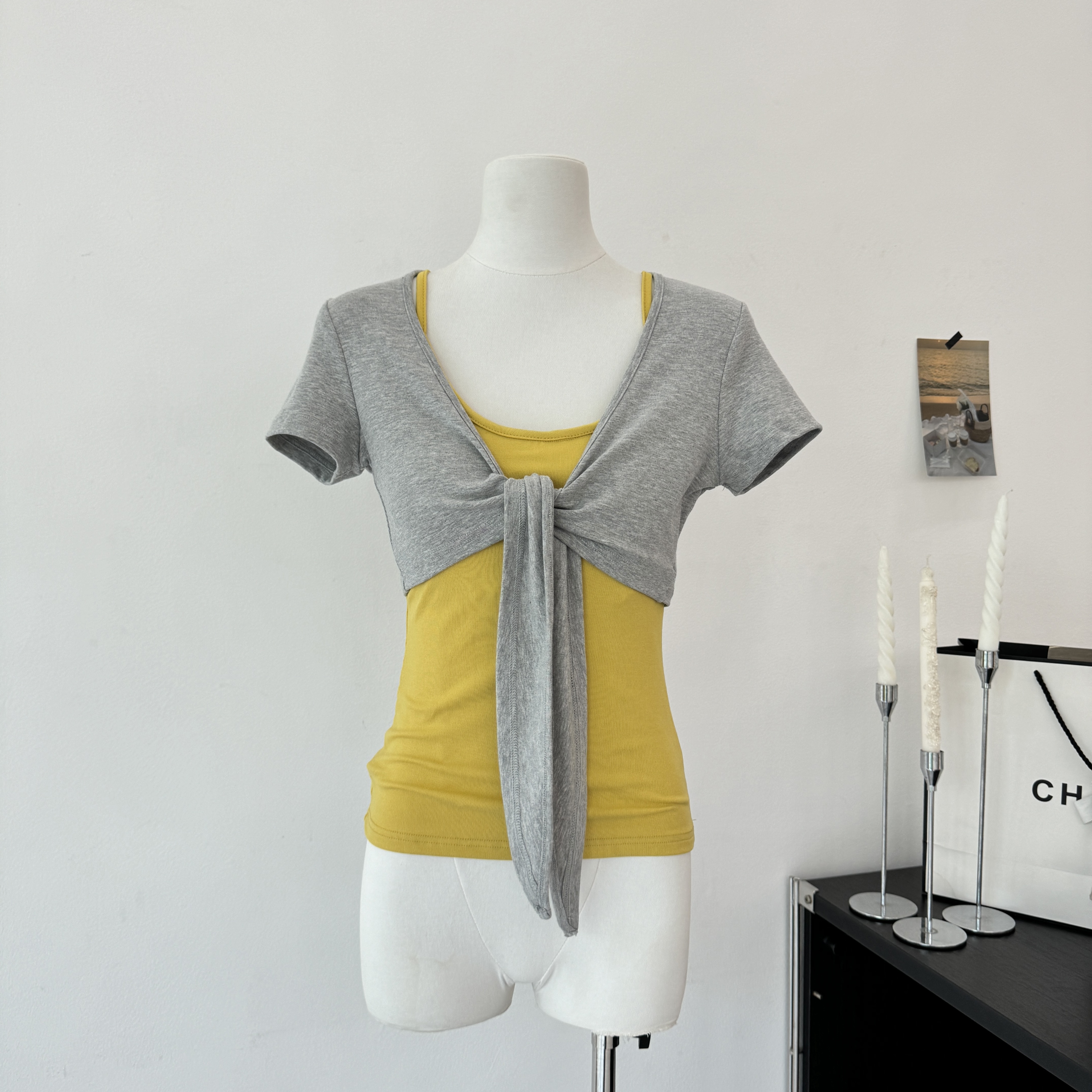 laareetoo 3 색 스트랩 반팔 오픈 가디건 여성 여름 루즈핏 없음 칼라 다용도 디자인 센스 쇼트 스타일 맨위