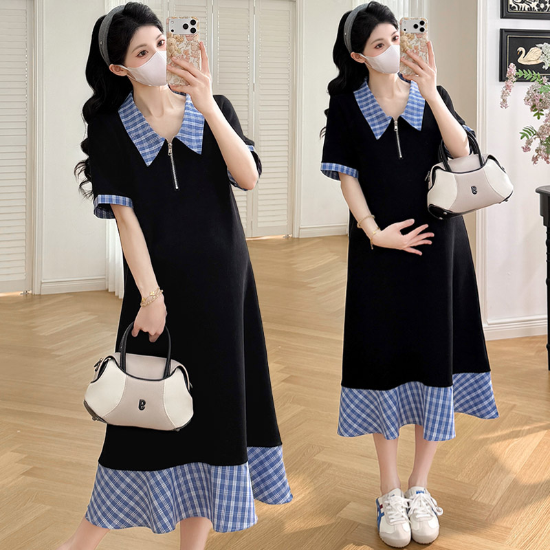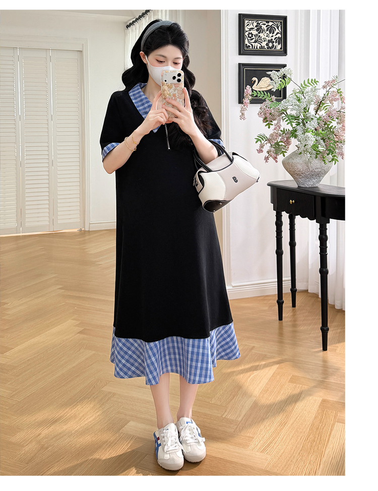 실사 임산부 여름 새로운 한국 스타일 패션 연령 감소 작은 청신 패치워크 페이크 레이어드 빅 사이즈 드레스