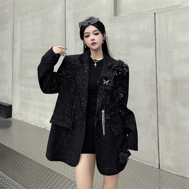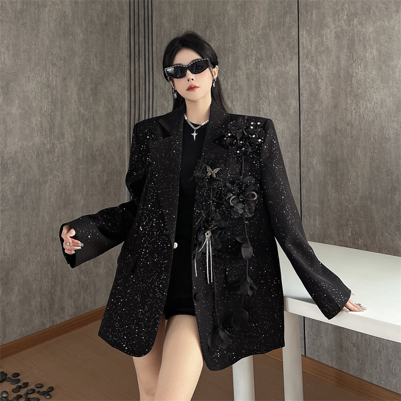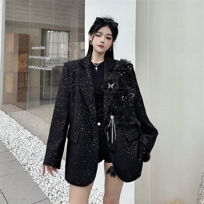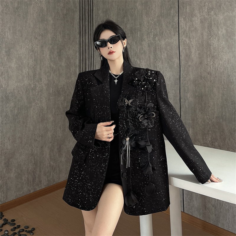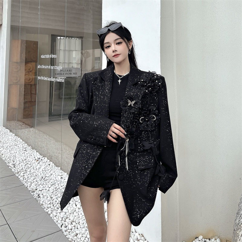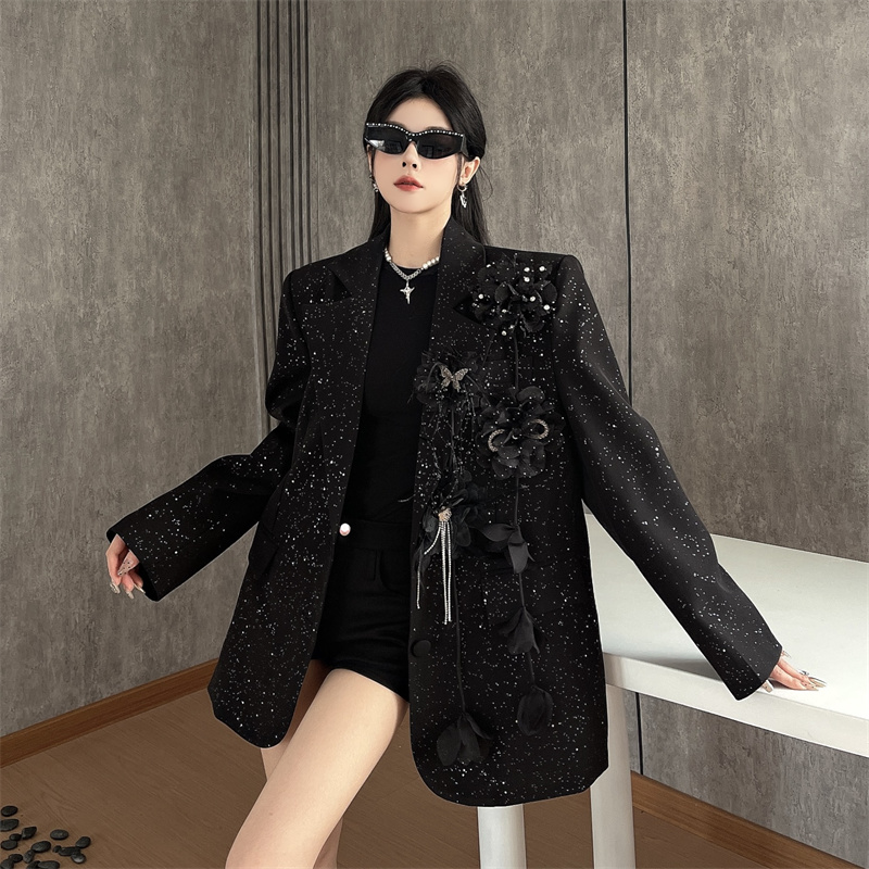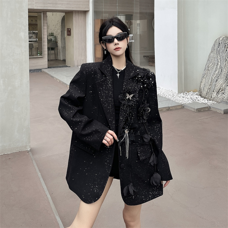 실사 Gypsophila 뿌리다 분말 디자인 센스 검정색 정장 여성 코트 다림질 금박 반짝임 고급 센스 정장 트렌디