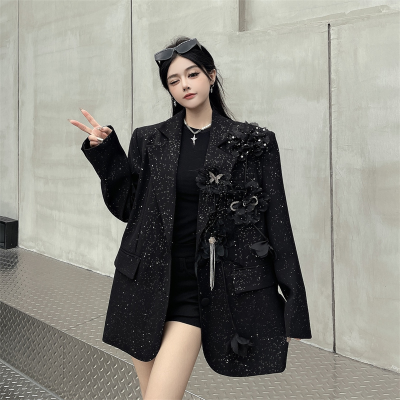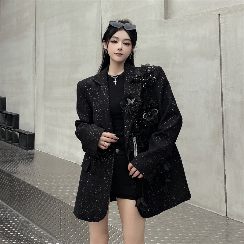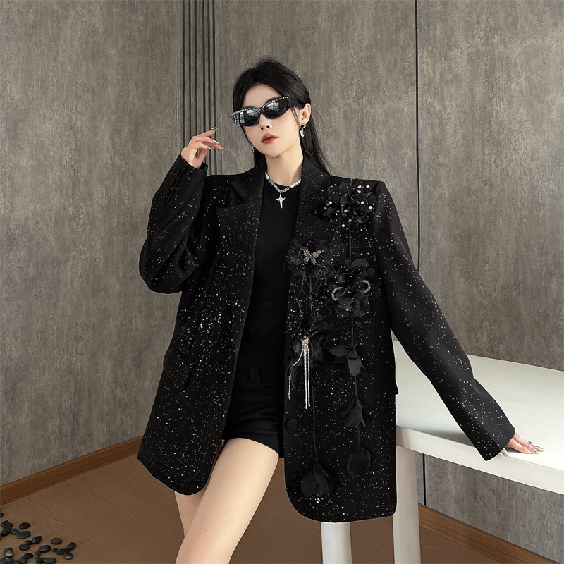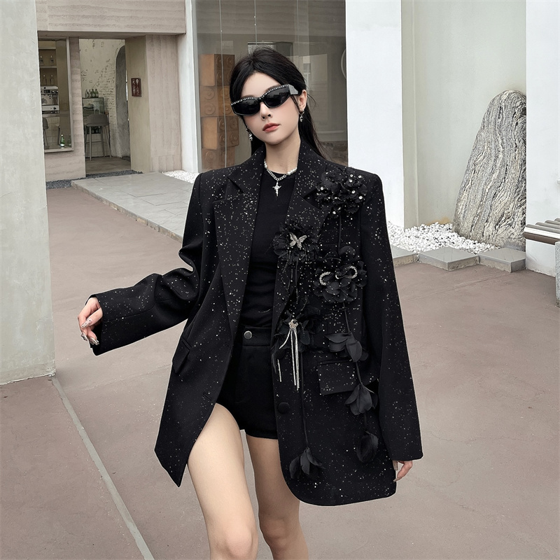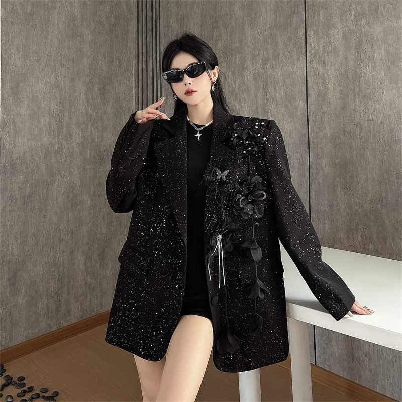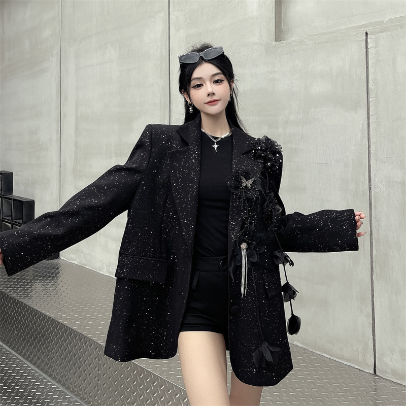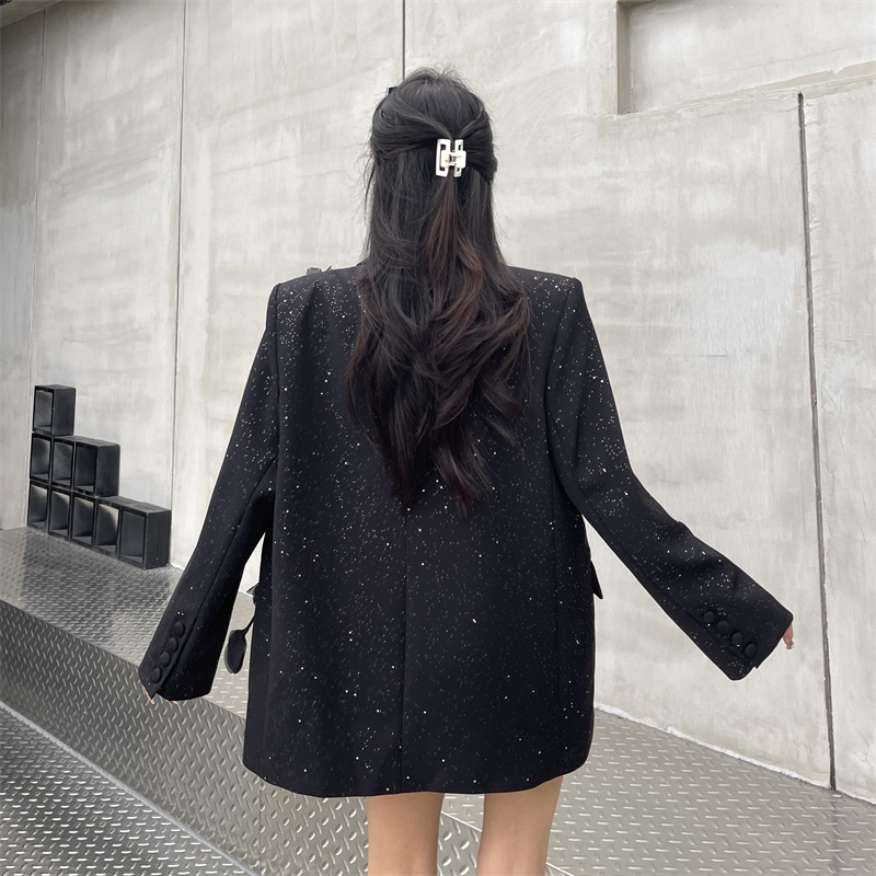 실사 Gypsophila 뿌리다 분말 디자인 센스 검정색 정장 여성 코트 다림질 금박 반짝임 고급 센스 정장 트렌디