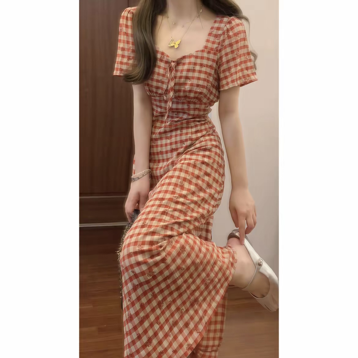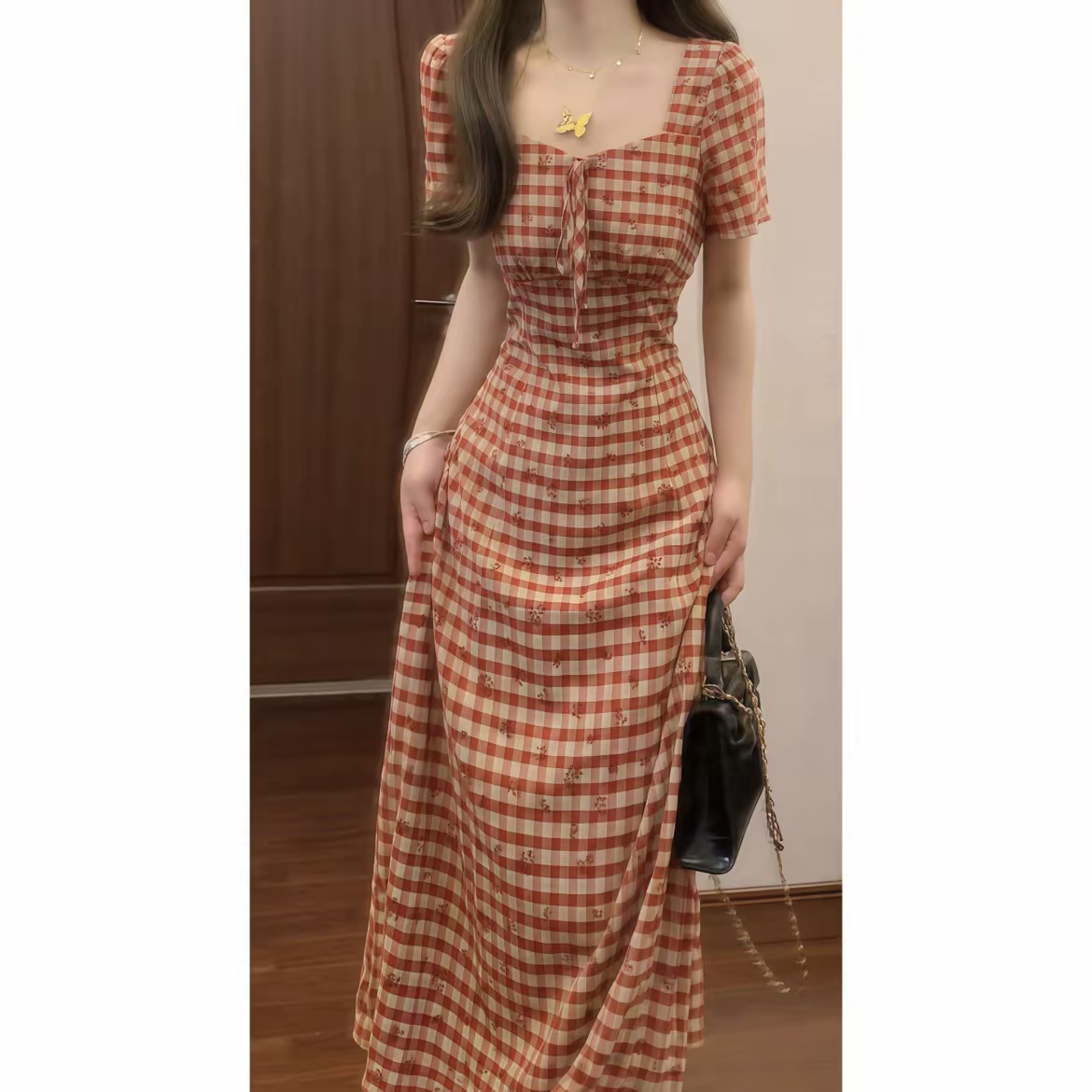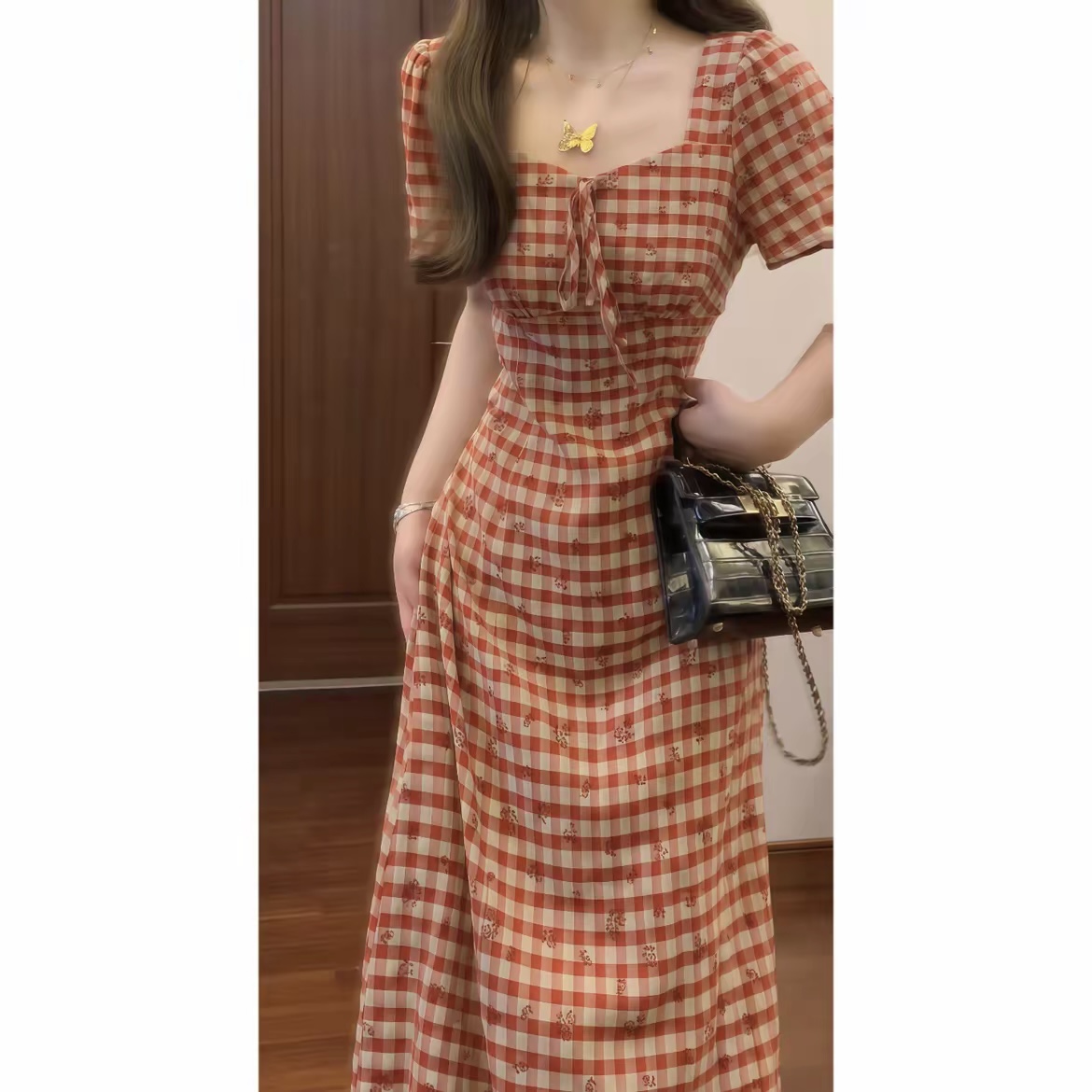실사 체크무늬 여성 드레스 2026 년 여름 새로운 광장 칼라 허리 수축 슬림해 보이는 롱 코트 치마