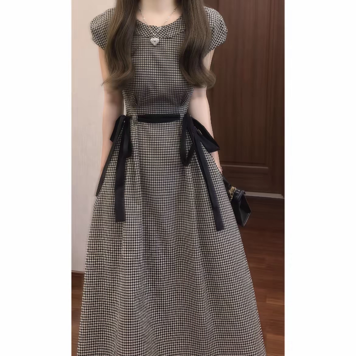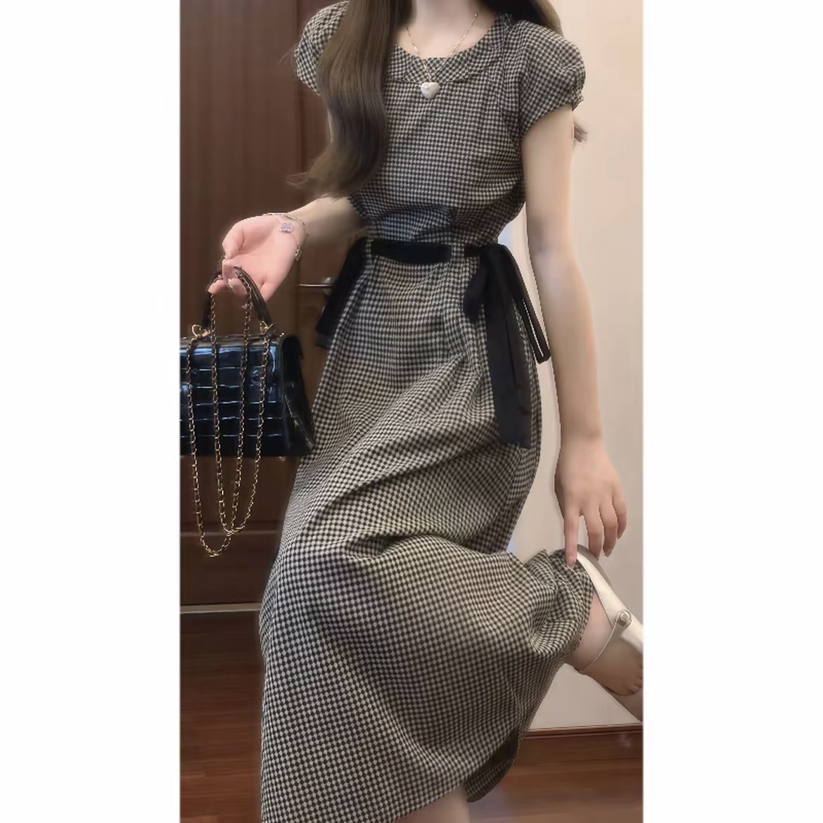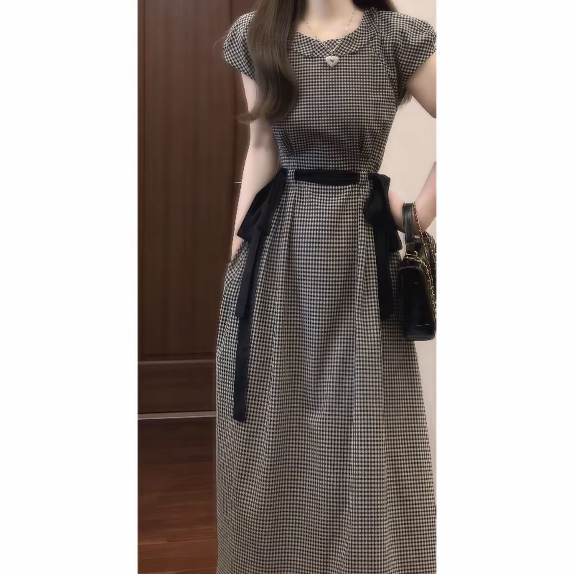 프랑스식 레트로 클래식 흑인과 백인 체크무늬 드레스 거품 소매 펌프 로프 허리 수축 슬림해 보이는 품격 롱 스커트