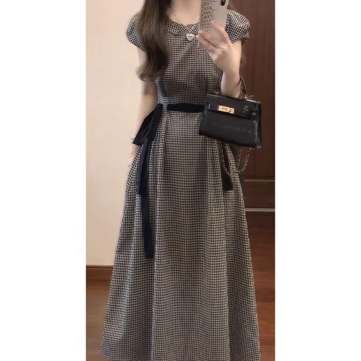 실사 체크무늬 여성 드레스 2026 년 여름 새로운 광장 칼라 허리 수축 슬림해 보이는 롱 코트 치마