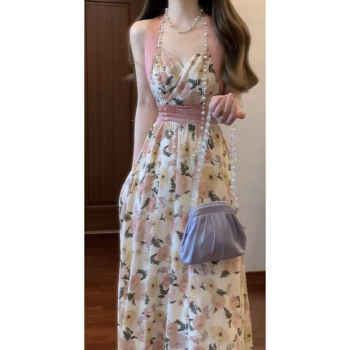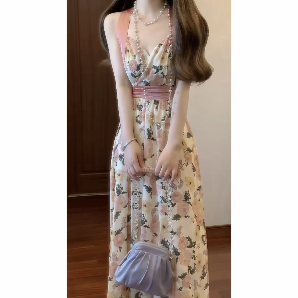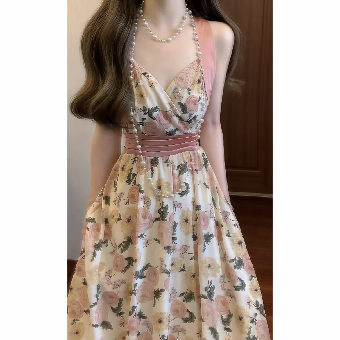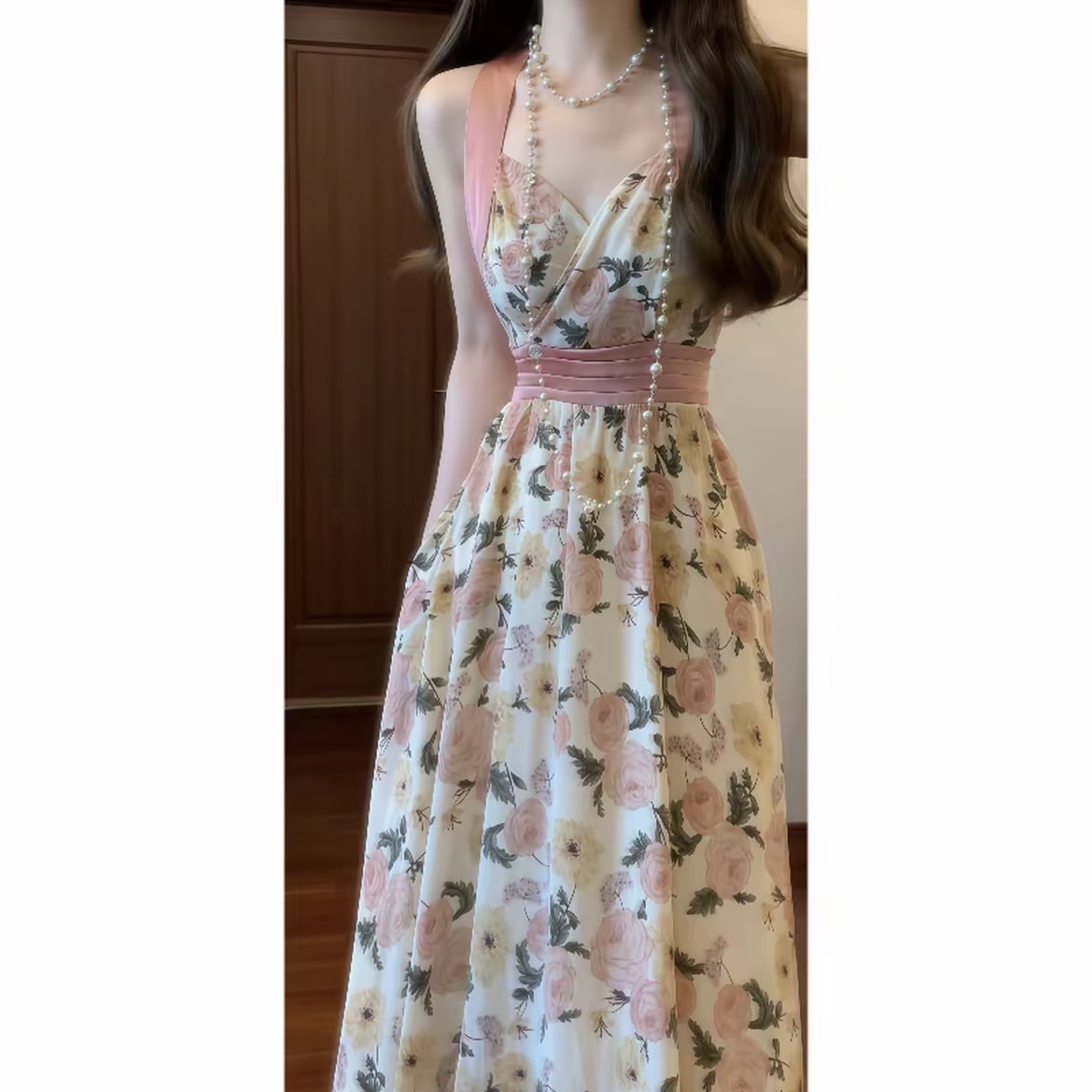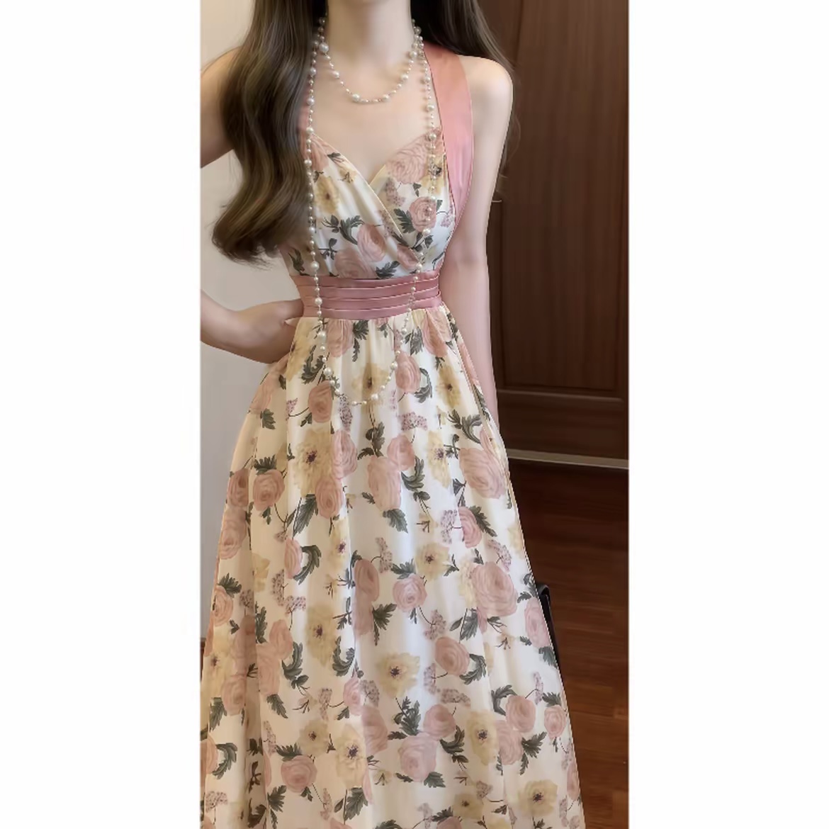 실사 프랑스식 레트로 프린트 V넥 행침 목 슬립 꽃무늬 드레스 휴가 바람 허리 수축 품격 롱 스커트