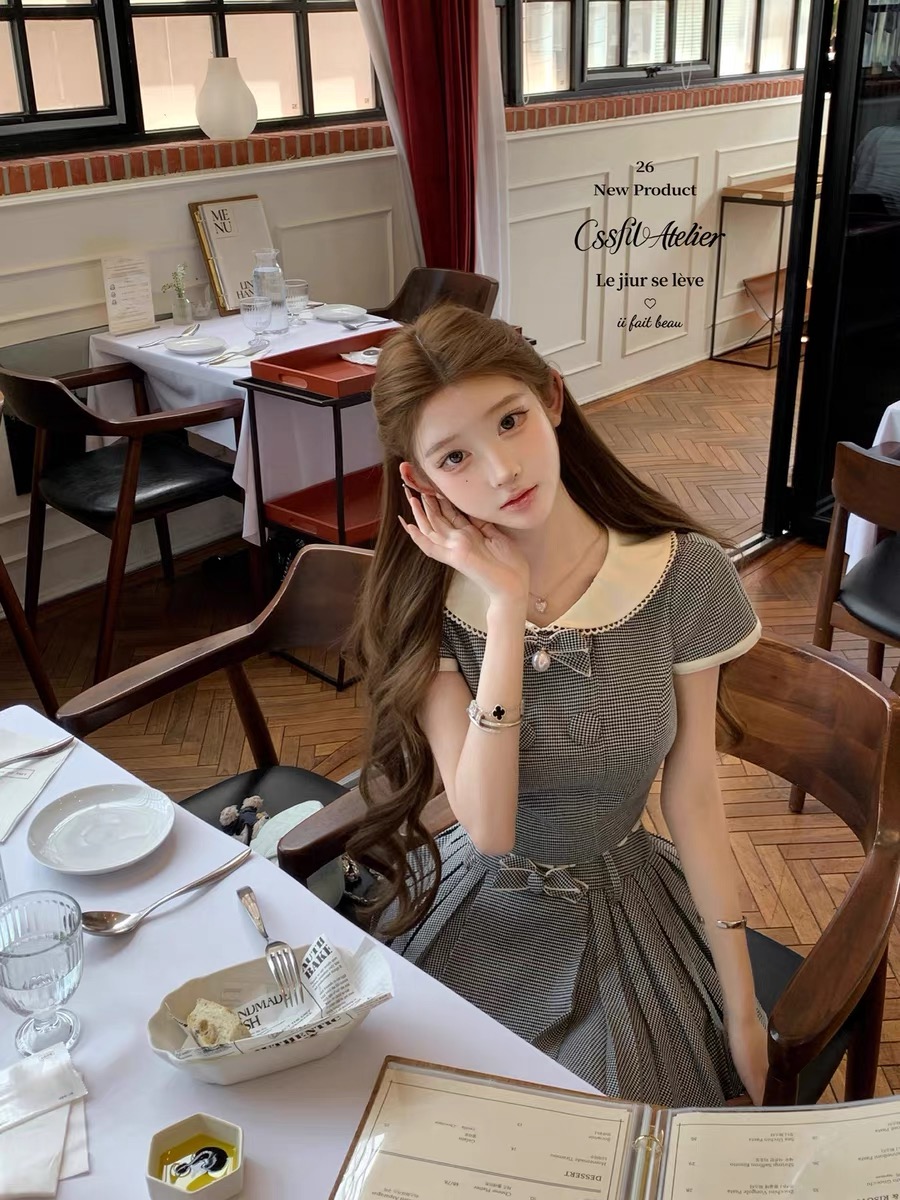 늦게 우산 우산 26 ss 오동 꽃 오래된 언어 배색 피터 팬 칼라 하운드투스 체크 이중 버튼 맨위 반 스커트 세트 그룹