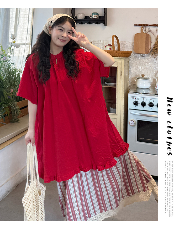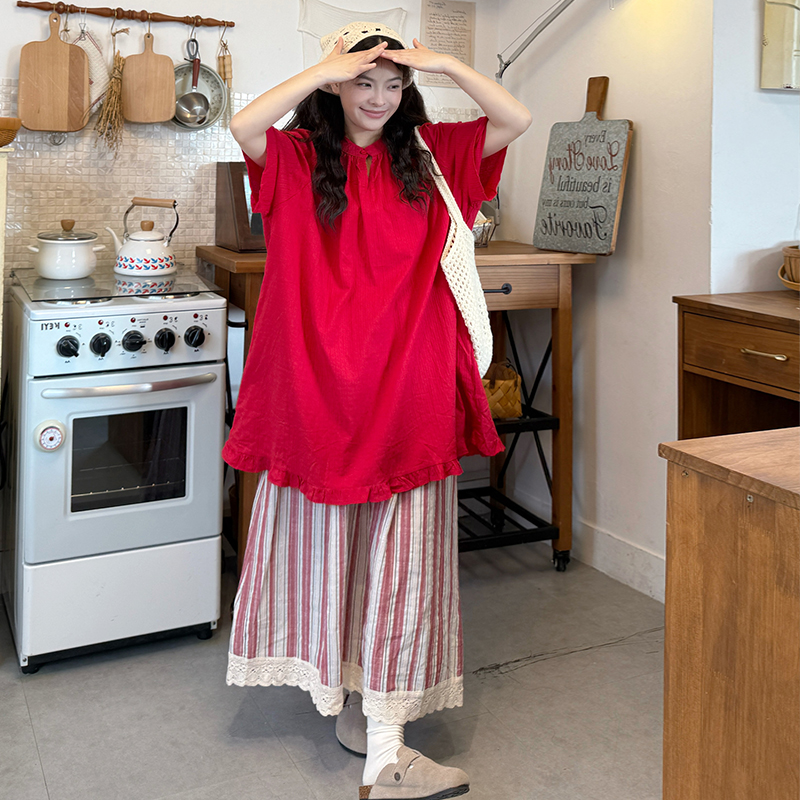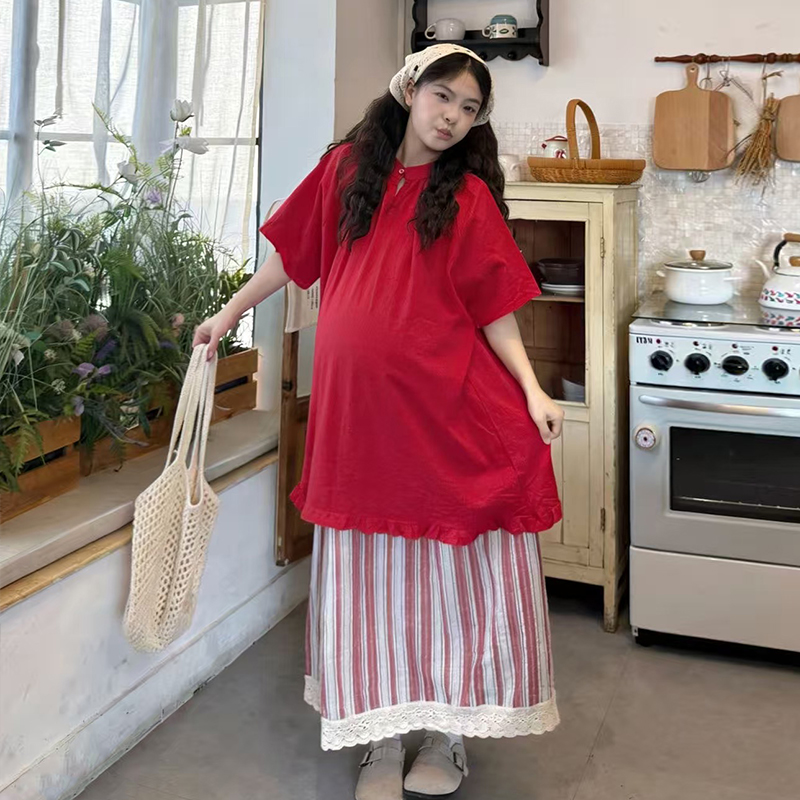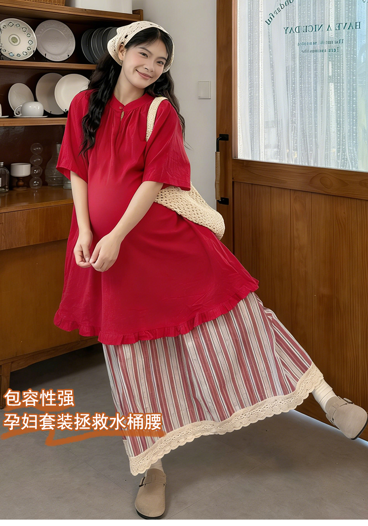 실사 2026 여름 드레스 새로운 빨간색 반팔 셔츠 스트라이프 레이스 반신 치마 세트