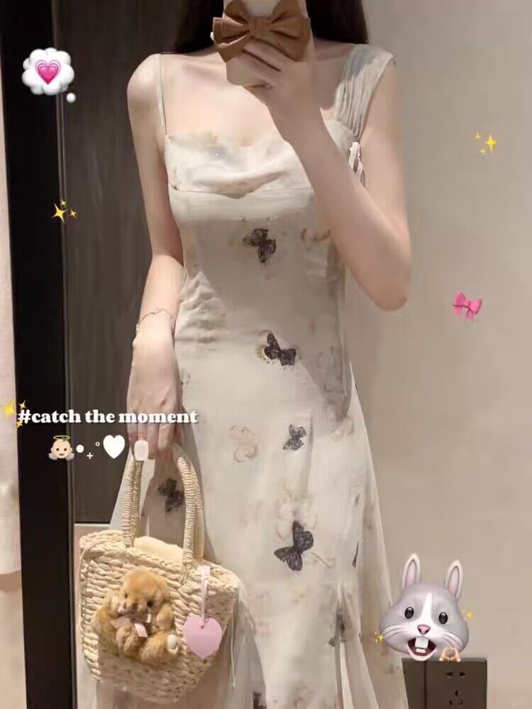 실사 프랑스식 꽃무늬 슬립 드레스 투피스 세트 고급 센스 허리 수축 슬림해 보이는 품격 휴가 바람 요정 롱 스커트