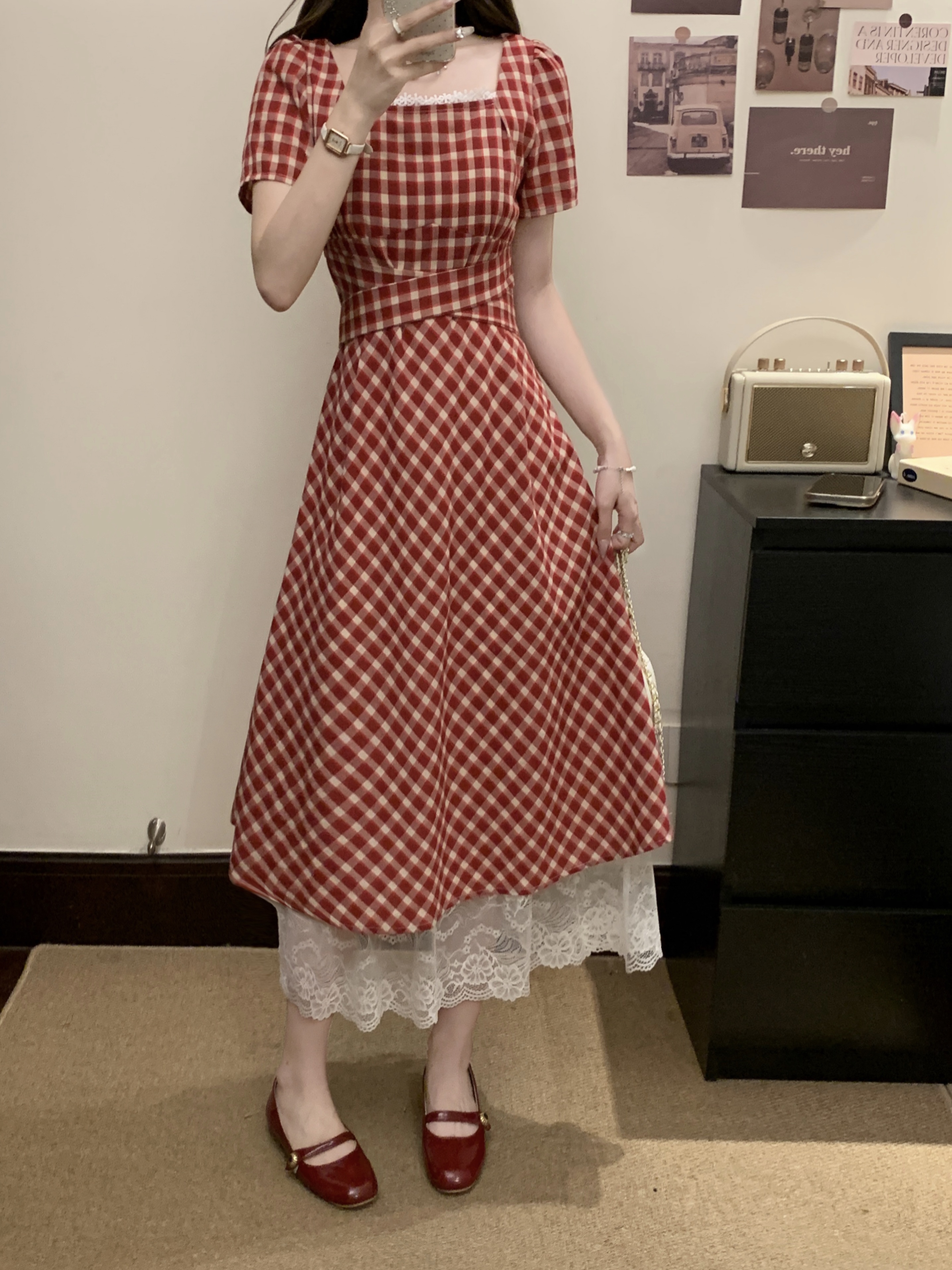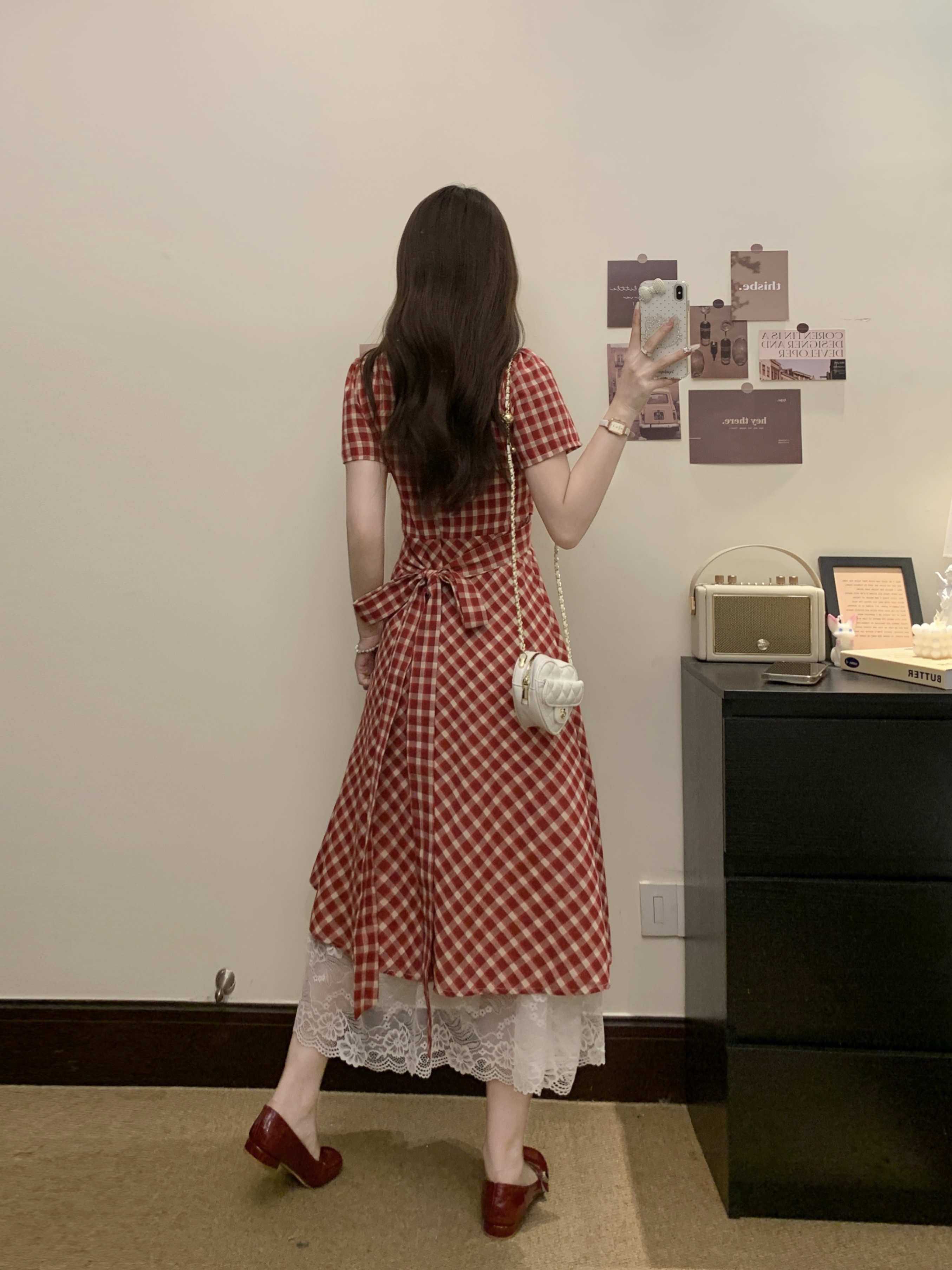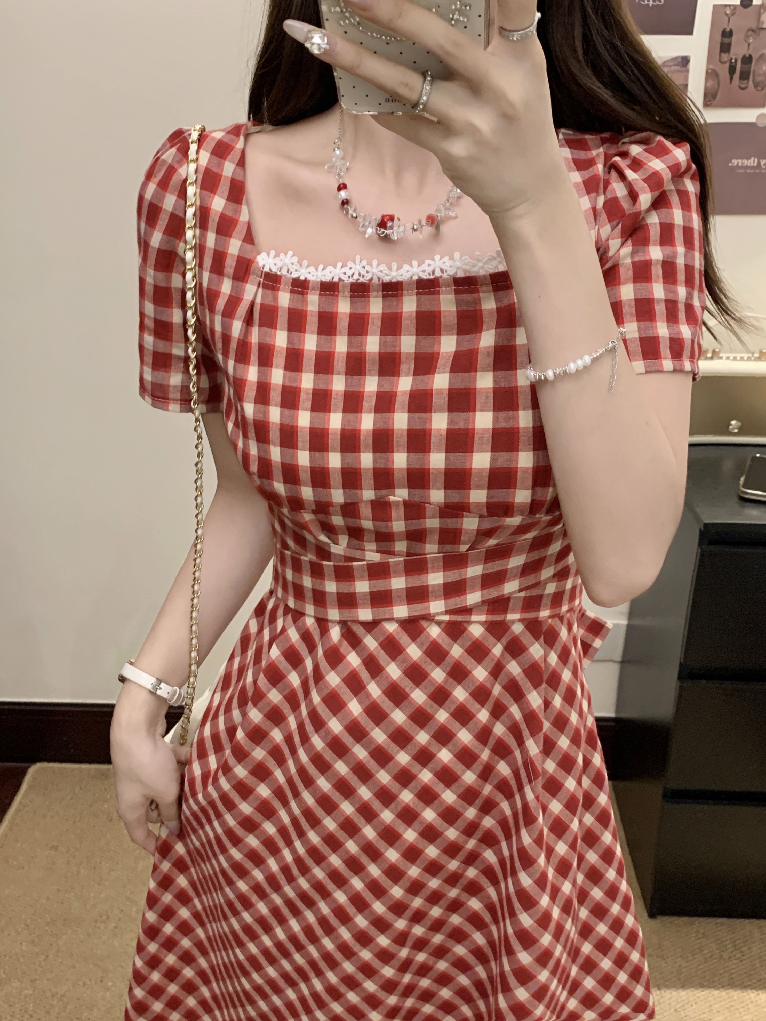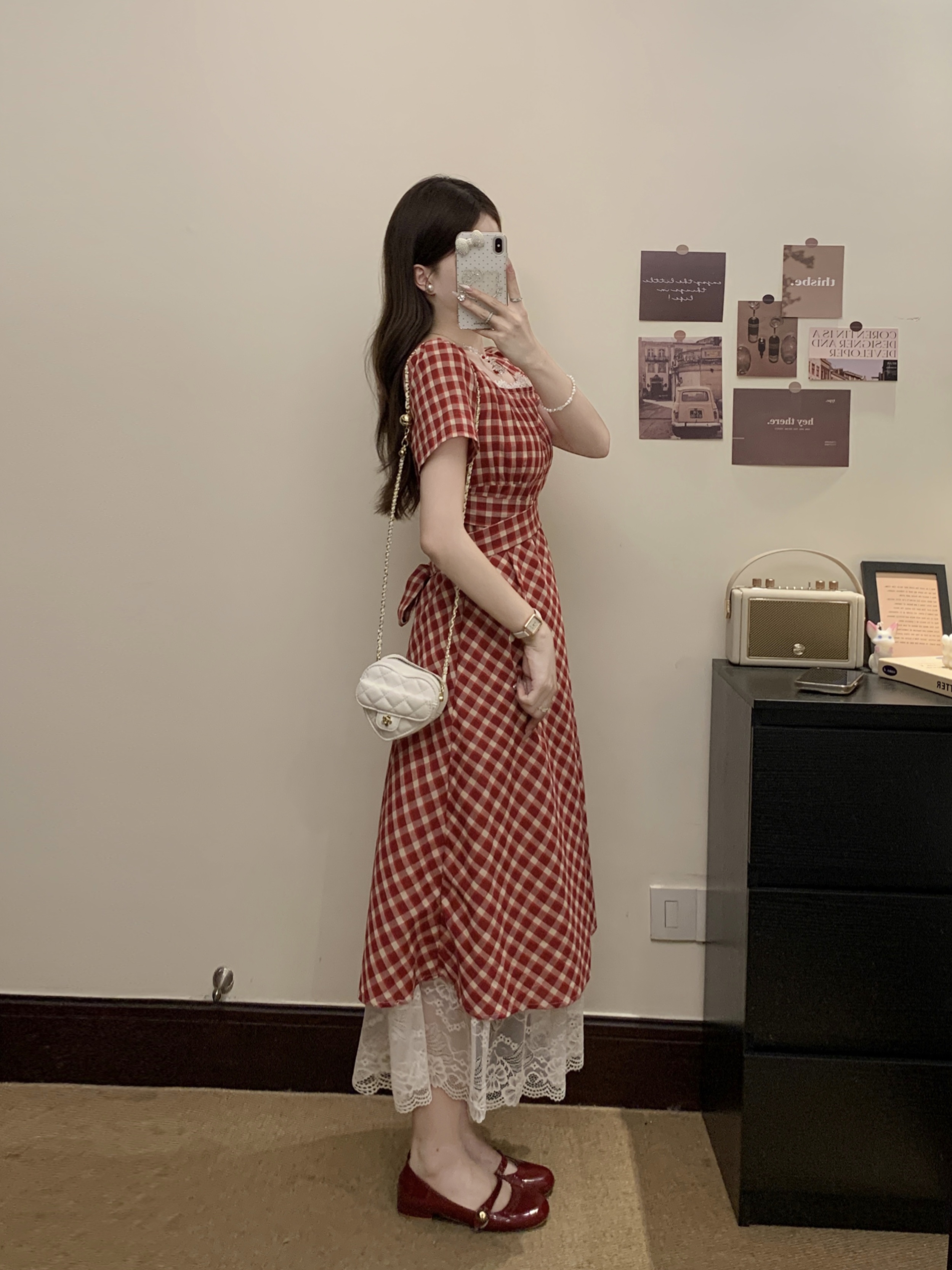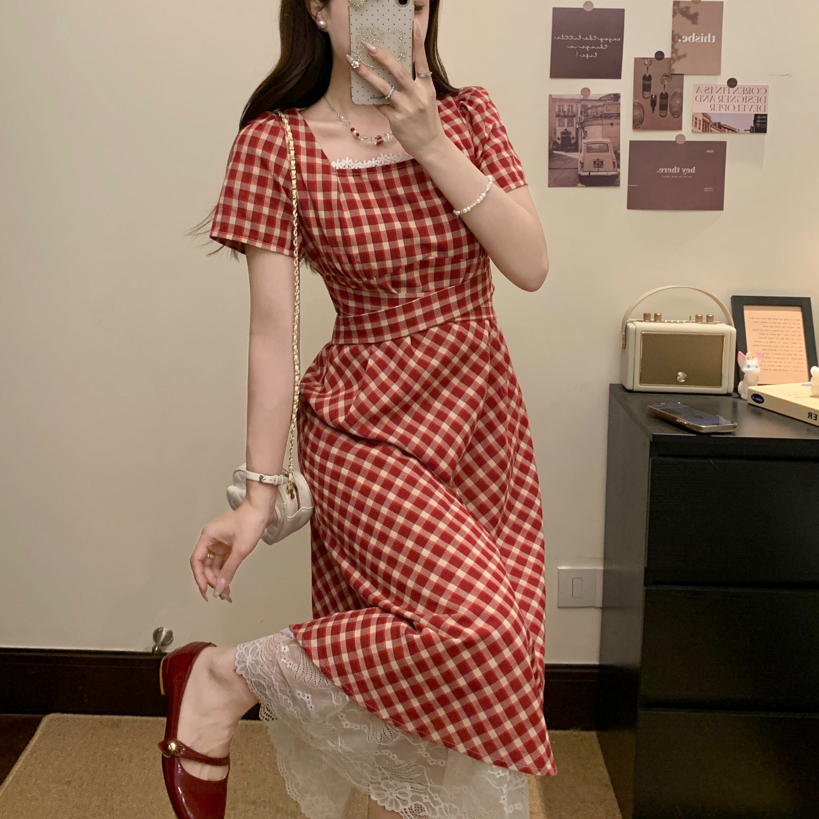 레트로 빨간색 체크무늬 반팔 드레스 여성 의류 2026 여름 새로운 레이스업 허리 수축 슬림해 보이는 a 단어 길이 치마