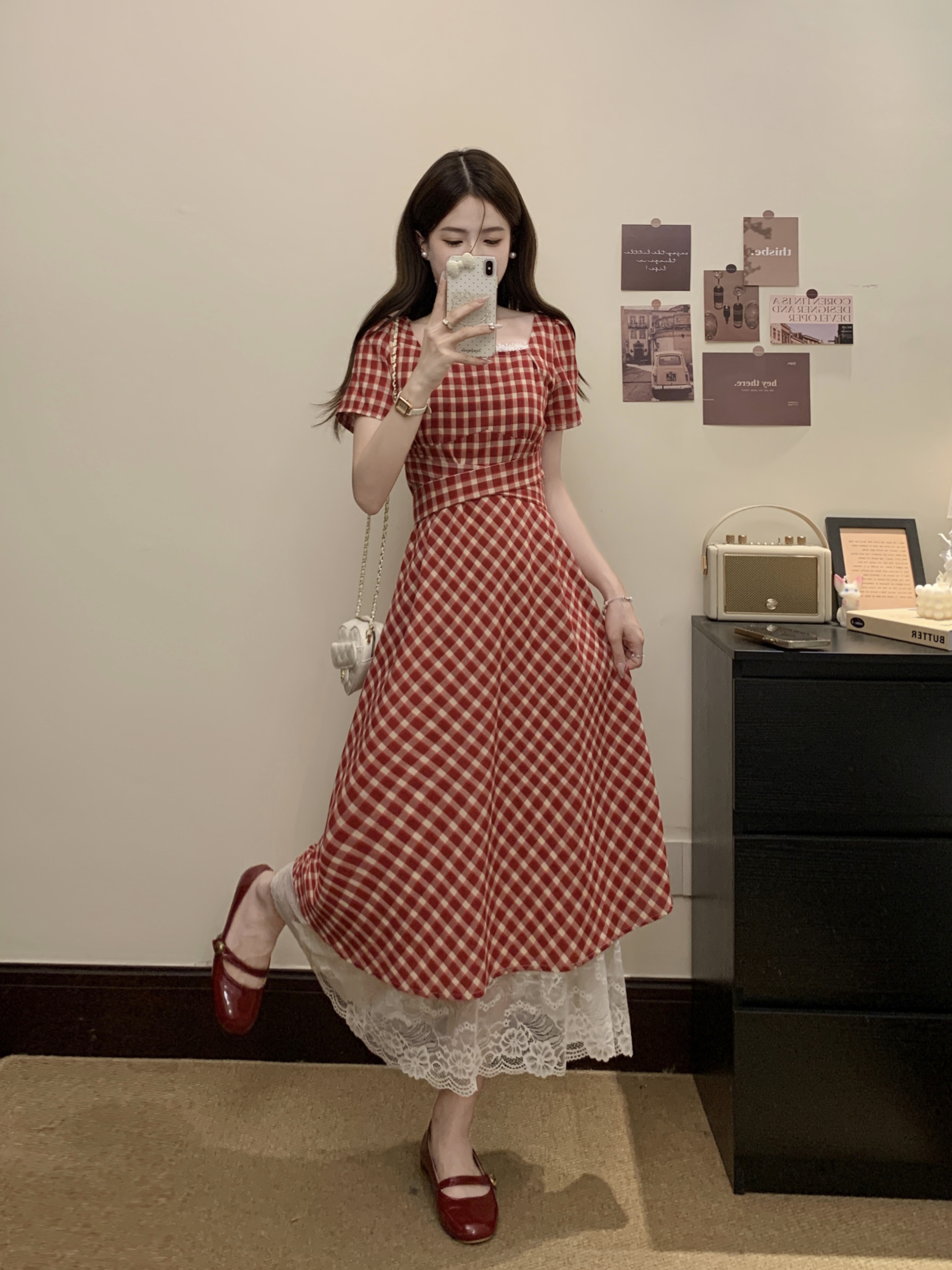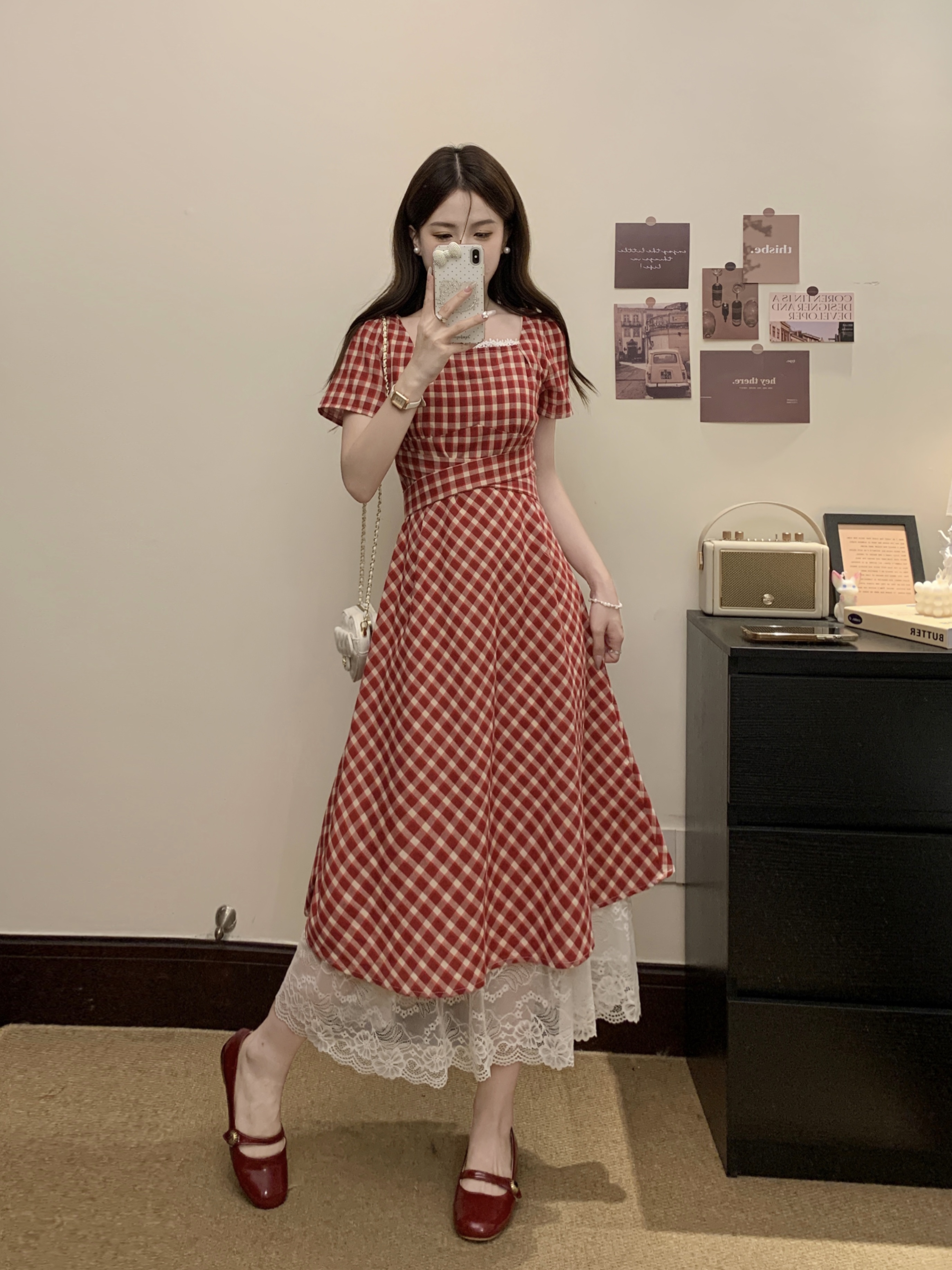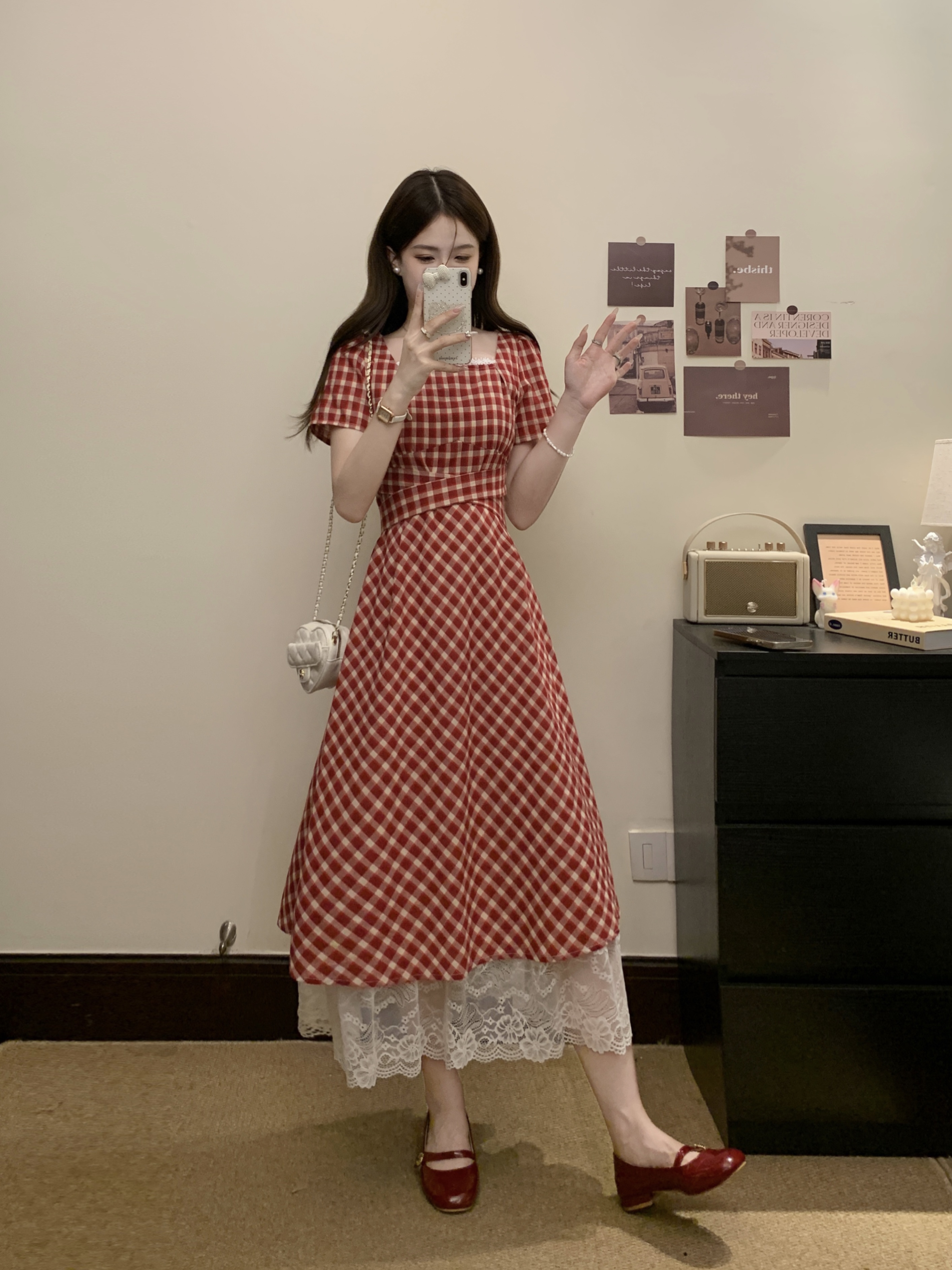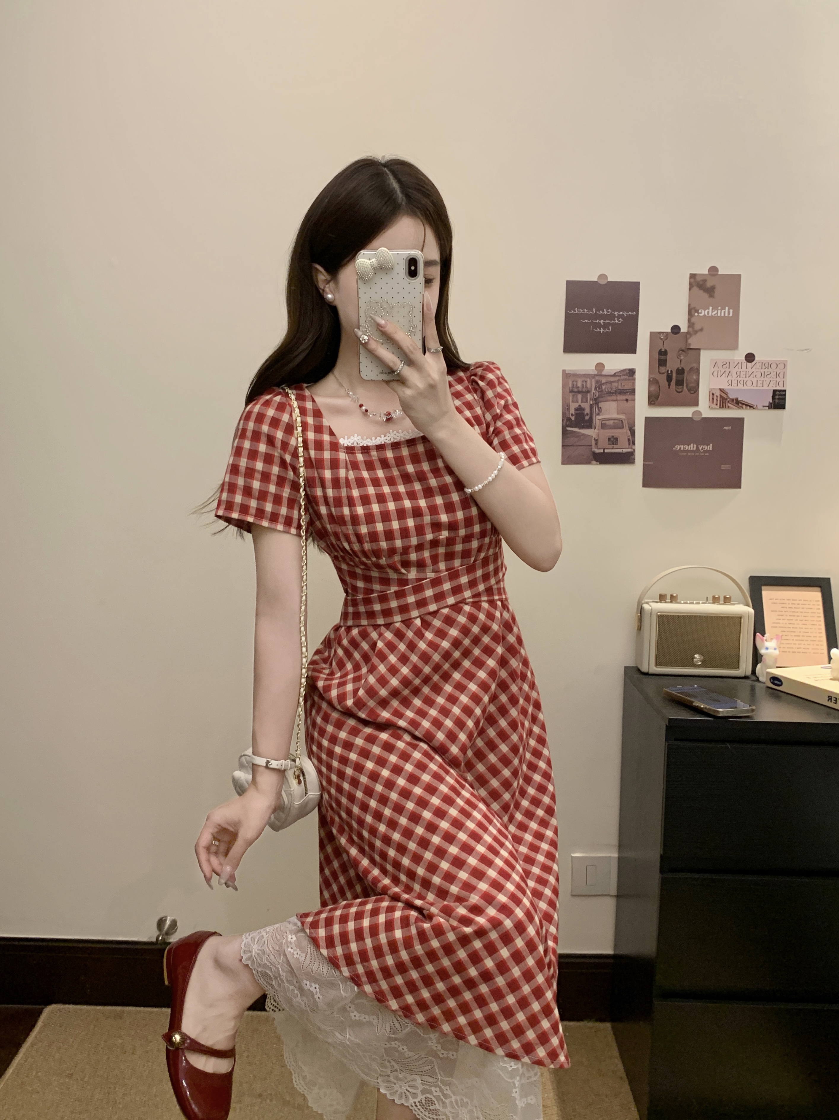 레트로 빨간색 체크무늬 반팔 드레스 여성 의류 2026 여름 새로운 레이스업 허리 수축 슬림해 보이는 a 단어 길이 치마