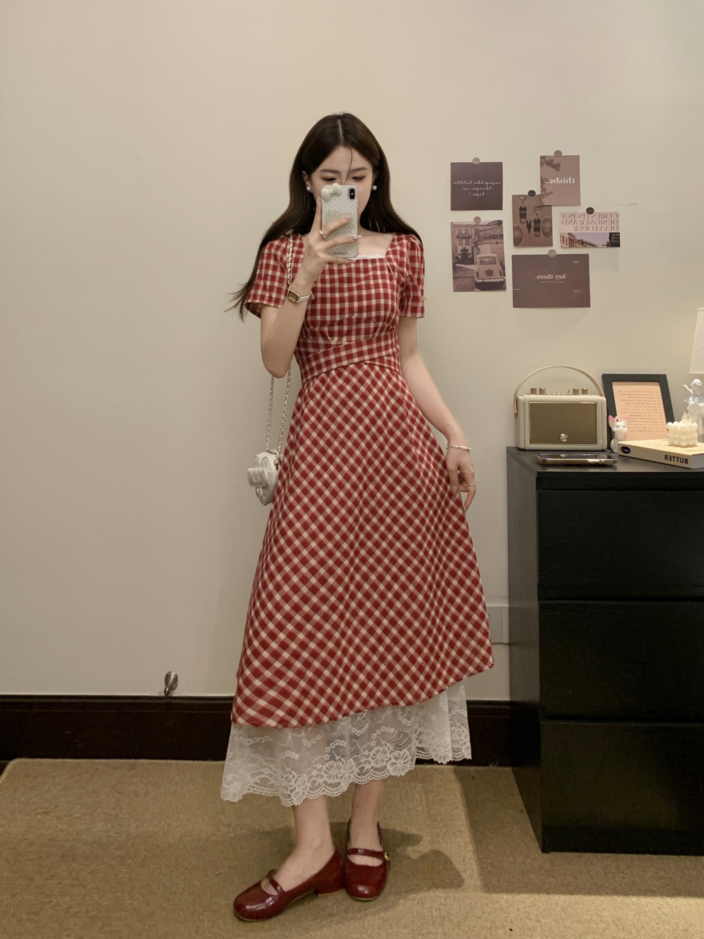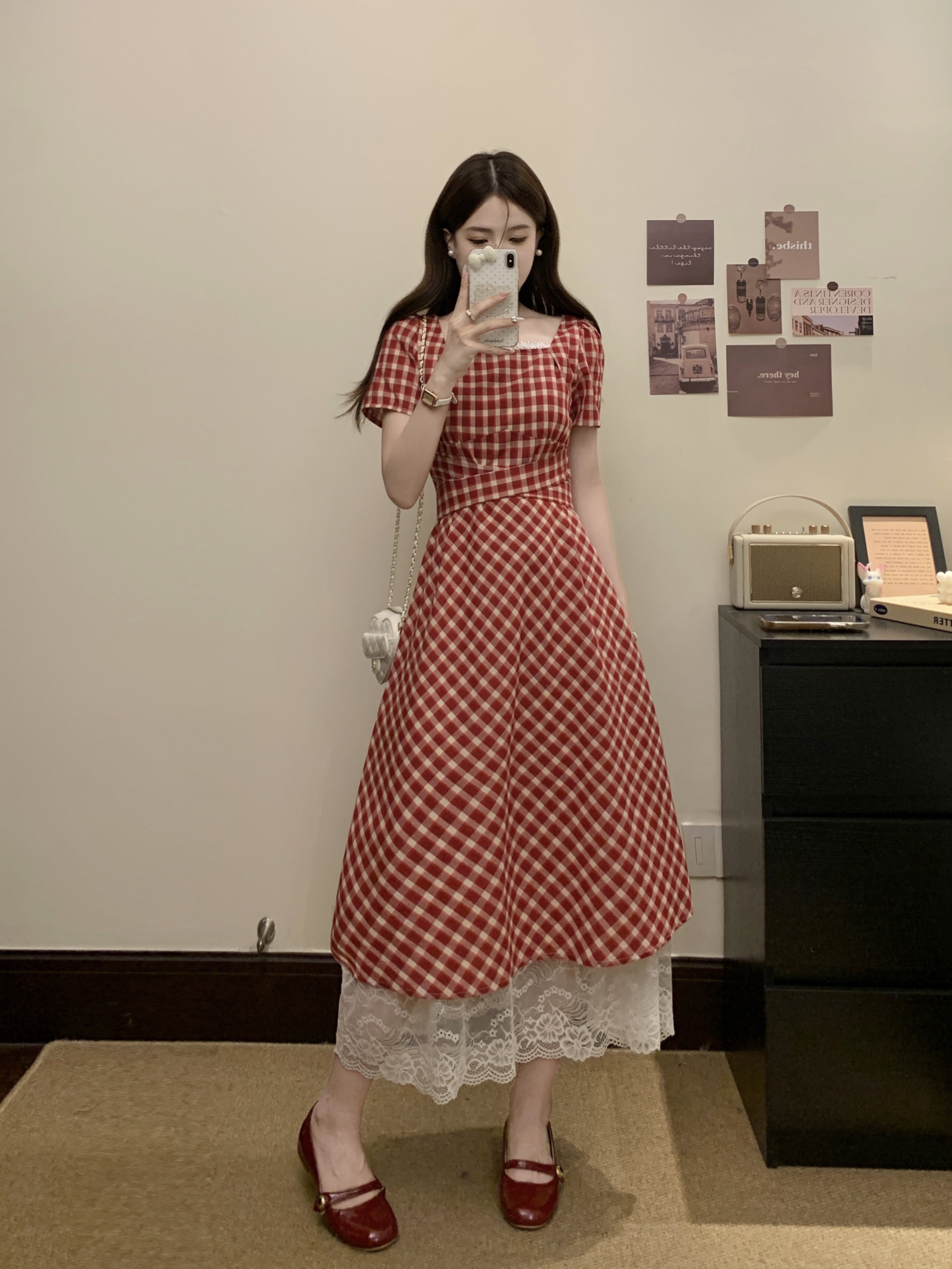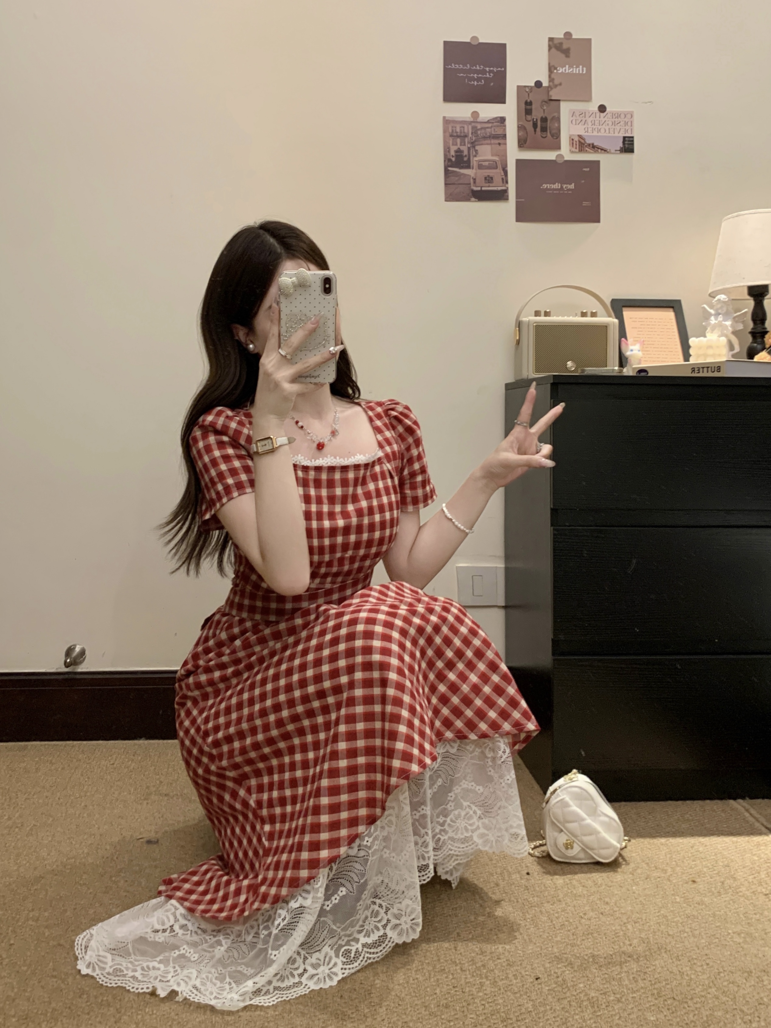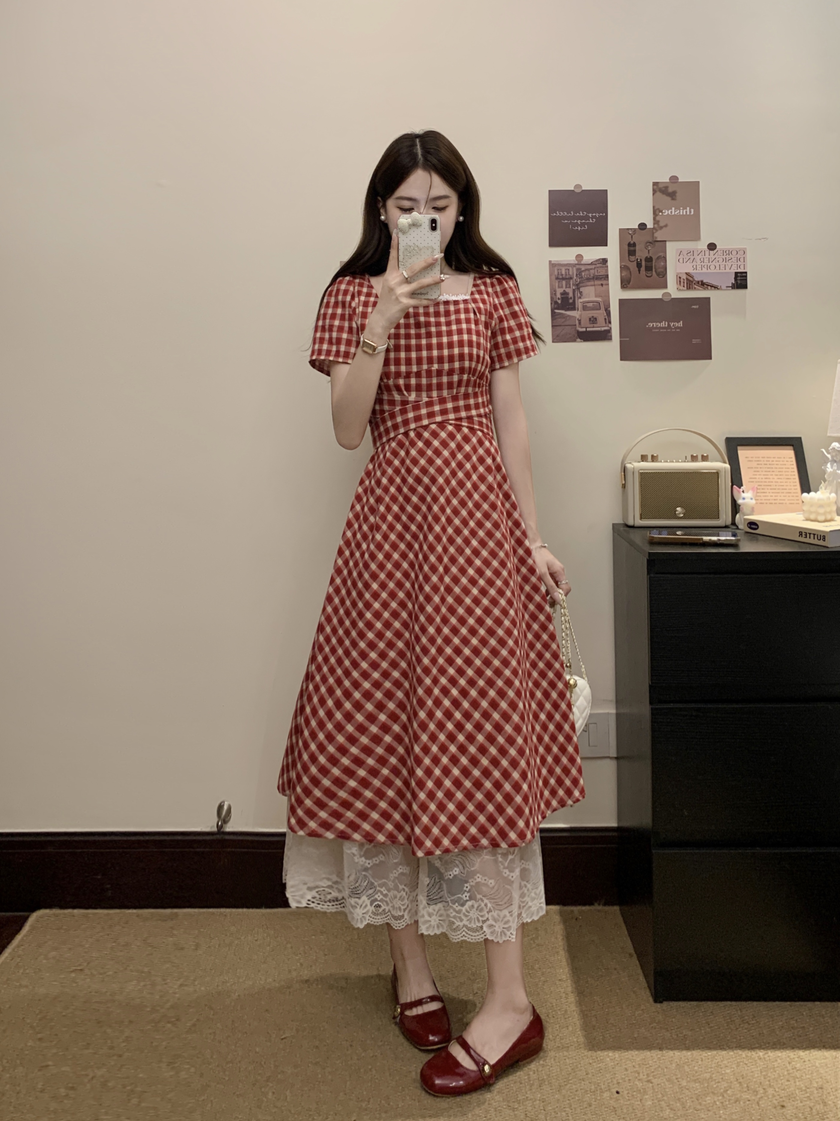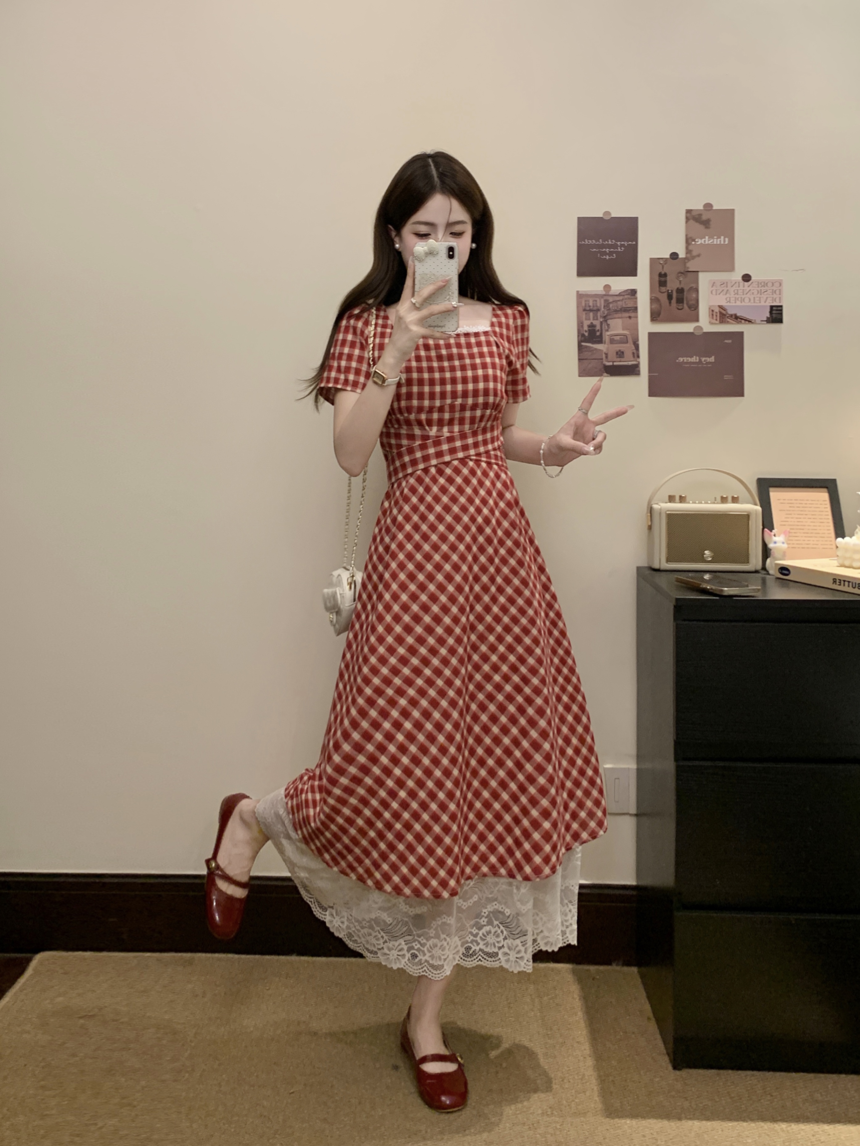 레트로 빨간색 체크무늬 반팔 드레스 여성 의류 2026 여름 새로운 레이스업 허리 수축 슬림해 보이는 a 단어 길이 치마