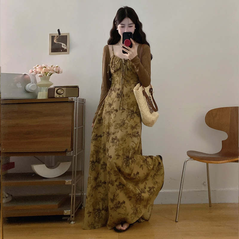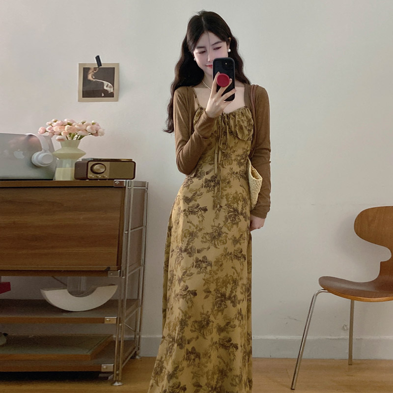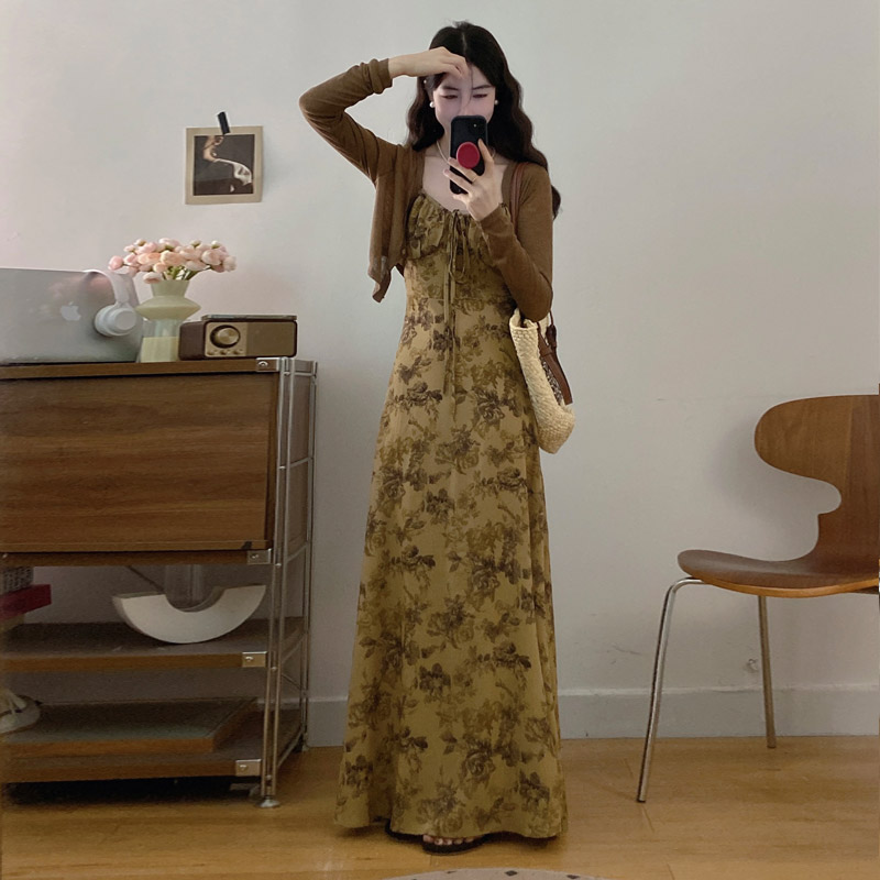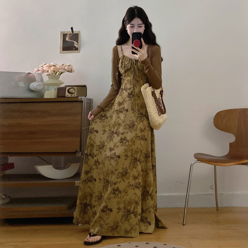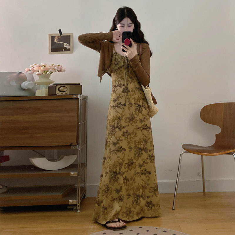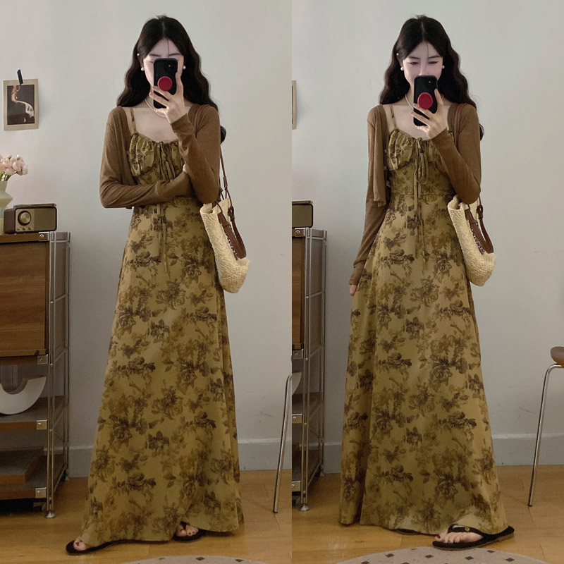 실사 봄 새로운 지방 m 프랑스식 레트로 수묵화 프린트 슬림해 보이는 슬립 드레스 니트 맨위 투피스 세트