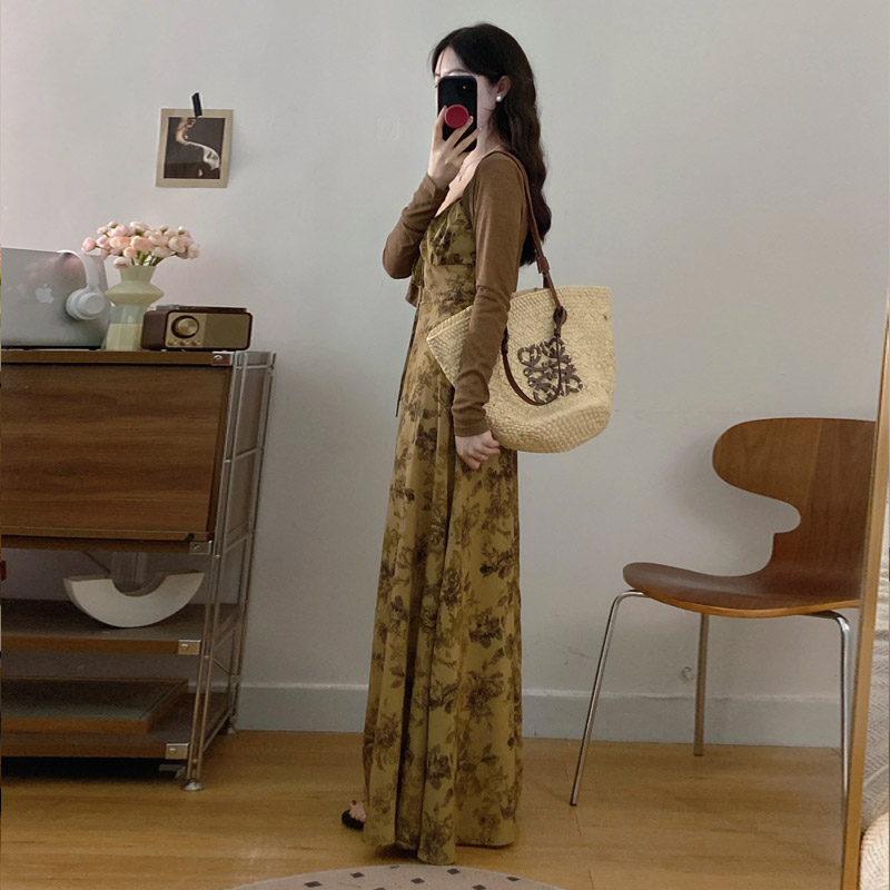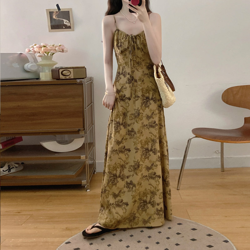 실사 봄 새로운 프랑스식 레트로 수묵화 프린트 슬림해 보이는 슬립 드레스 품격 숙녀 슬림해 보이는 롱 스커트