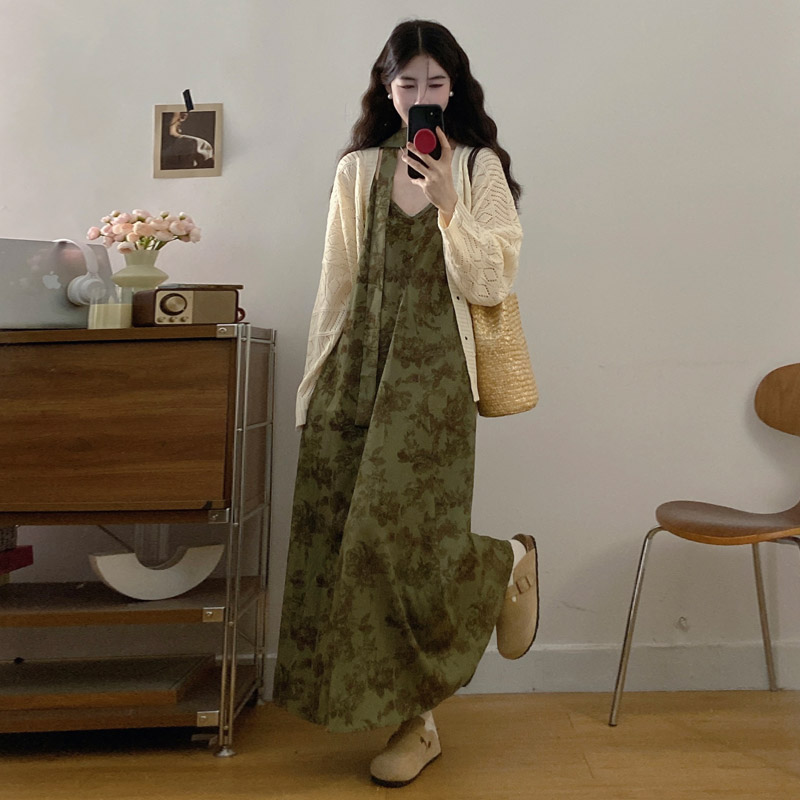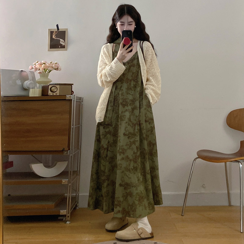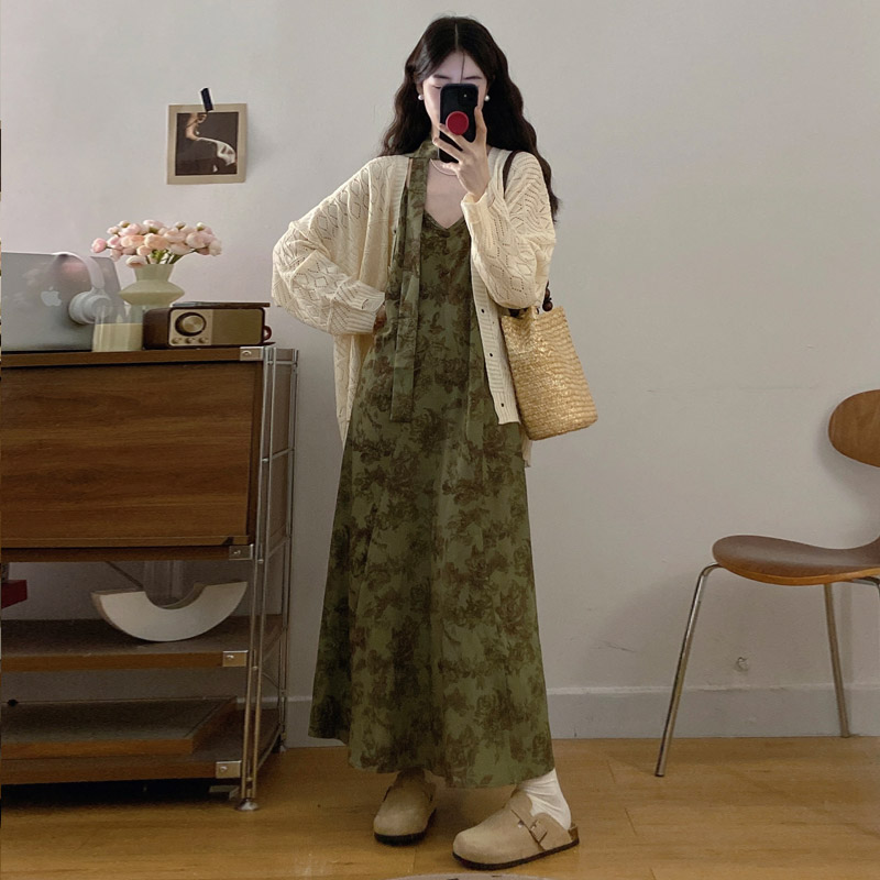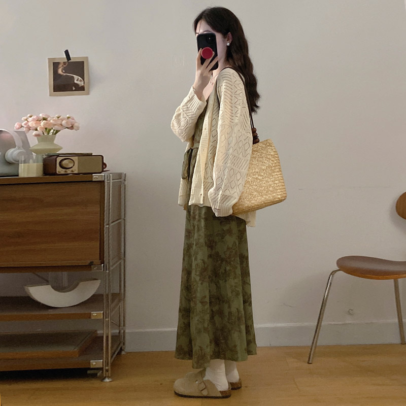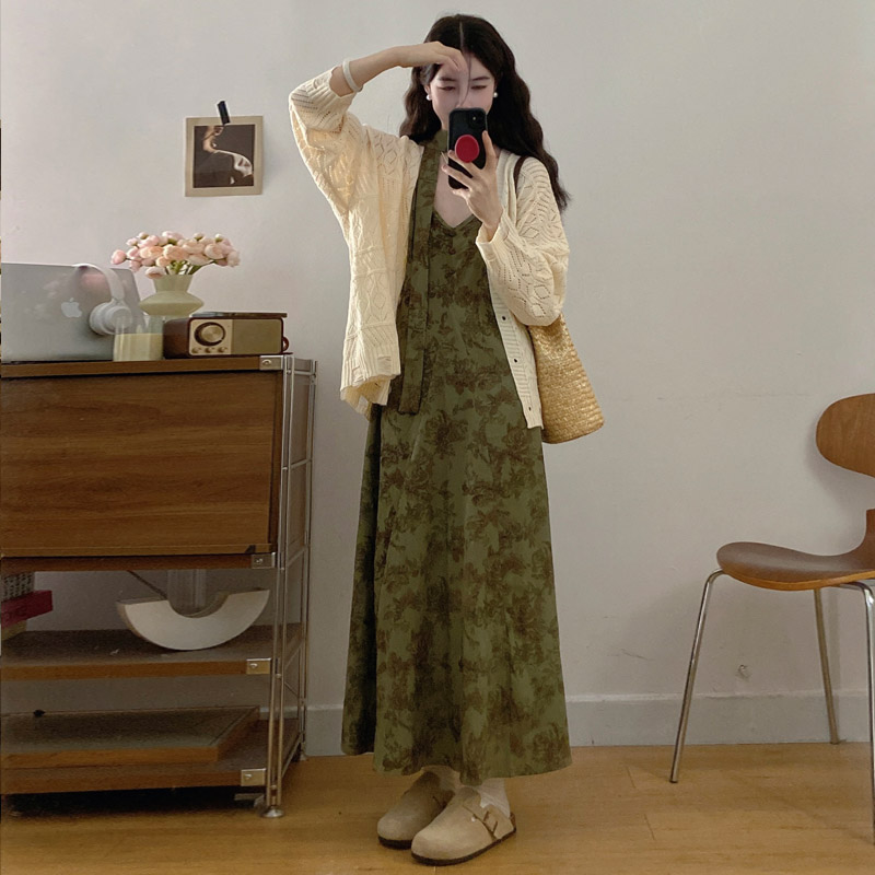 실사 봄 새로운 지방 m 프랑스식 레트로 수묵화 프린트 슬림해 보이는 슬립 드레스 니트 맨위 투피스 세트