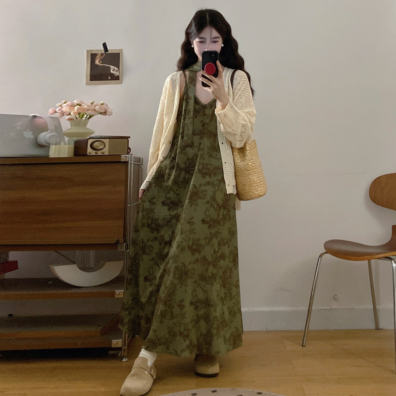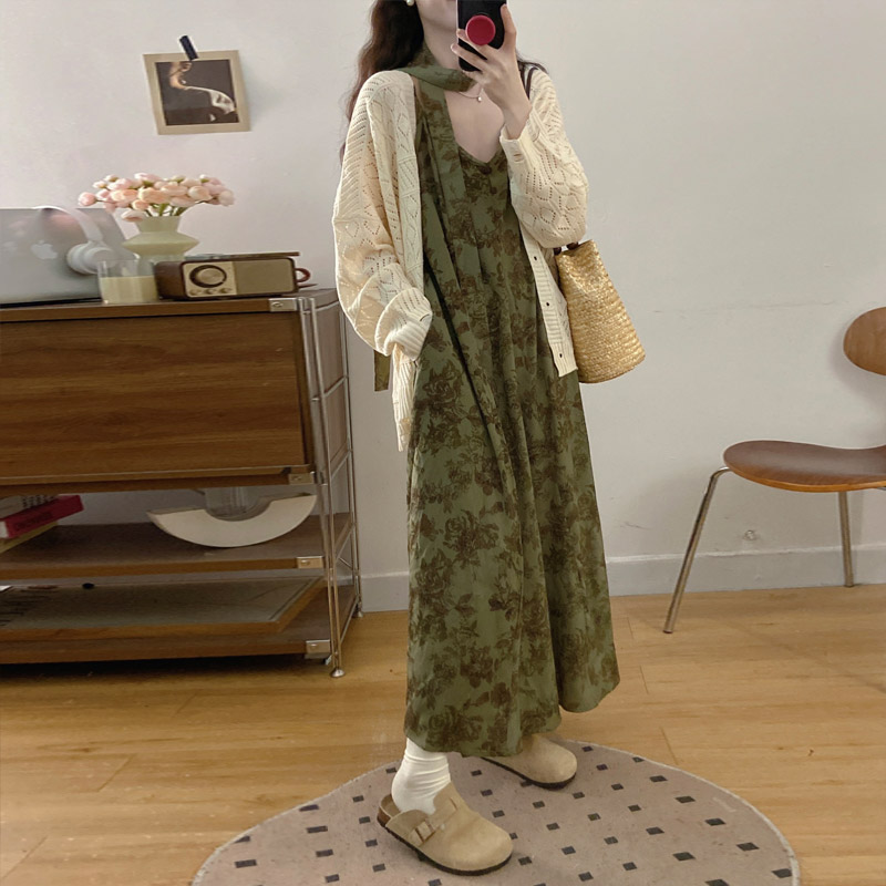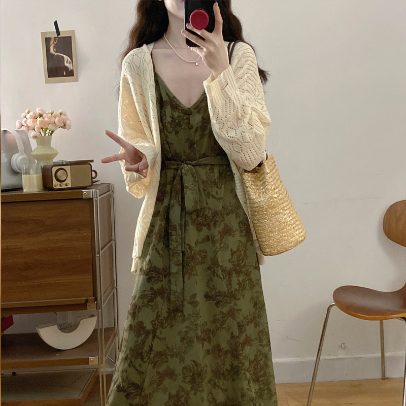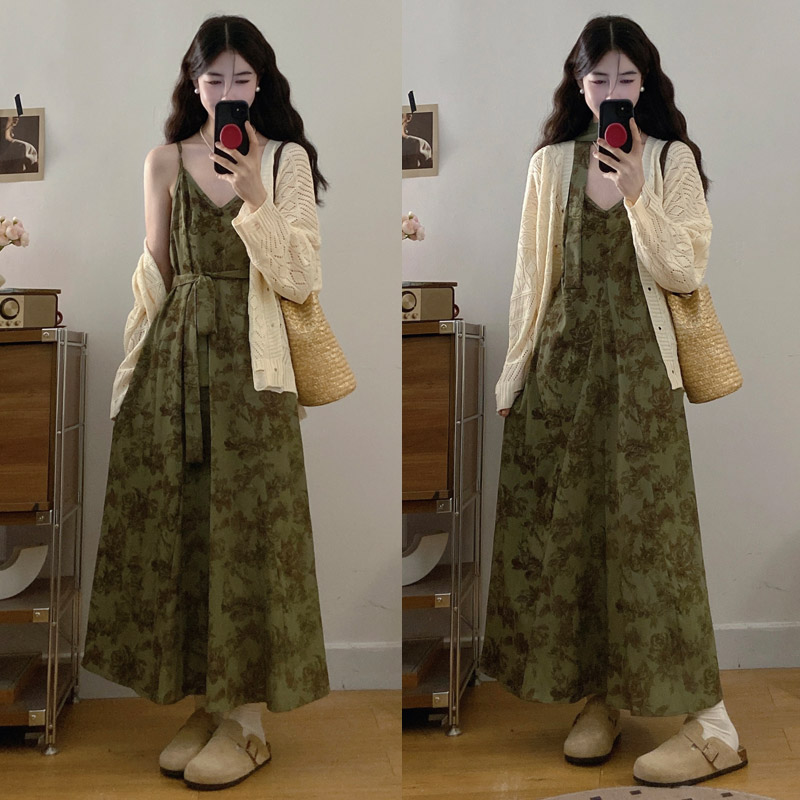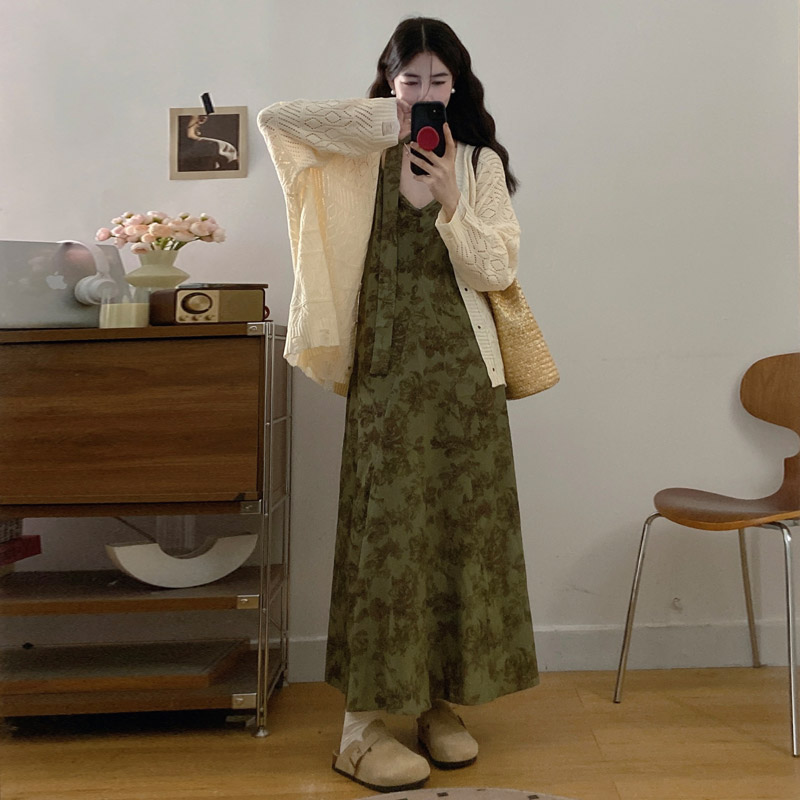 실사 봄 새로운 지방 m 프랑스식 레트로 수묵화 프린트 슬림해 보이는 슬립 드레스 니트 맨위 투피스 세트