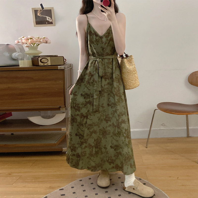 실사 봄 새로운 프랑스식 레트로 수묵화 프린트 슬림해 보이는 슬립 드레스 품격 숙녀 슬림해 보이는 롱 스커트