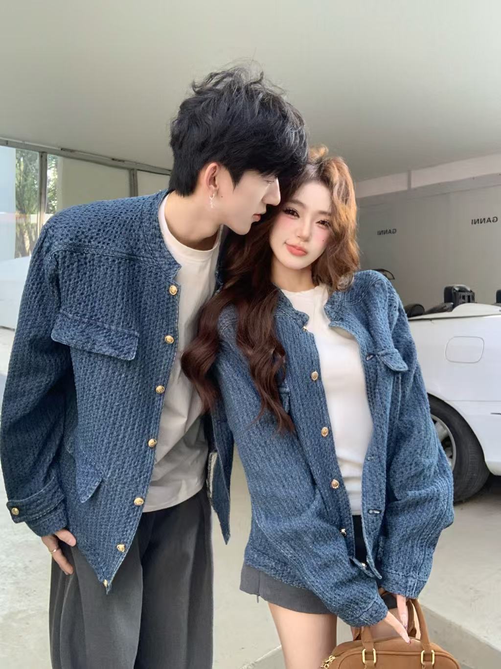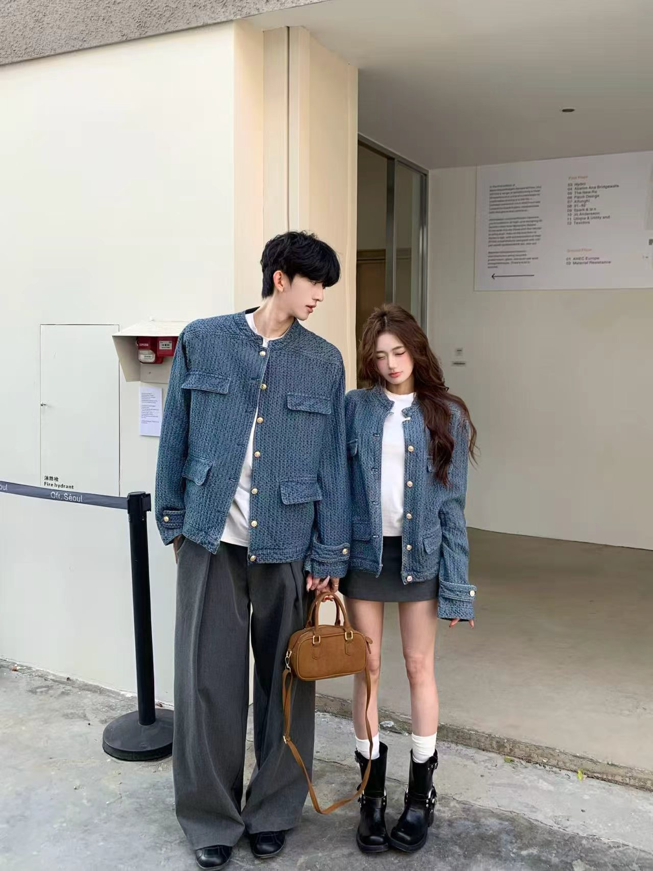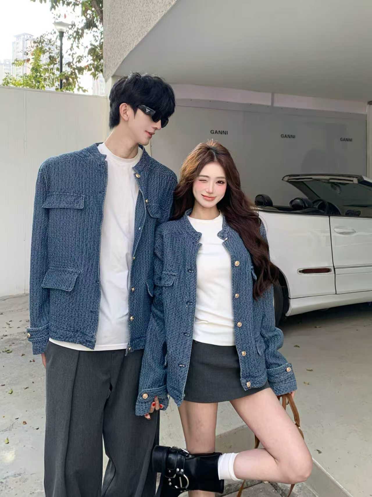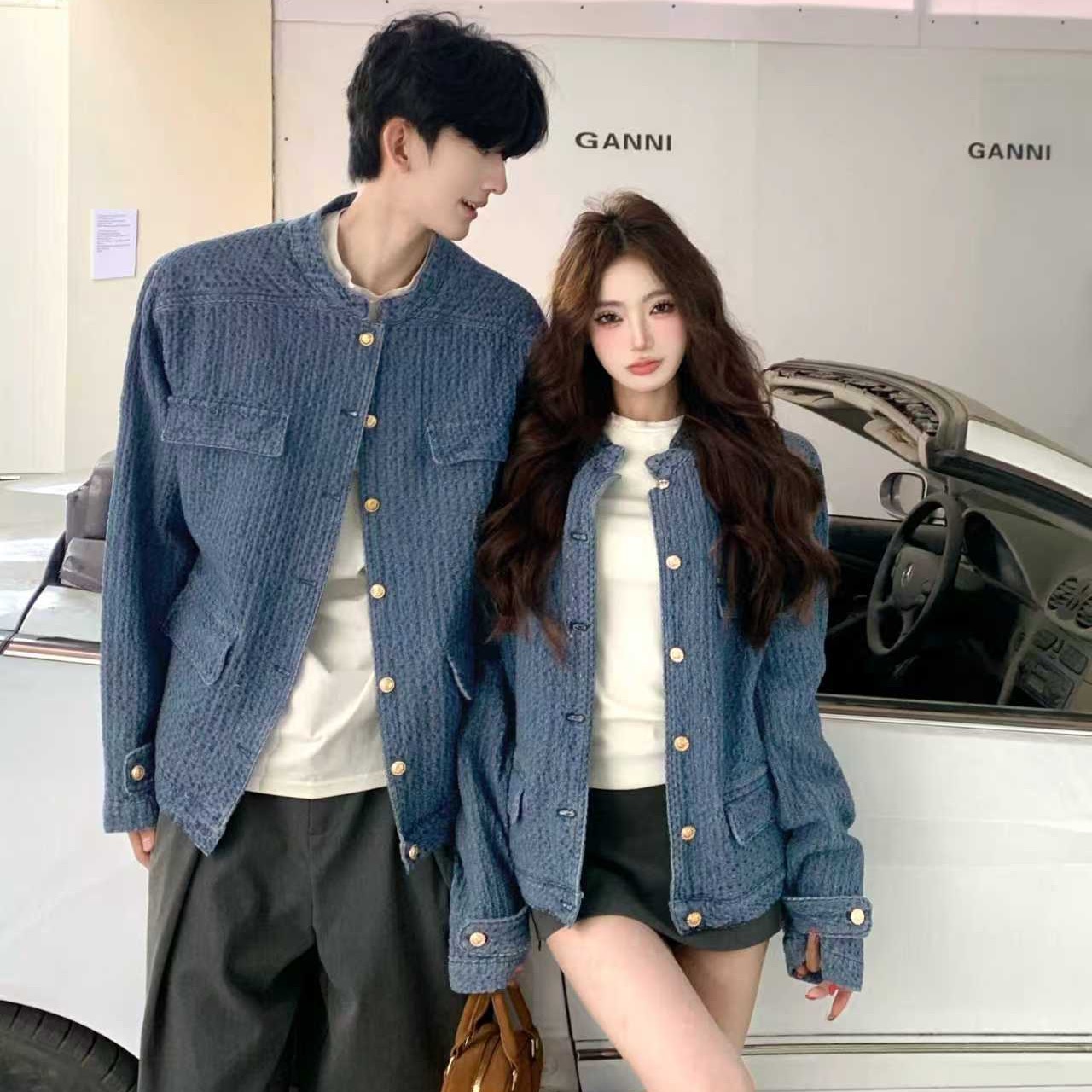 실사 고급 센스 품격 작은 샤넬 스타일 데님 여성 코트 봄 스탠드 칼라 재킷 맨위 커플룩 재킷