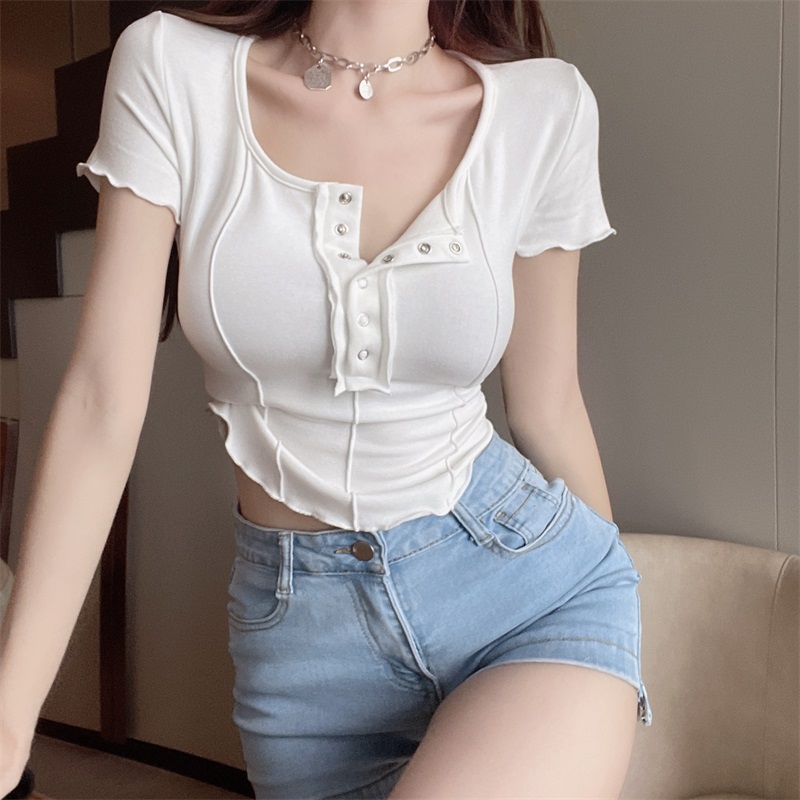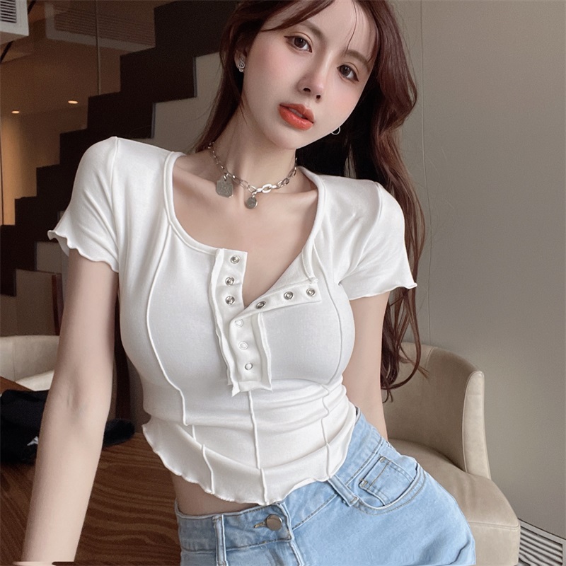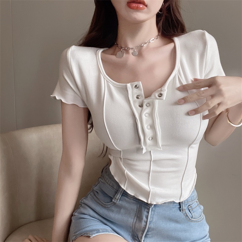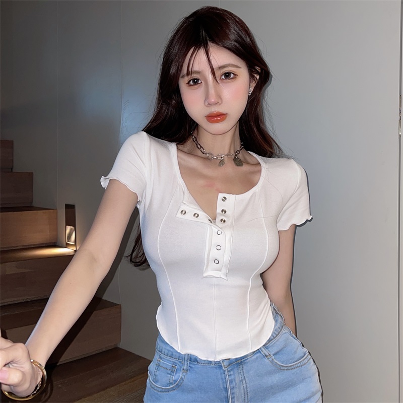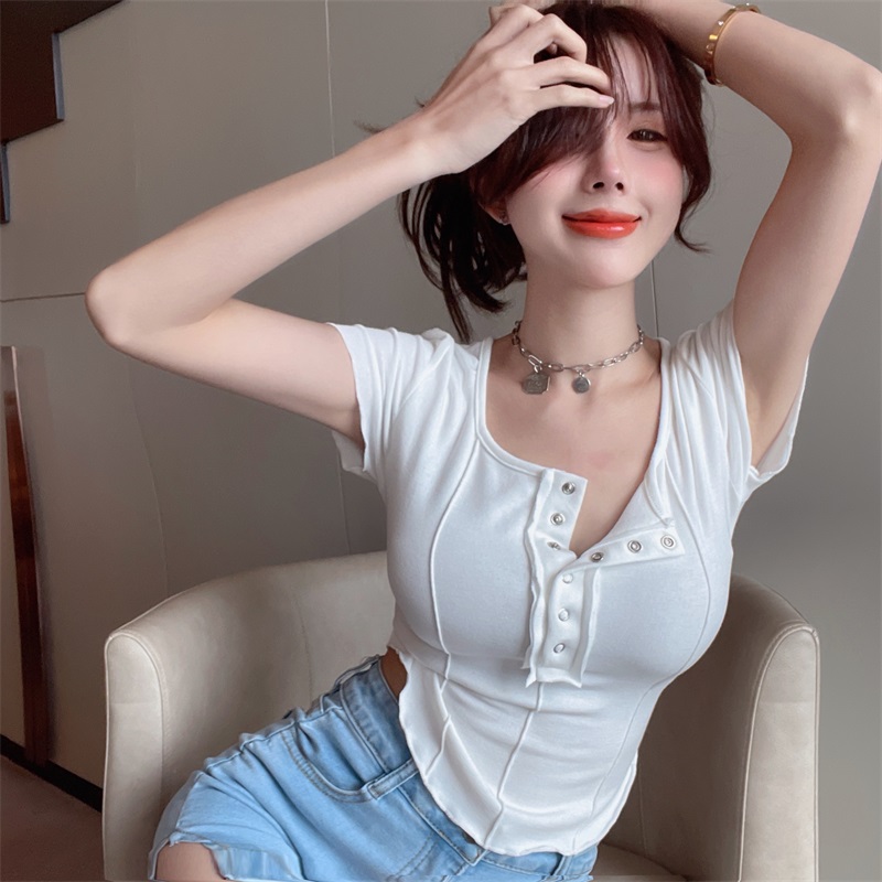 실사 정가 감소되지 않음 티셔츠 여성 의류 디자인 센스 작은 대중 불규칙 광장 칼라 타이트 쇼트 스타일 반팔 맨위