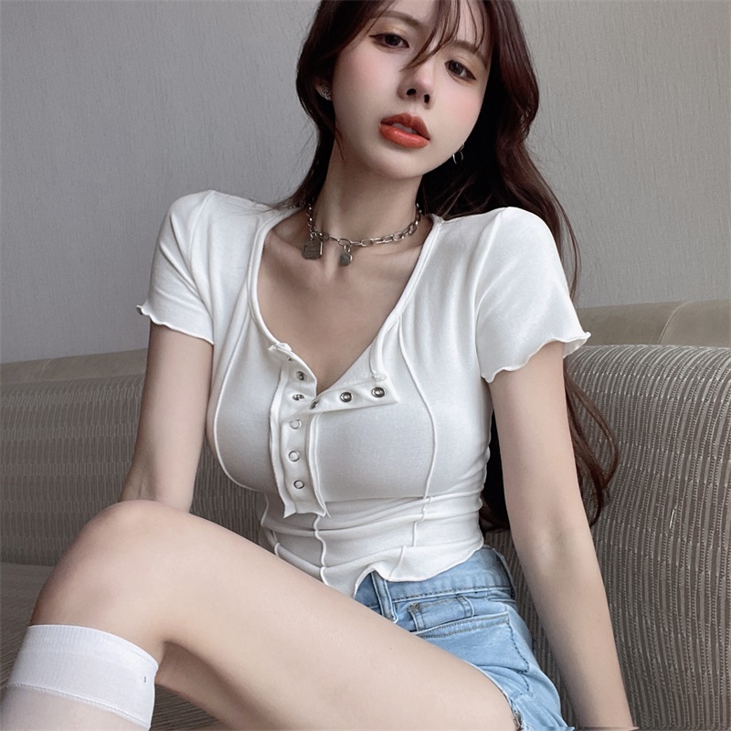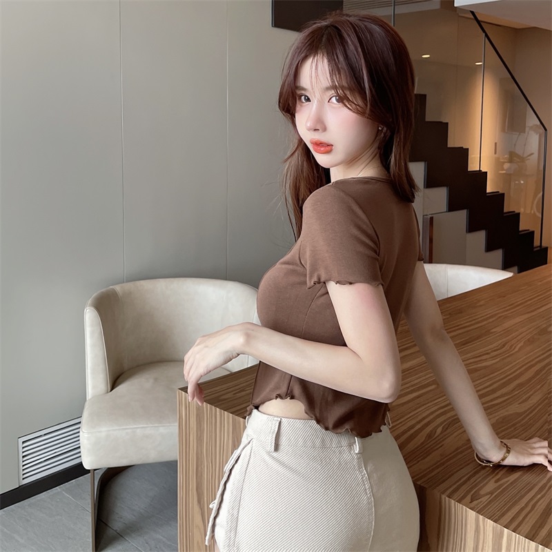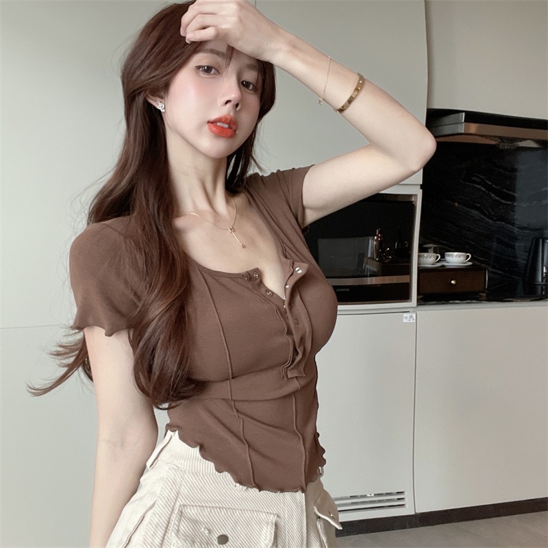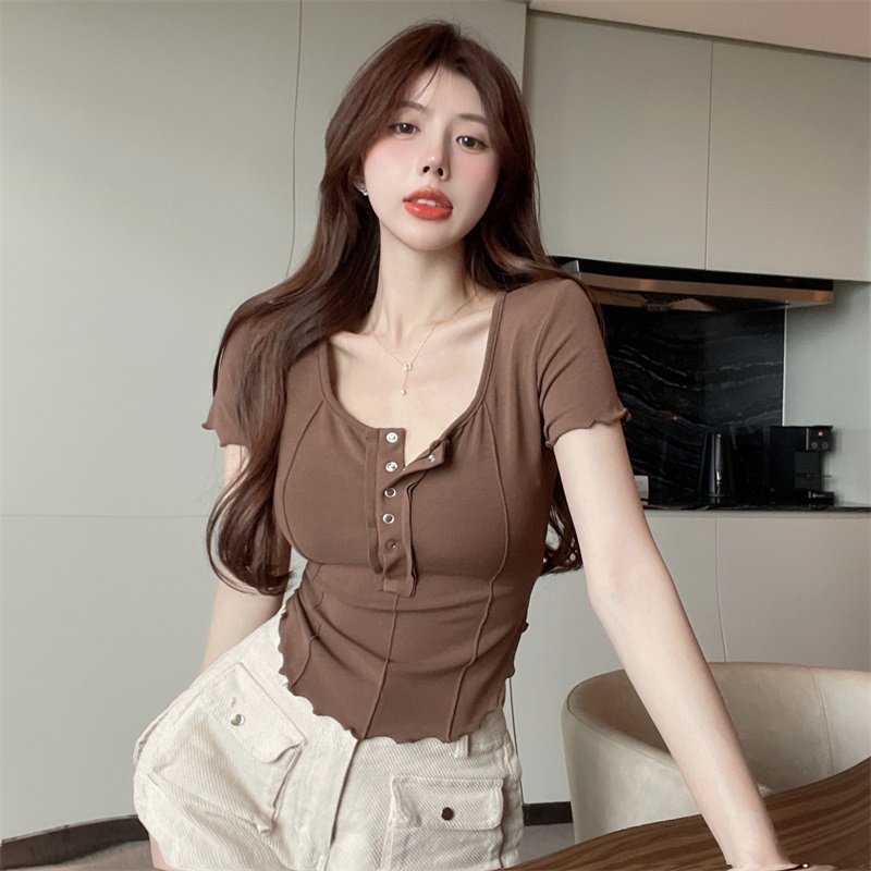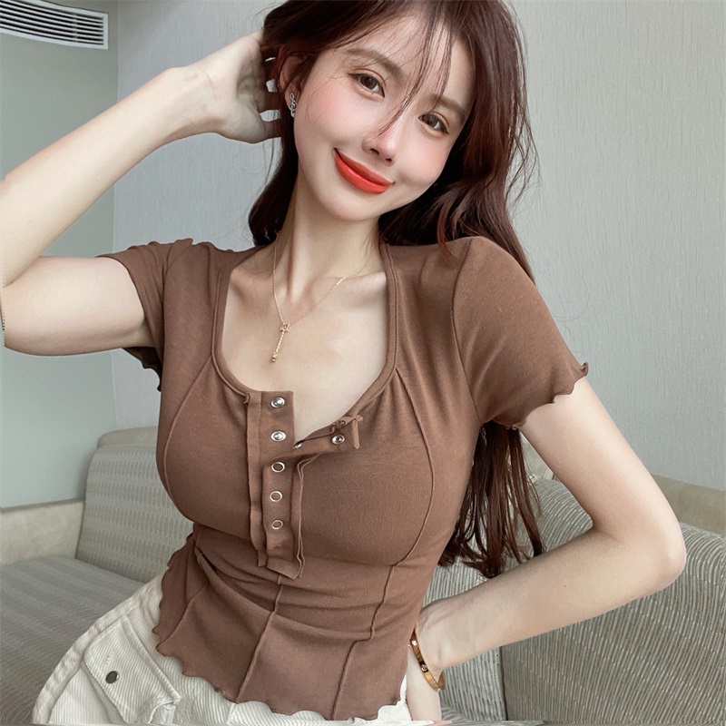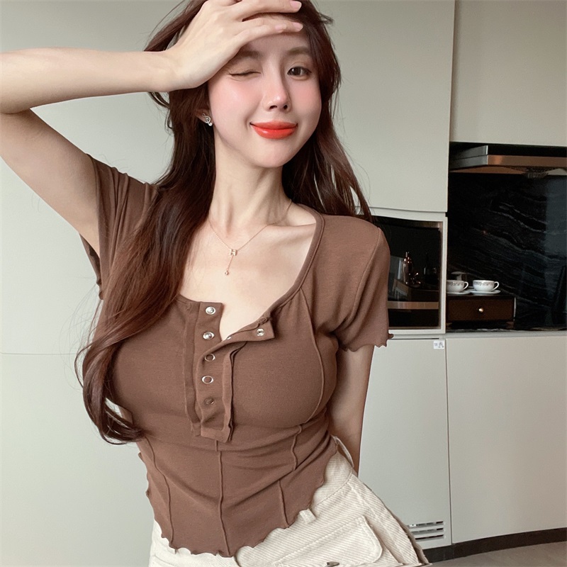 실사 정가 감소되지 않음 티셔츠 여성 의류 디자인 센스 작은 대중 불규칙 광장 칼라 타이트 쇼트 스타일 반팔 맨위