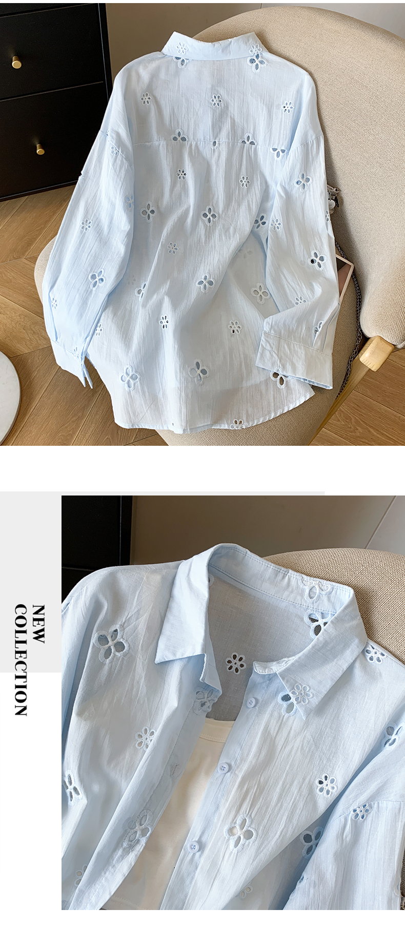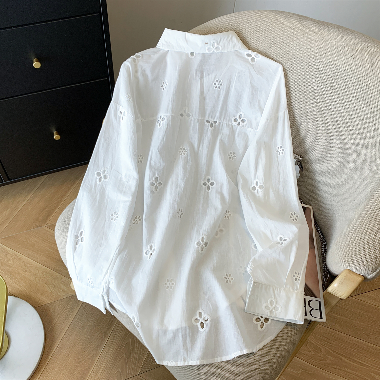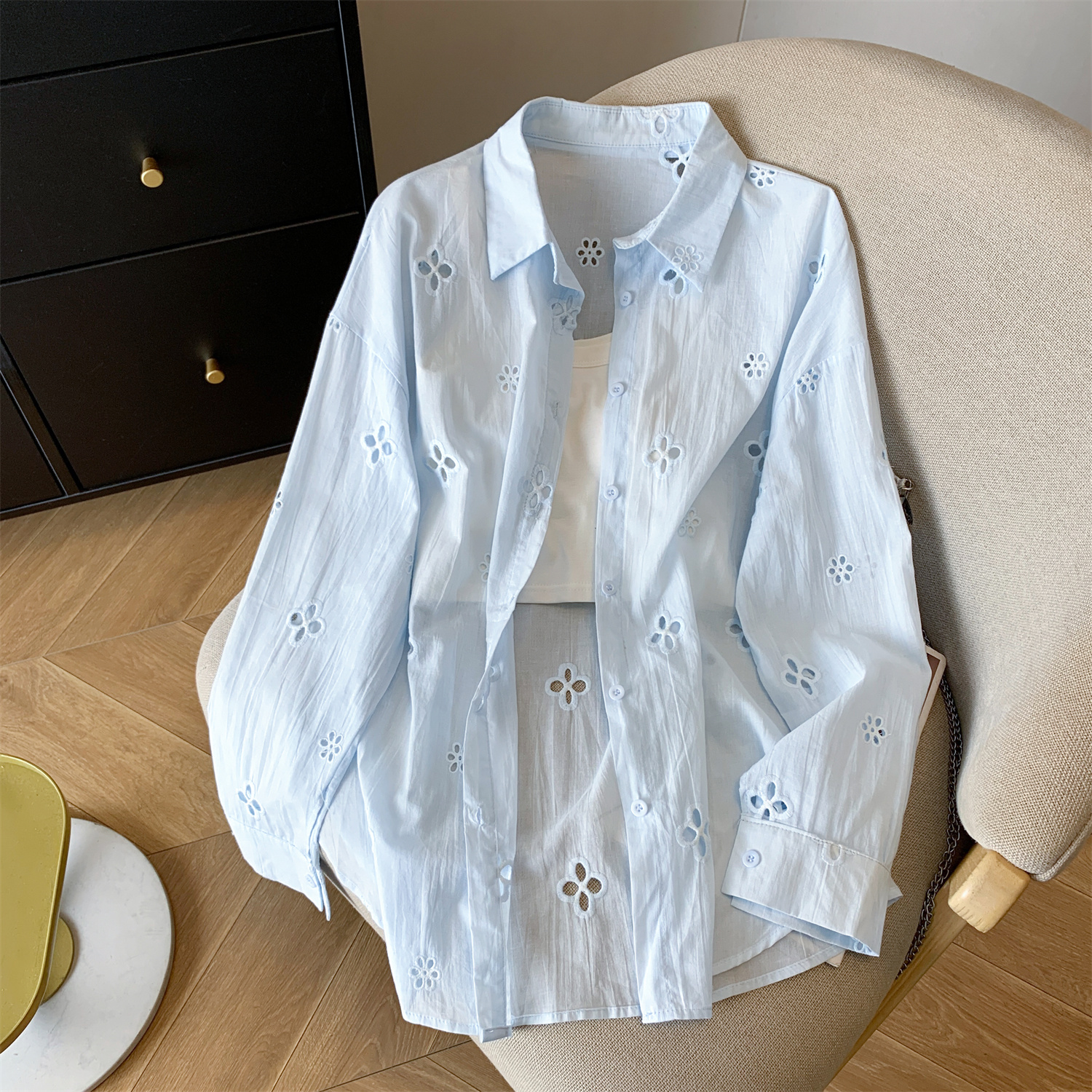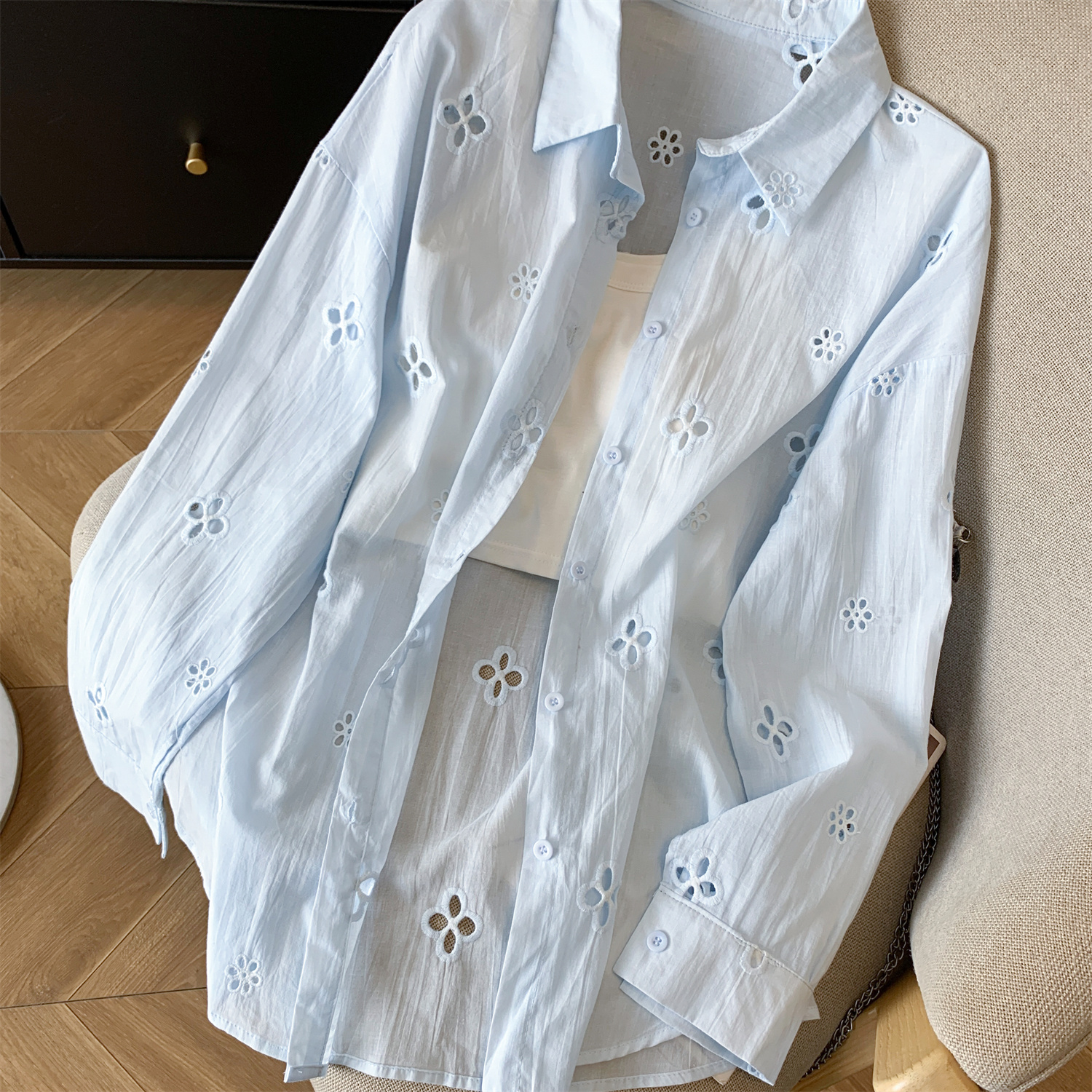 봄 아모이 레이스 자수 얇은 스타일 긴팔 자외선 차단 의류 에어컨 셔츠 맨위 루즈핏 슬림해 보이는 다용도 셔츠 짧은 외투
