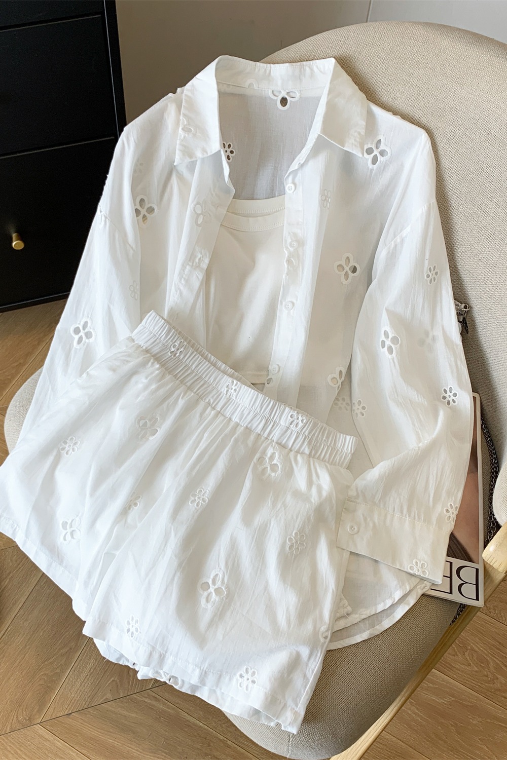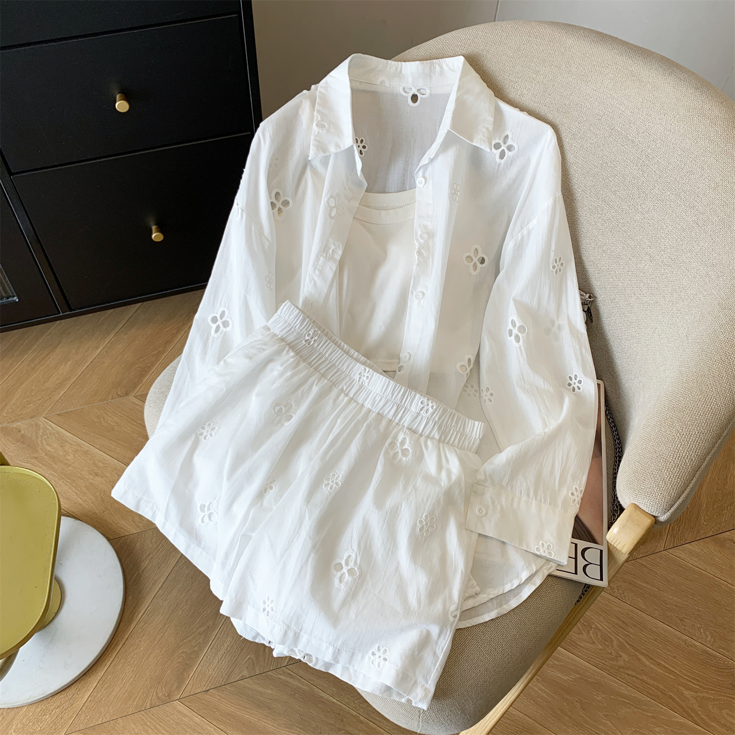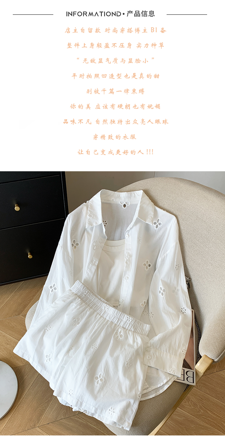 여름 미니멀리즘 출퇴근 긴팔 자외선 차단 맨위 재킷 슬립 반바지 세 조각 패션 세트 여성
