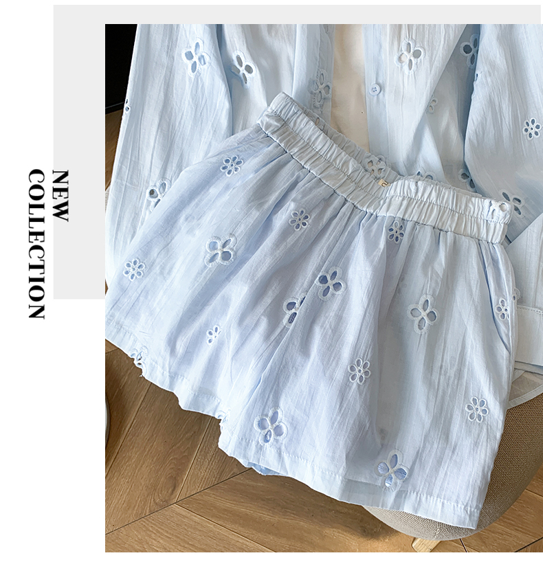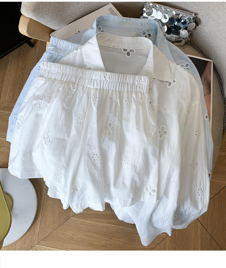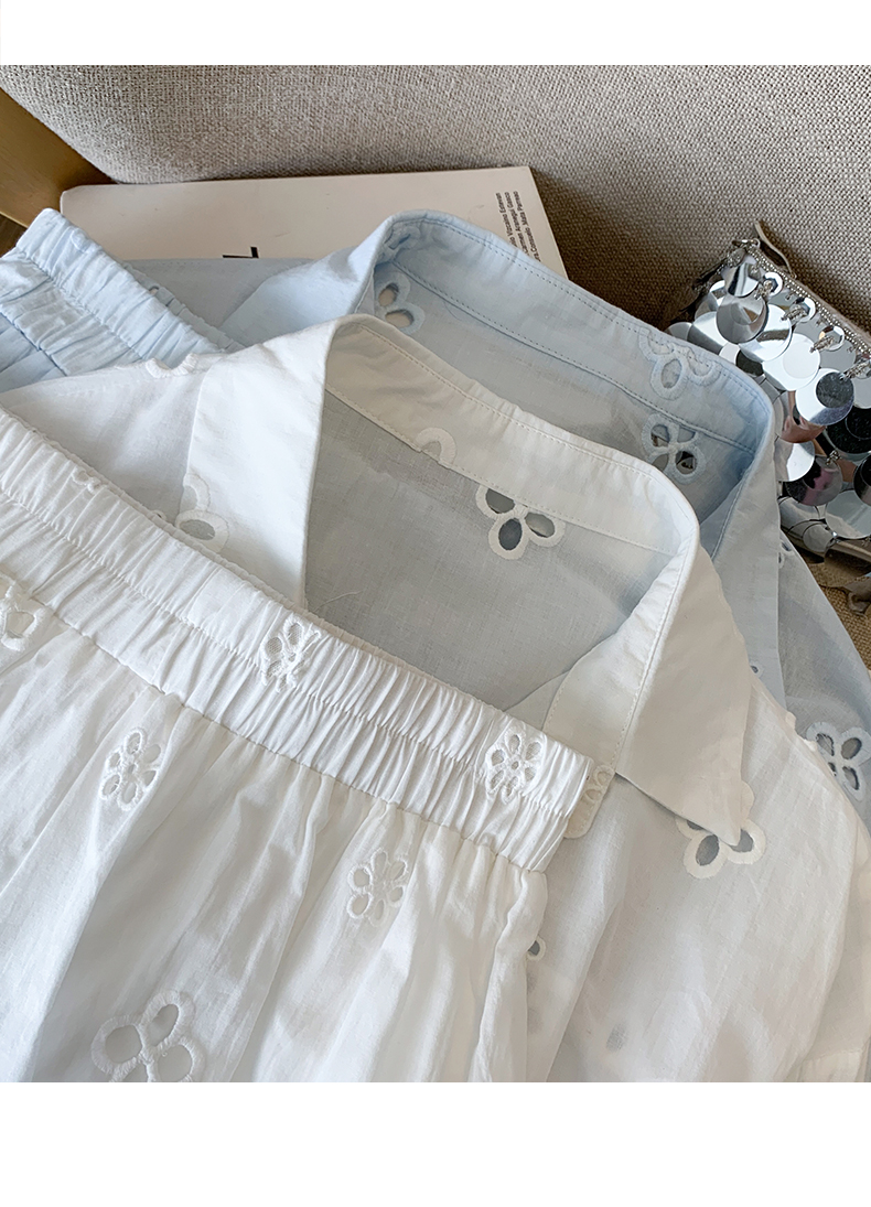 봄 여름 순수한 욕망 프랑스식 레이스 조각 화이트 V넥 진주 허리 수축 셔츠 하이웨이스트 반바지 투피스 슈트 여성