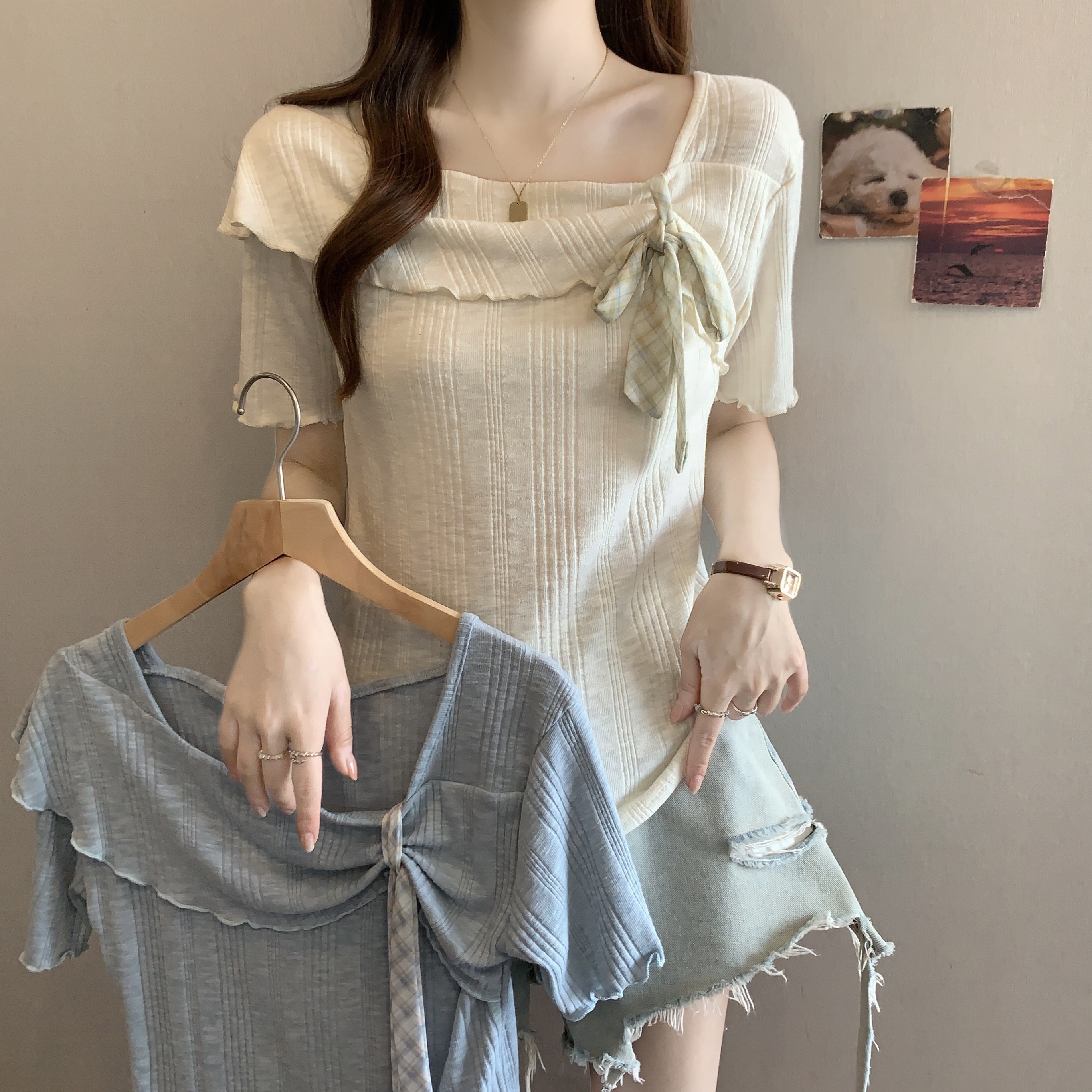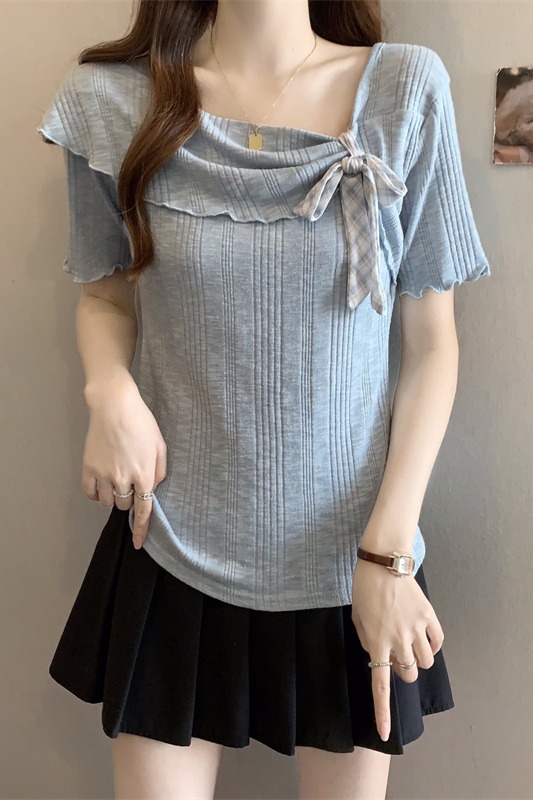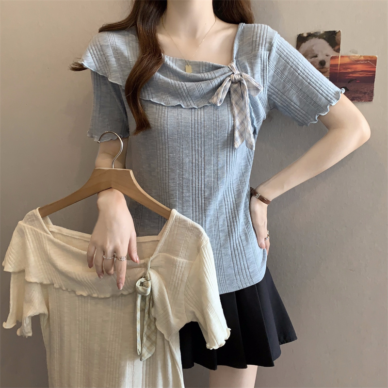 실사 마이크로 지방 mm 순수한 욕망 바람 셔츠 V넥 레이스 나비 매듭 핫걸 반팔 작은 셔츠 맨위 티셔츠