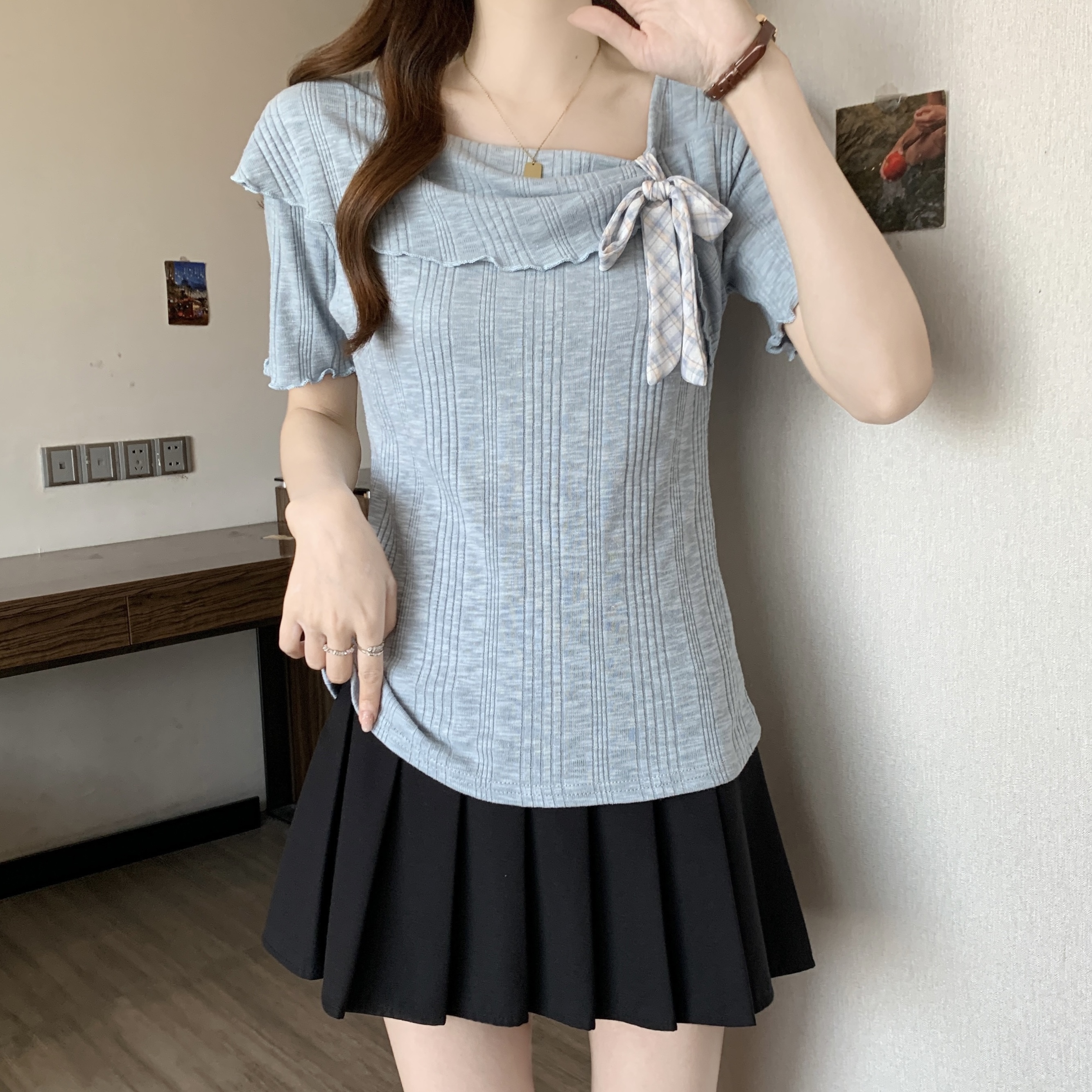 4.13 신제품 westayone 후아 남편 그리드 니트 비스듬한 어깨 반팔 티셔츠 여성 레저 세트 와이드 레그 팬츠